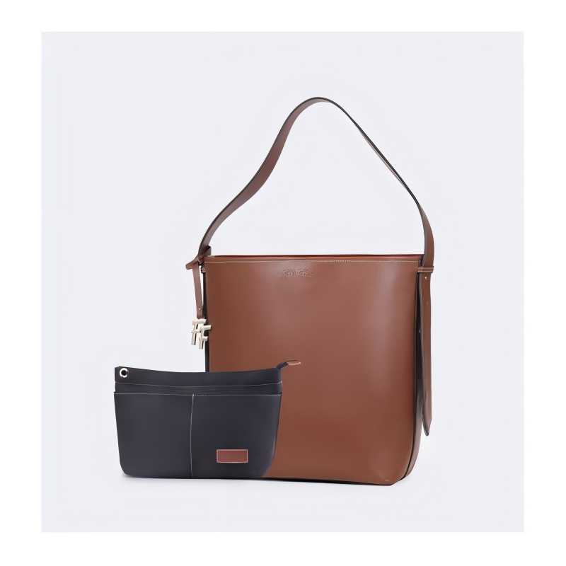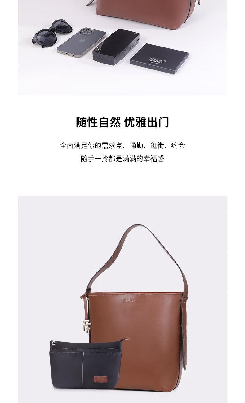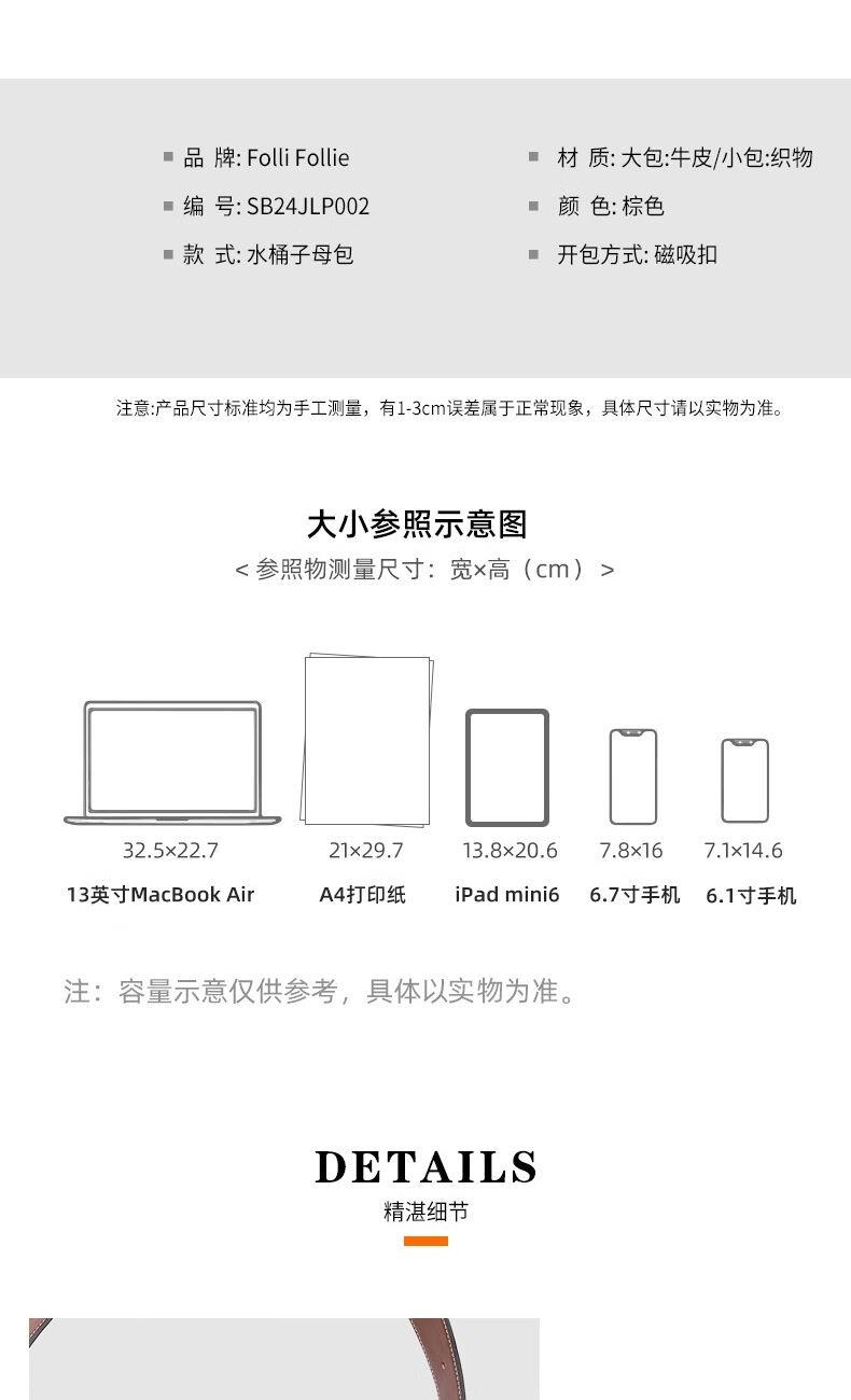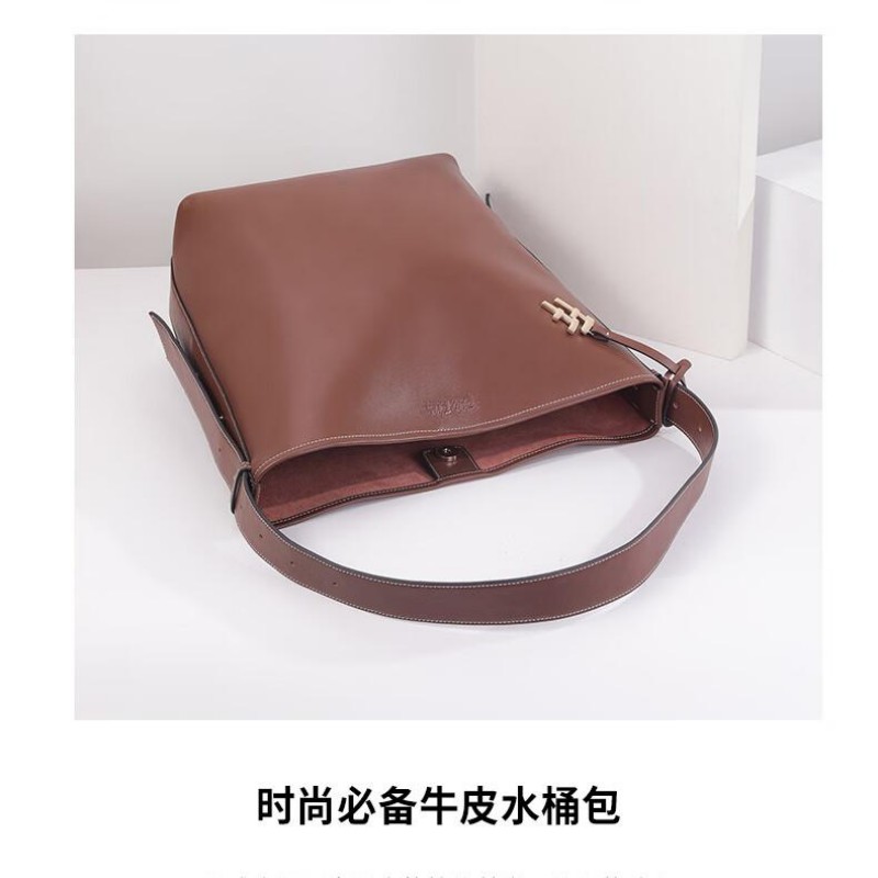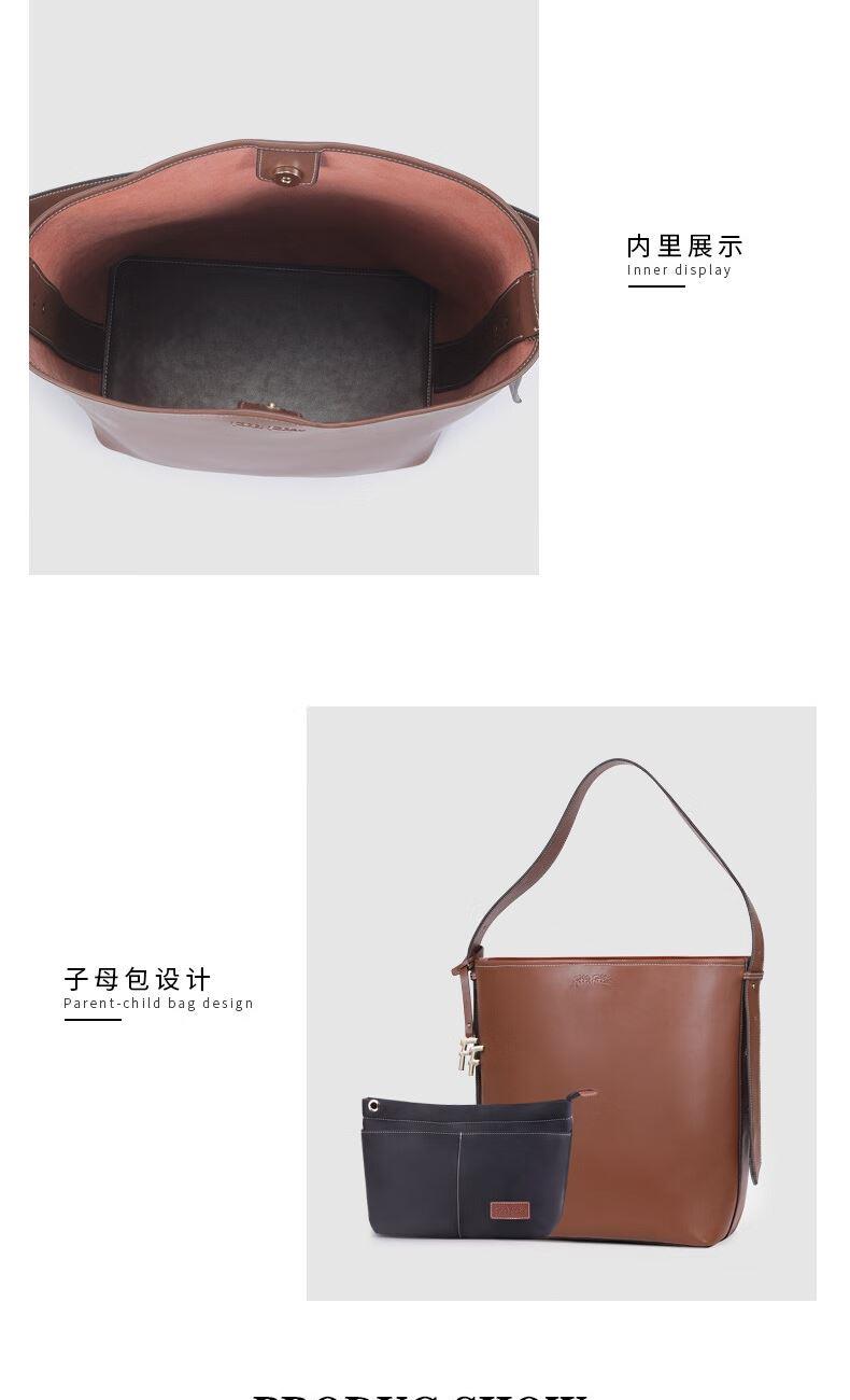 圆润的轮廓,流畅的线条,水桶包设计赋予了包包独特的视觉魅力。 每一寸皮革都经过精细处理,保留了天然的纹理和质感。 线条流畅,造型大方,容量可观,轻松容纳您的日常物品 款式:手拎/单肩 颜色:棕色 材质:牛皮(大包);织物(小包) 尺寸:330*150*260MM(大包);200*100*230MM(小包) 克重:1086g