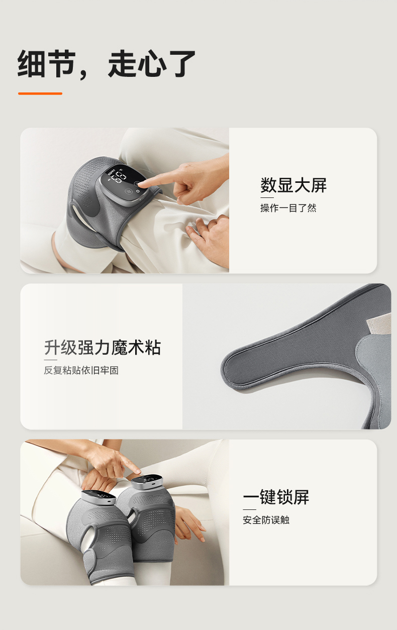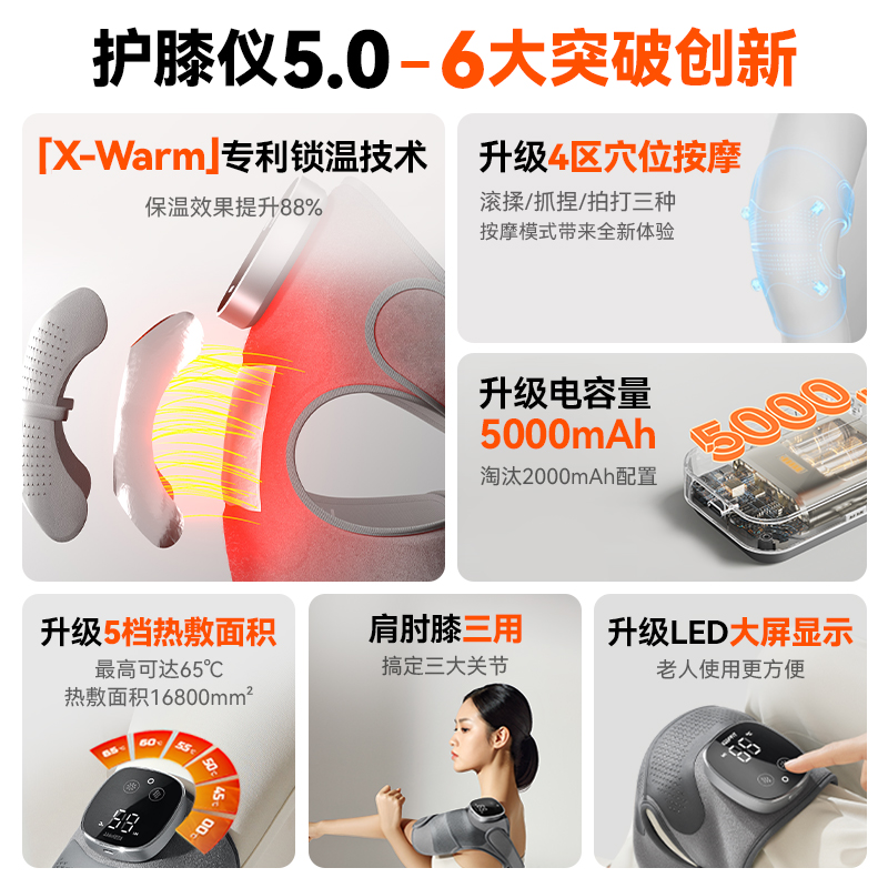 1.肩部,膝盖,手肘(多功能按摩器)有配1根延长带2.液晶数显、触屏操作,银离子反射层+SBR双重锁温 3.168cm²发热面积 ,石墨烯发热片5秒速暖 4.四区按摩独立控制,可有多种按摩组合 4.电池容量5000毫安,仅按摩可用7天(每天用一次) 5.三档模式、五档温度调节( 45、50、55、60、65) 6.外层:PU皮料+OK布,内衬:健康布+提花莱卡料 7.壳料采用防火料,NTC控温设计,安全系数高。
