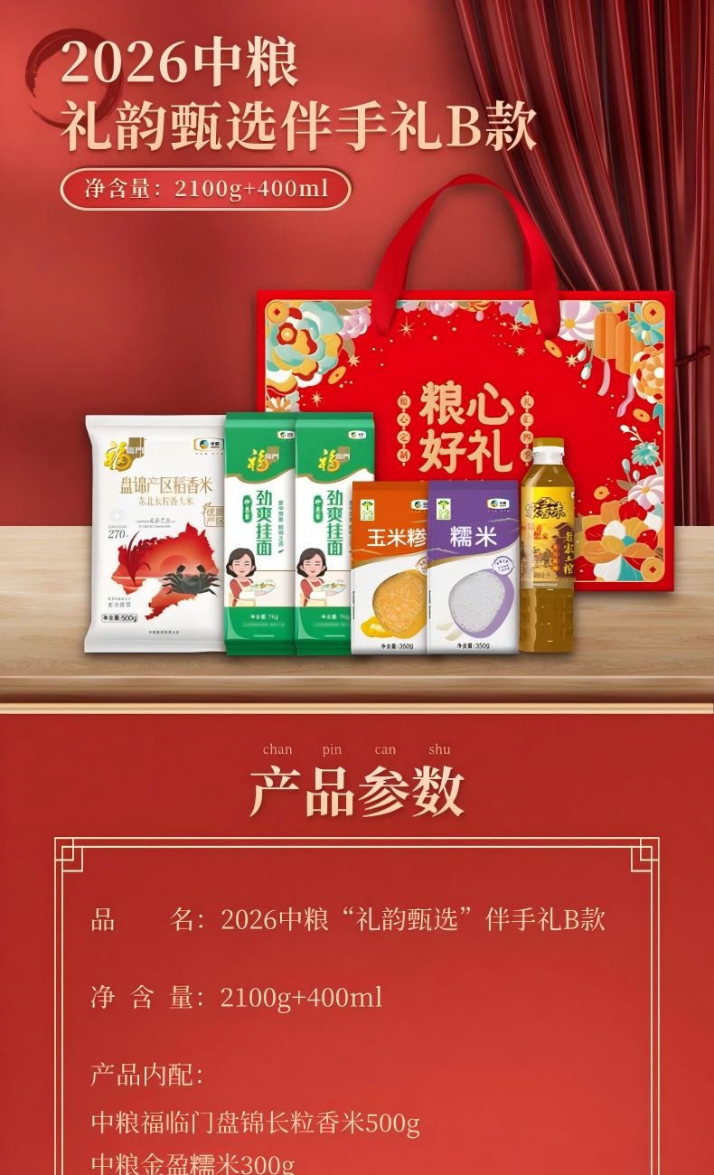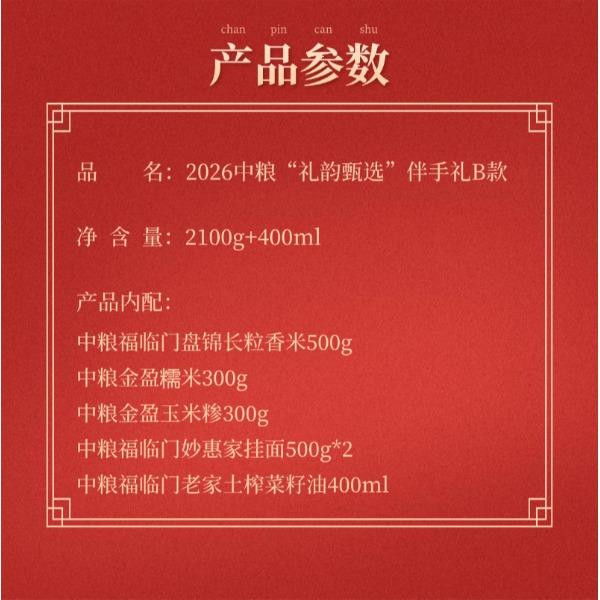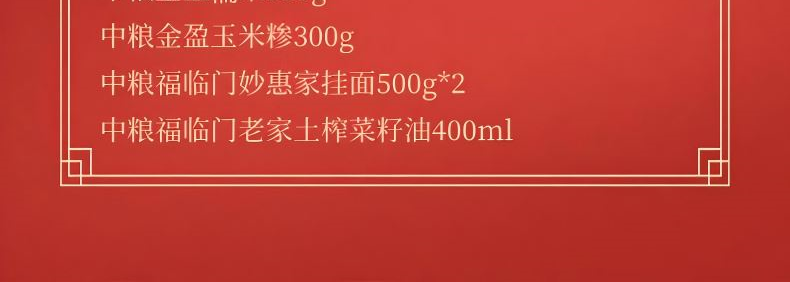 净含量:2100g+400ml 中粮福临门盘锦长粒香米500g 中粮金盈糯米300g 中粮金盈玉米糁300g 中粮福临门妙惠家挂面500g*2 中粮福临门老家土榨菜籽油400ml 推荐理由: 央企品质保障,全产业链品控 1-中粮集团背书,从田间到餐桌全链路严控,严苛品控与标准化管理,安全放心。 高营养全谷物,保留原生营养 2-富含膳食纤维、B 族维生素与矿物质;精碾磨 / 稳态化技术,做到 “粗粮细口感”,营养与口感兼得。 产地优选 + 科学配比,实用更省心 3-东北 / 高原等优质产区原料,多品类组合、科学搭配,适配轻食 / 控糖 / 全家日常,一站式配齐。
