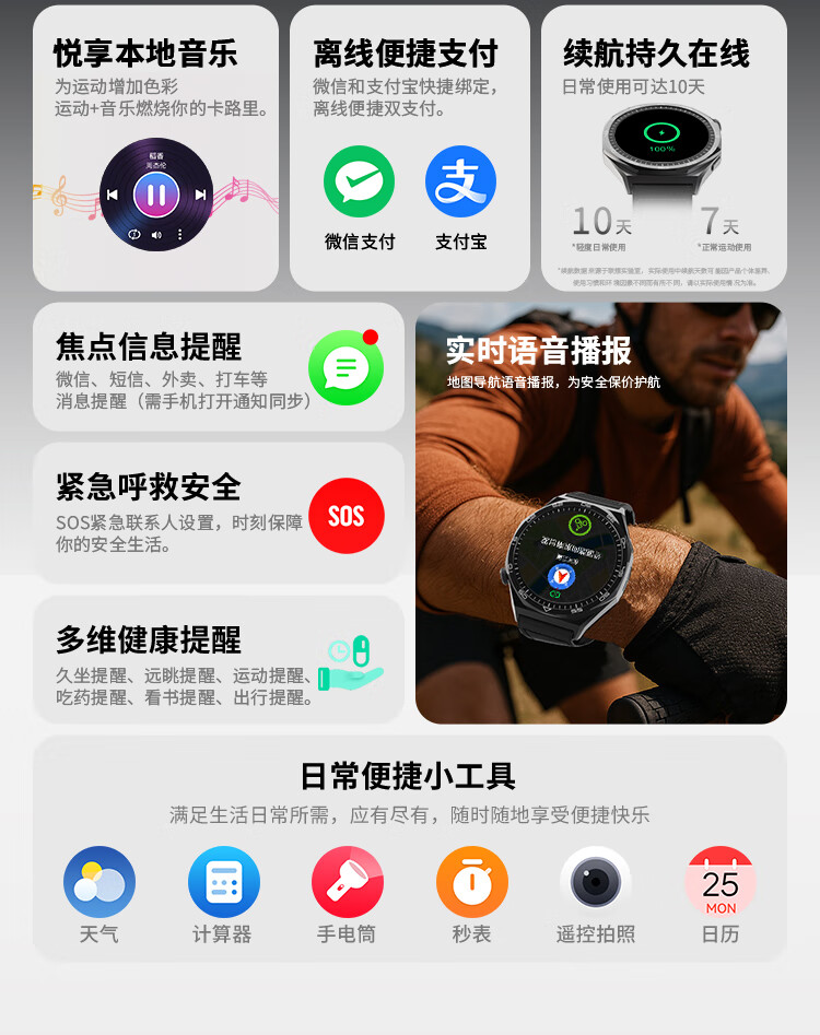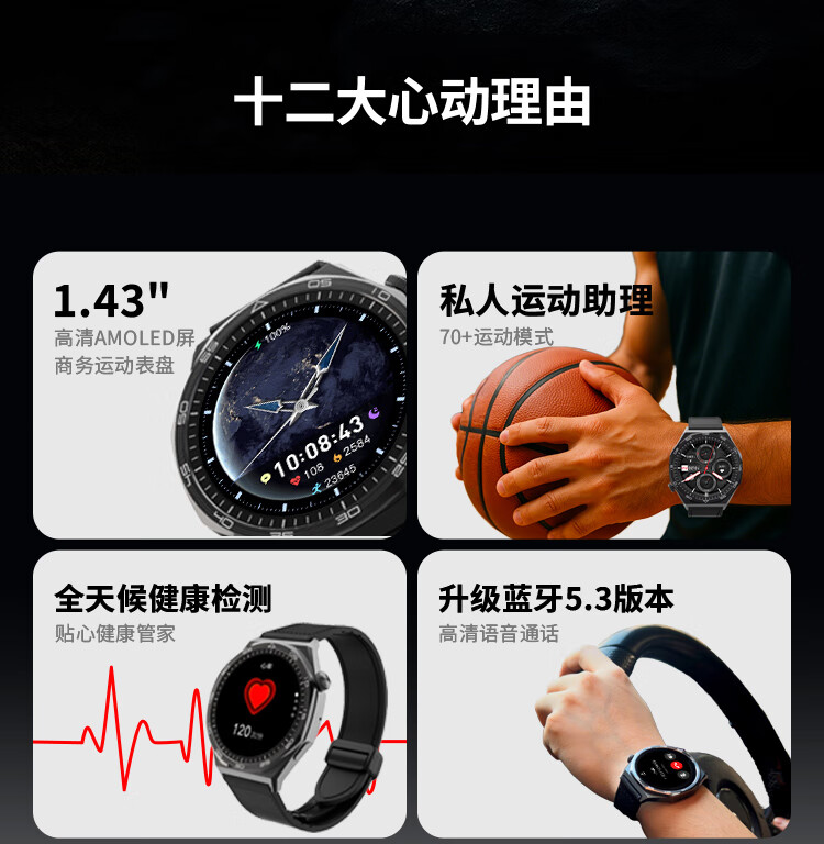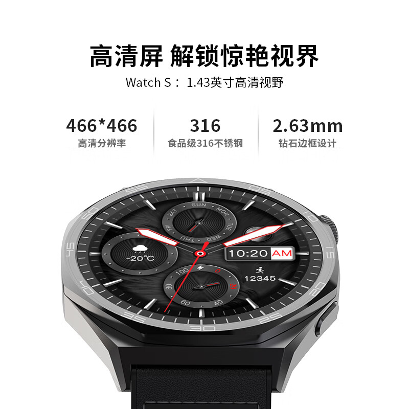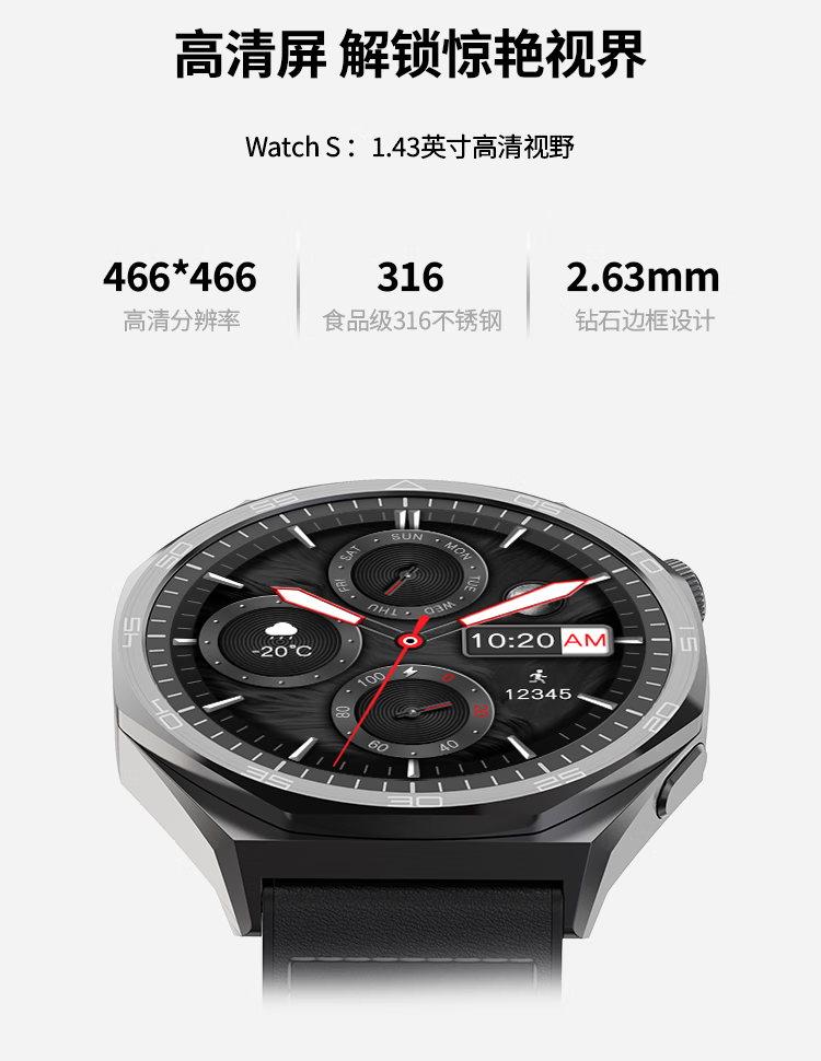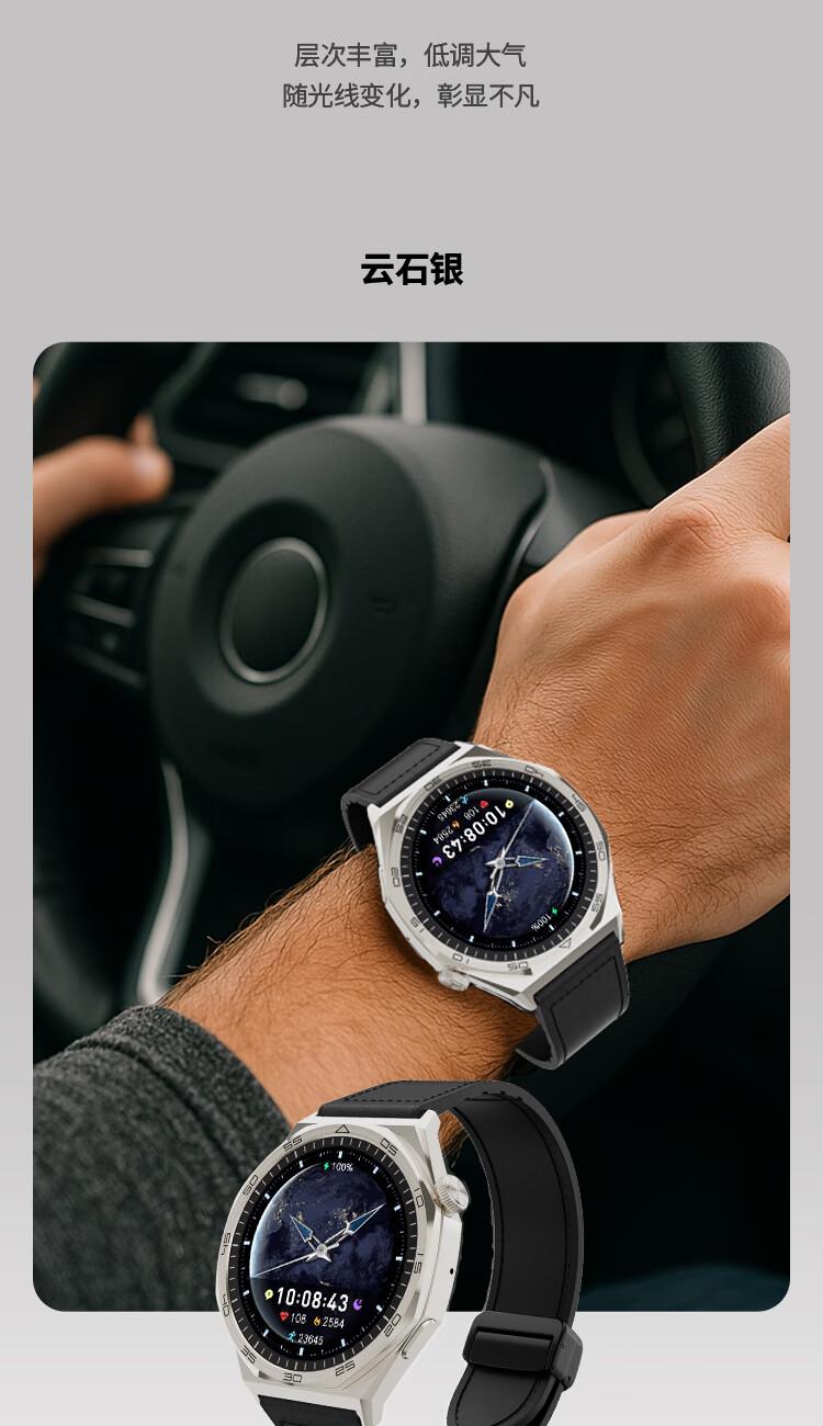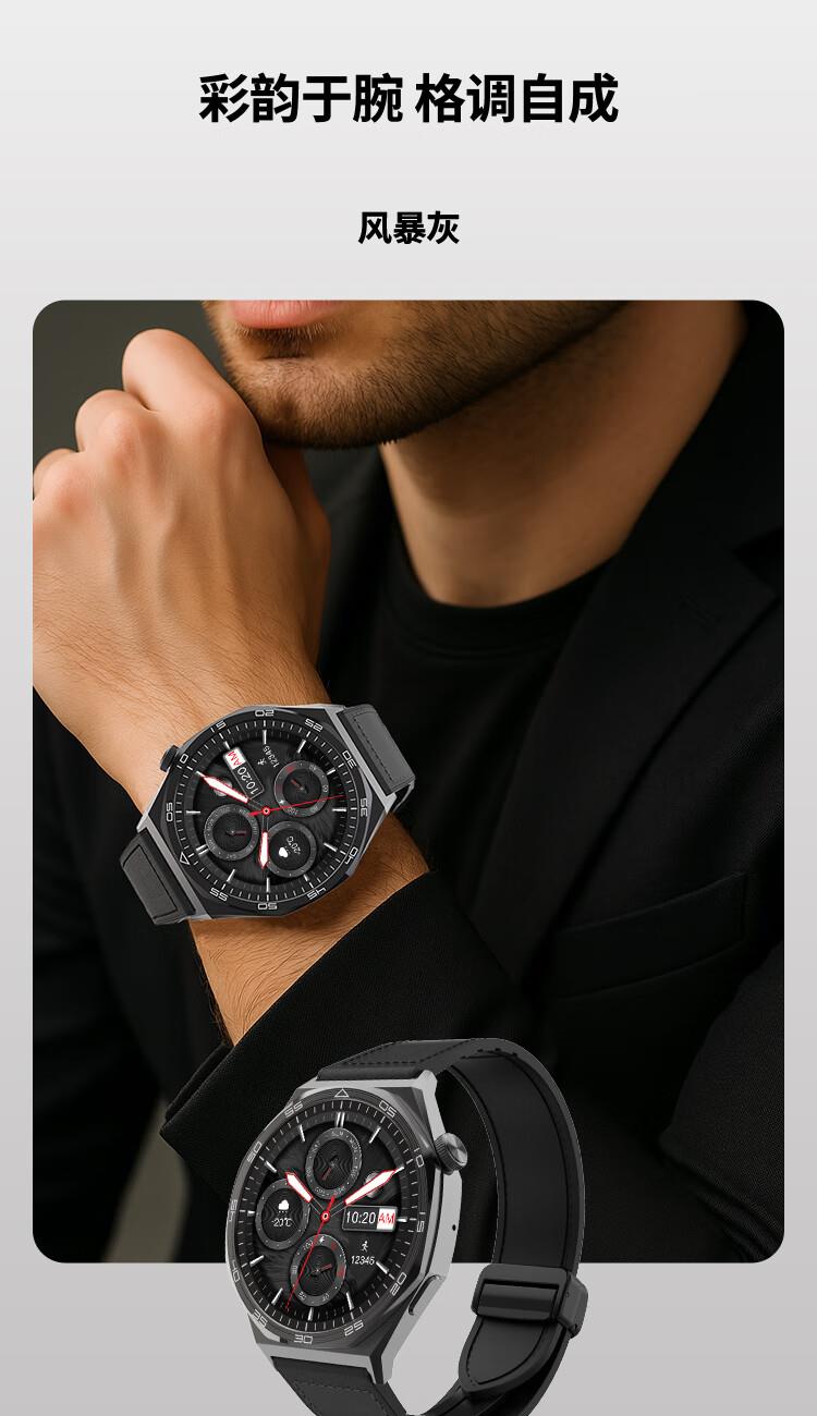 1.43英寸 AMOLED 钢化玻璃 316不锈钢+锌合金真空镀 塑胶喷防指纹UV 铝合金阳极氧化 钢化玻璃+电镀丝印工艺 磁吸快拆皮表带+硅胶表带 316不锈钢 46*9.9mm IP68 微信支付、支付宝支付、乘车码、AOD熄屏表盘,AI精美表盘,AI表盘相册,菜单壁纸、语音备忘录、个性化铃声,本地音乐/相册,TWS耳机,遥控拍照,百度导航V2.0,世界时钟、翻译官、手电筒、天气