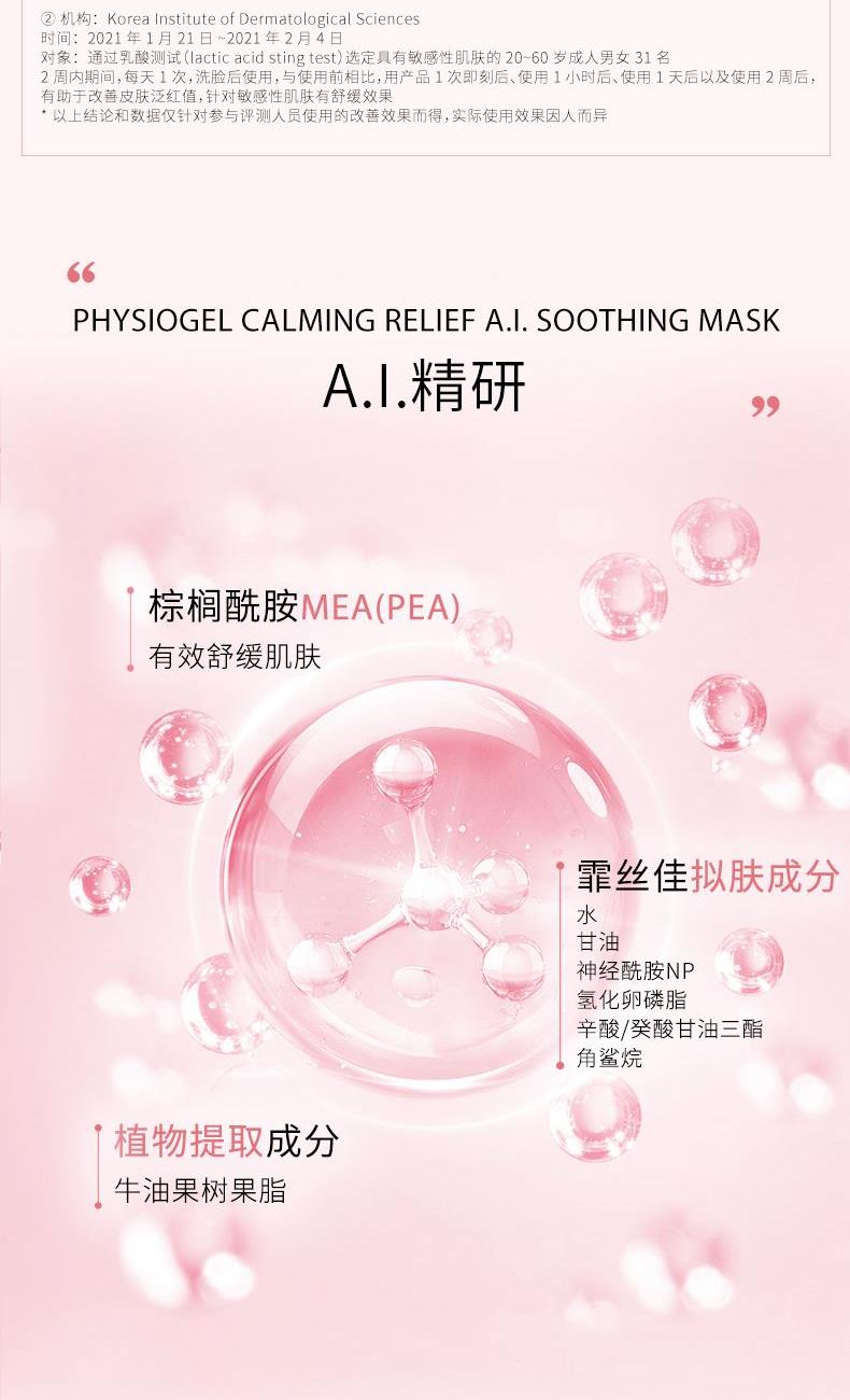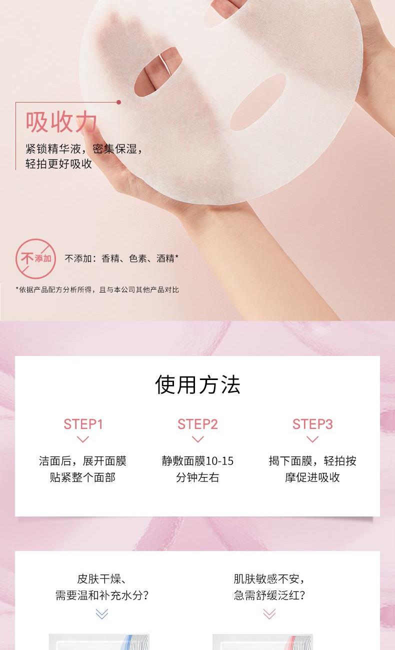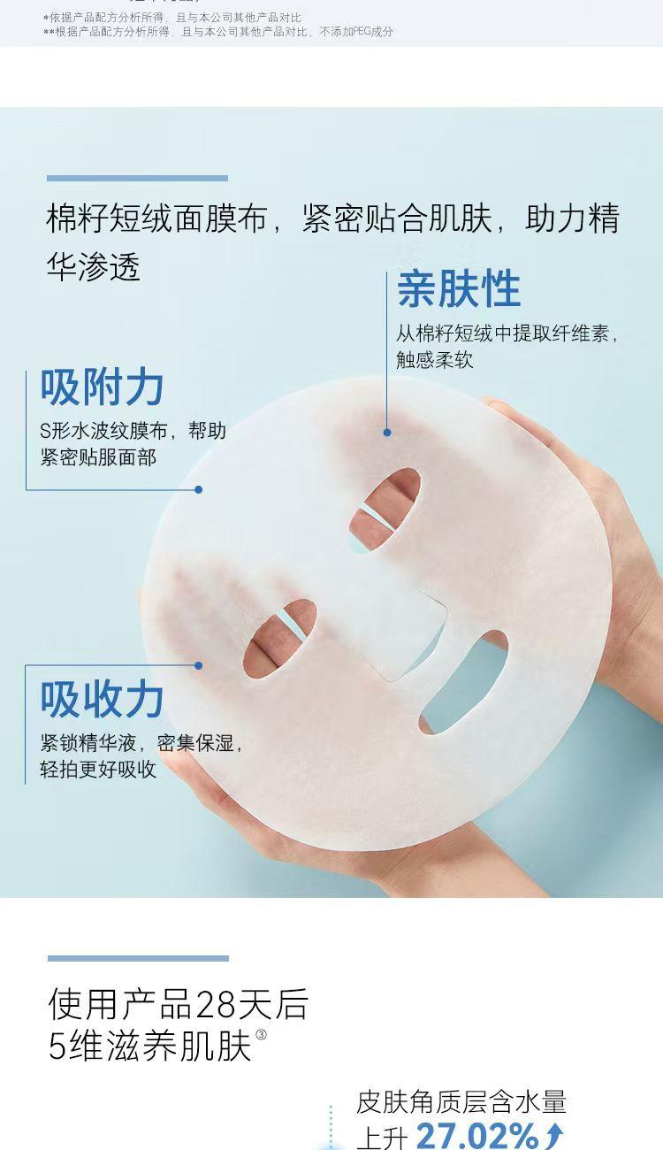 舒缓修护,维稳安肤,强韧屏障(特殊美容后适用) 精选棉籽短绒如天鹅般柔软,精细纤维宛如自身肌肤; 精华液:半透明面膜精华液,兼具舒适感和水分感,清透水润不黏腻; 亲肤性:从棉籽短绒中提取纤维素,触感柔软; 吸收力:紧锁精华液,密集保湿,轻拍更好吸收。 密集保湿,深入补水,奶油乳状般浓稠盈润质地密集保湿,帮助肌肤焕活水润嫩泽,坚持使用改善肌肤缺水状态; 敏感肌适用 :温和无刺激配方,呵护敏感和干燥的肌肤