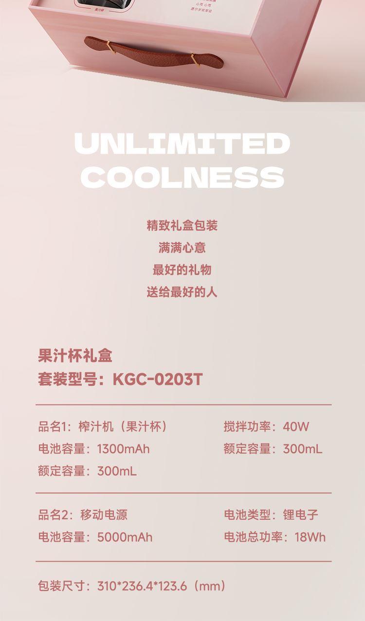 电池输出电压:DC 3.7V 搅拌功率:40W 额定容量:300mL 电池容量:1300mAh 额定输入电压:DC 5V 额定输入电流:1A 充电宝: 电池容量:5000mAh/18Wh/3.6V 额定容量:2600mAh 总输出:5V-3A Type-C口输入:5V-2.6A 9V-2A 12V-1.5AType-C口输出:5V-3A 9V-2.22A 12V-1.67A Type-C接头输出:5V-3A 9V-2A 12V-1.5A 10V-2.25A Lightning线输出:5V-2.4A