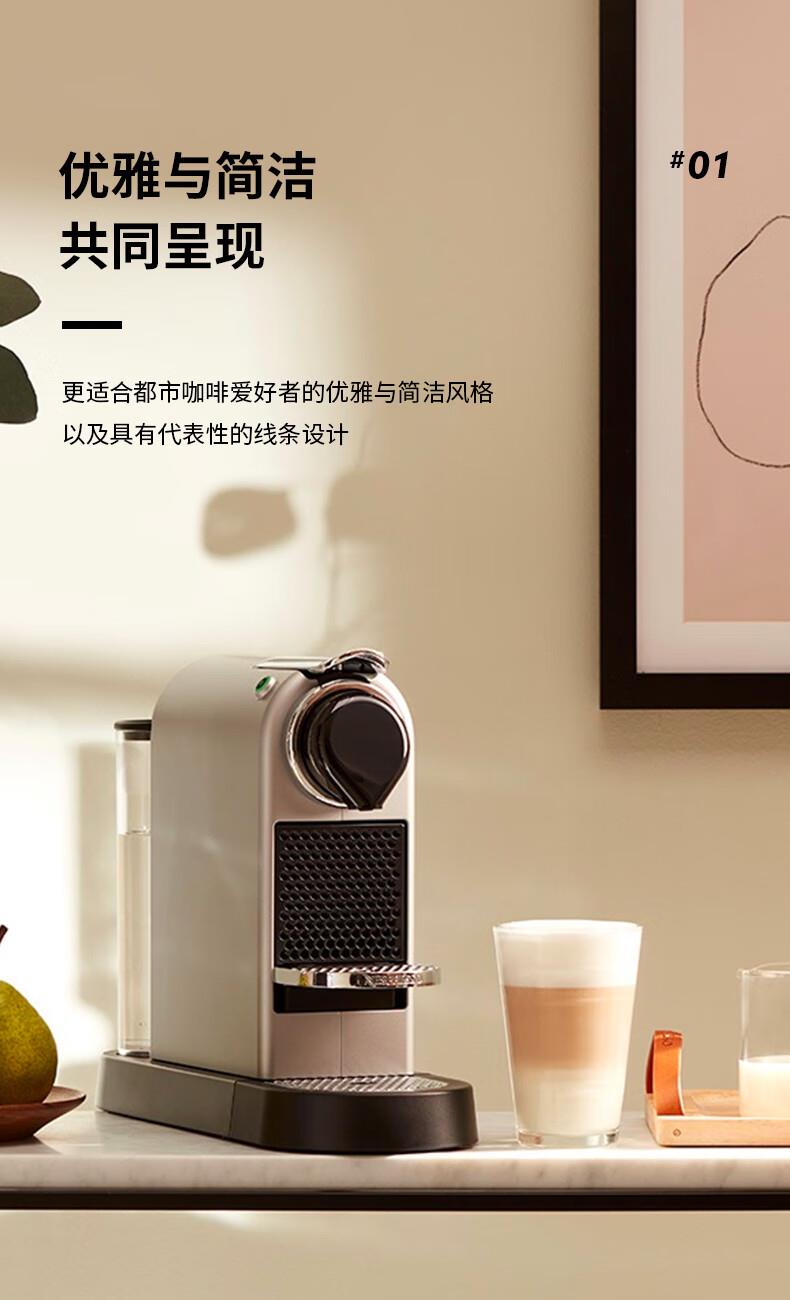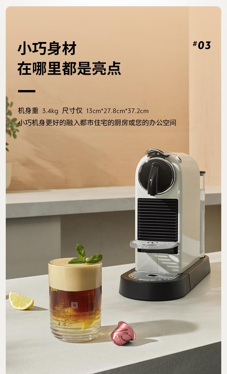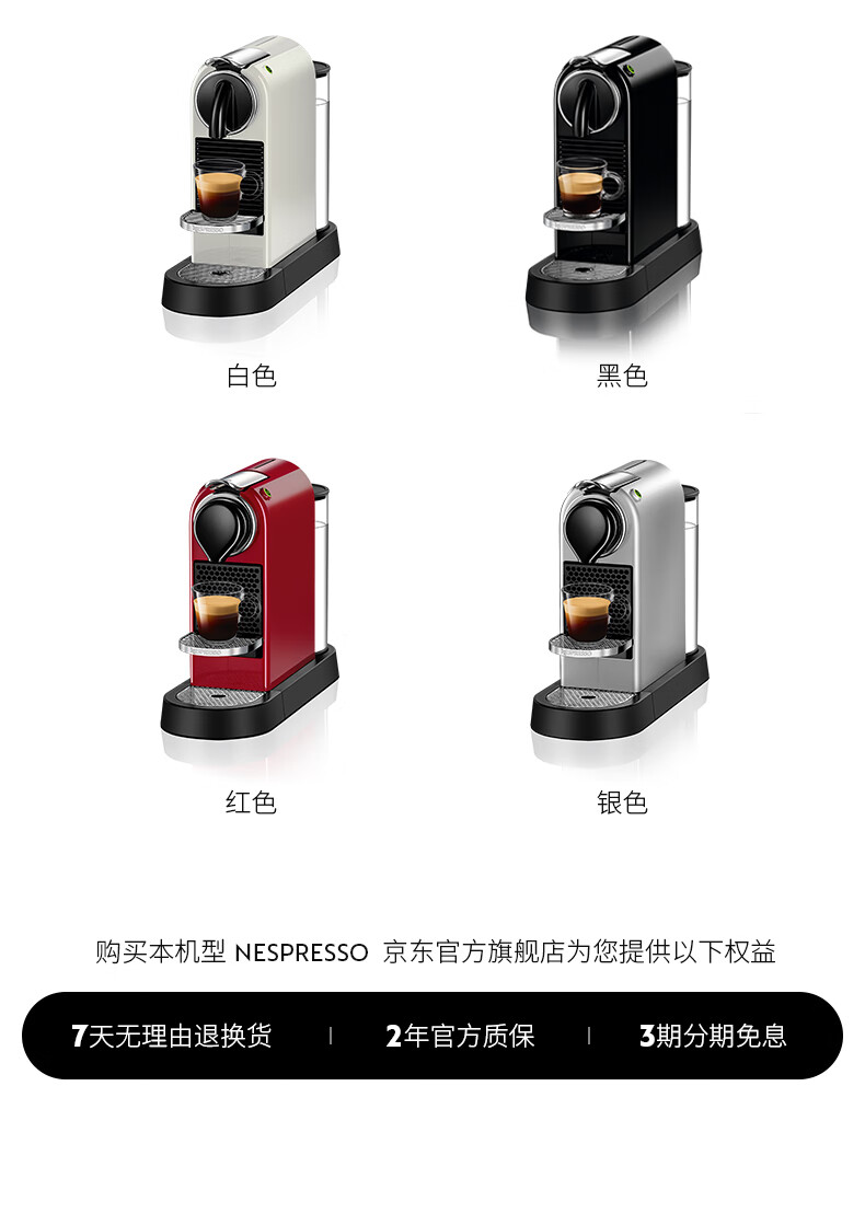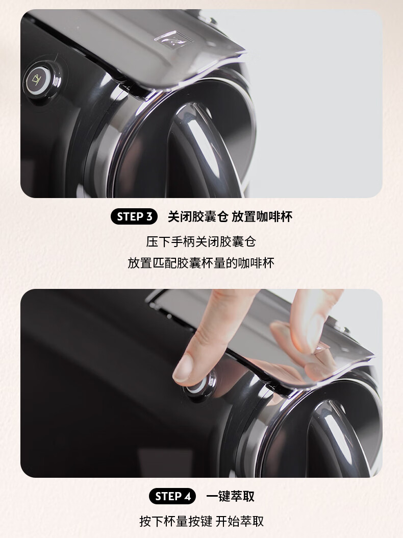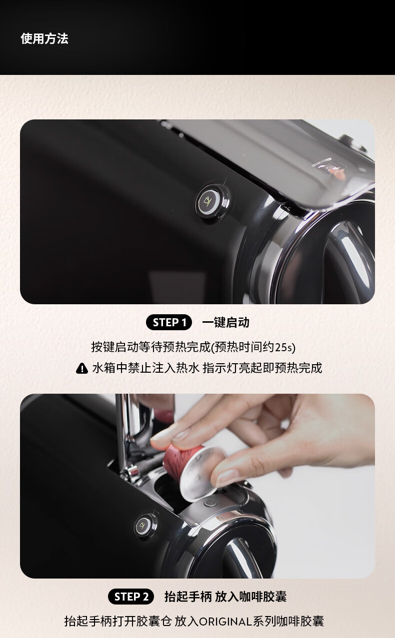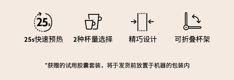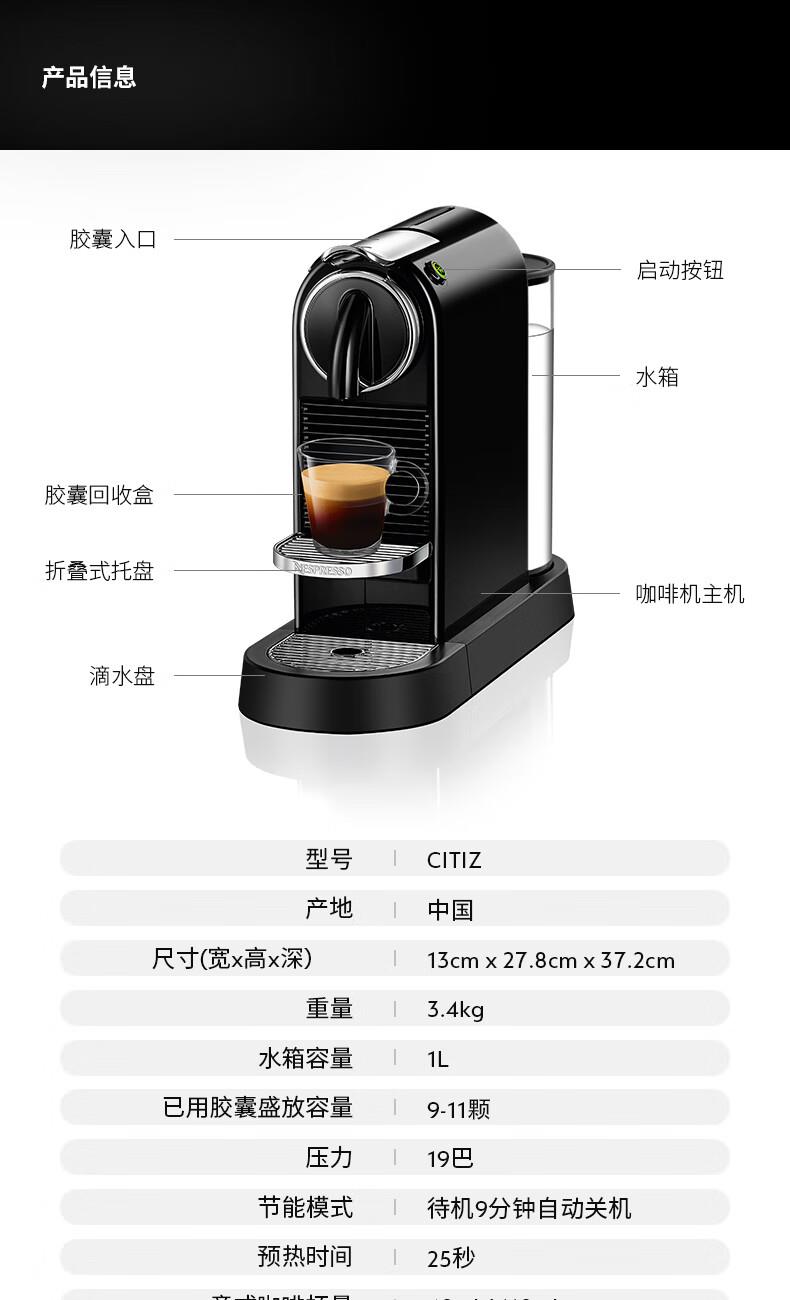 型号:D113 电源线长:1.2m 额定电压:220V 额定功率:1150W 产品尺寸:长130mm 宽372mm 高278mm 水箱容量:0.6-1.29L 泵浦压力:19Bar 制作口味:卡布奇诺 拿铁 意式浓缩 复古摩登的外型为您的咖啡体验增添一抹优雅气息保留了标志性的线条和简洁的设计语言,承载着NESPRESsO的咖啡知识满足咖啡爱好者的品鉴喜好