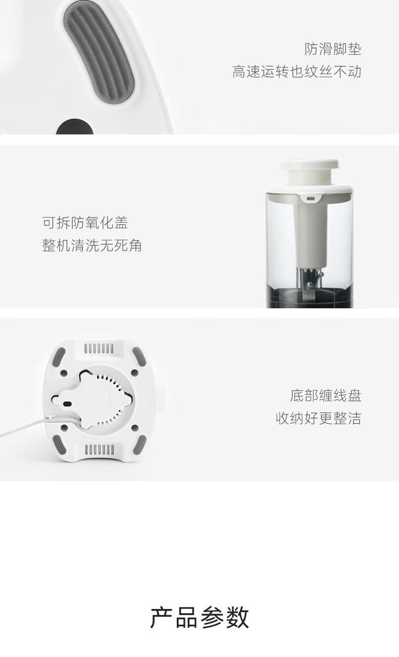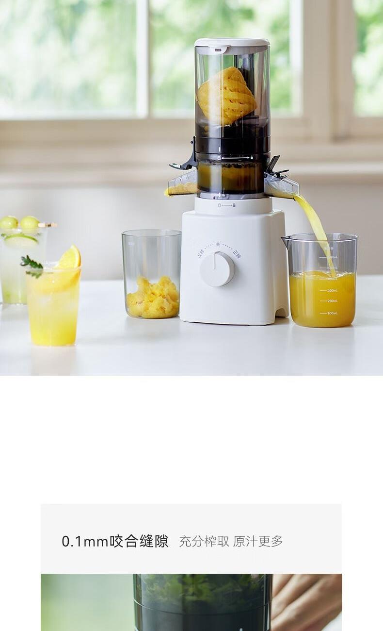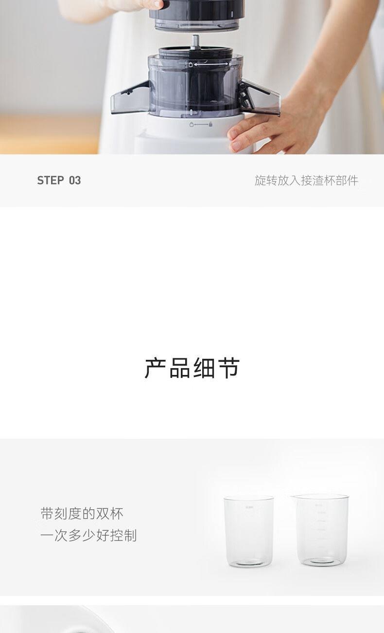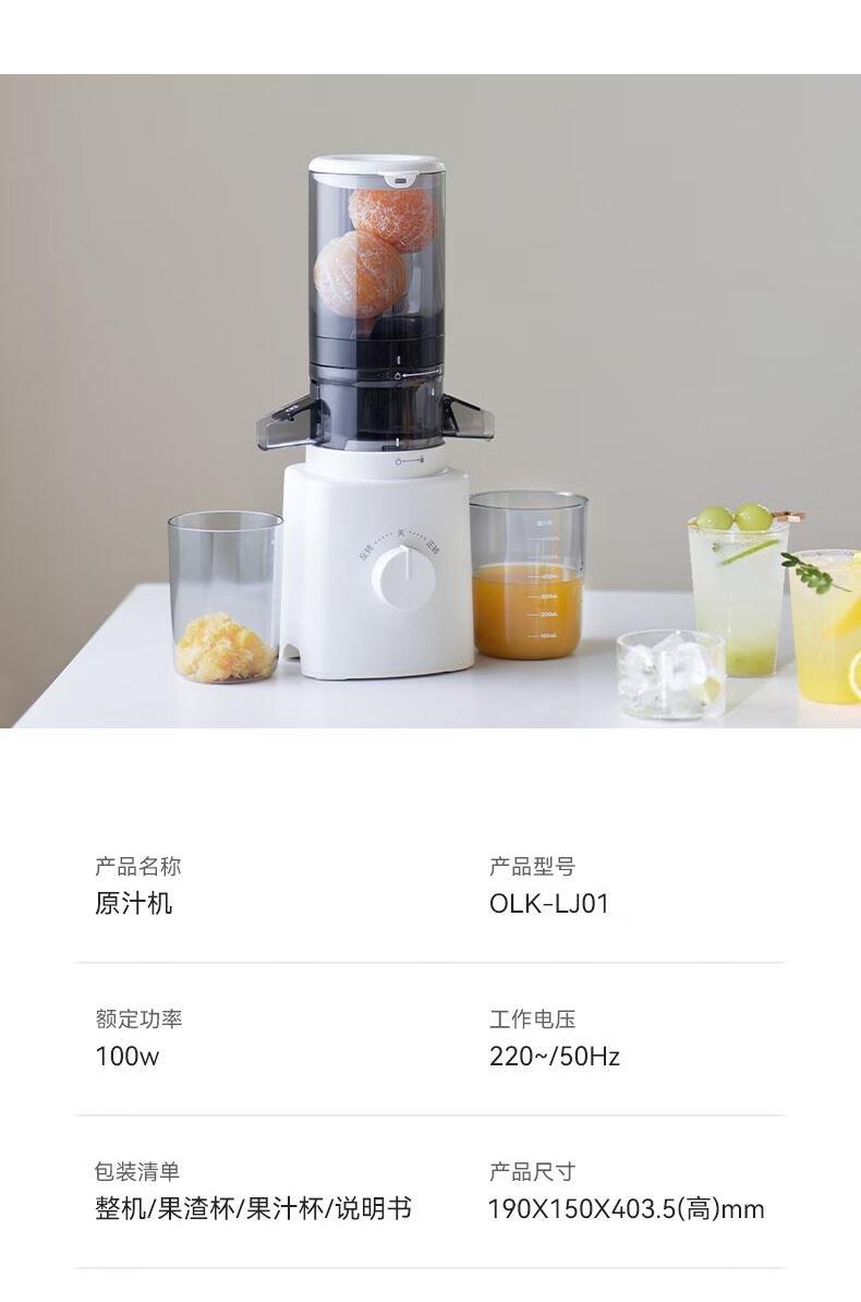 原汁机: 颜色:陶白 容 量:0.5L 重量:2.95kg 额定功率:100W 产品尺寸:190*150*403.5mm 包装尺寸:385*305*200mm