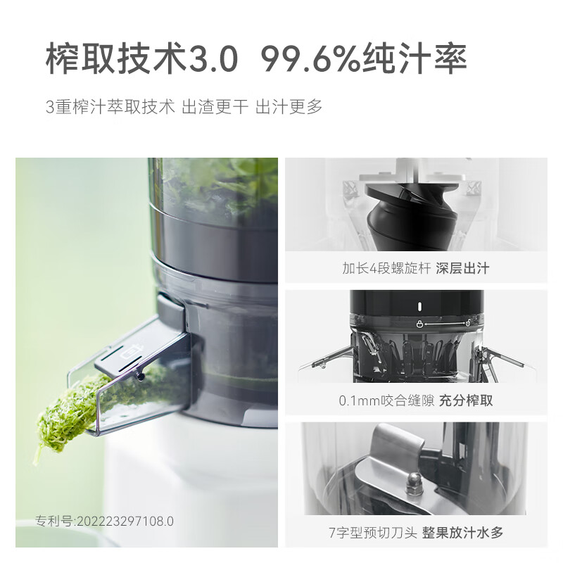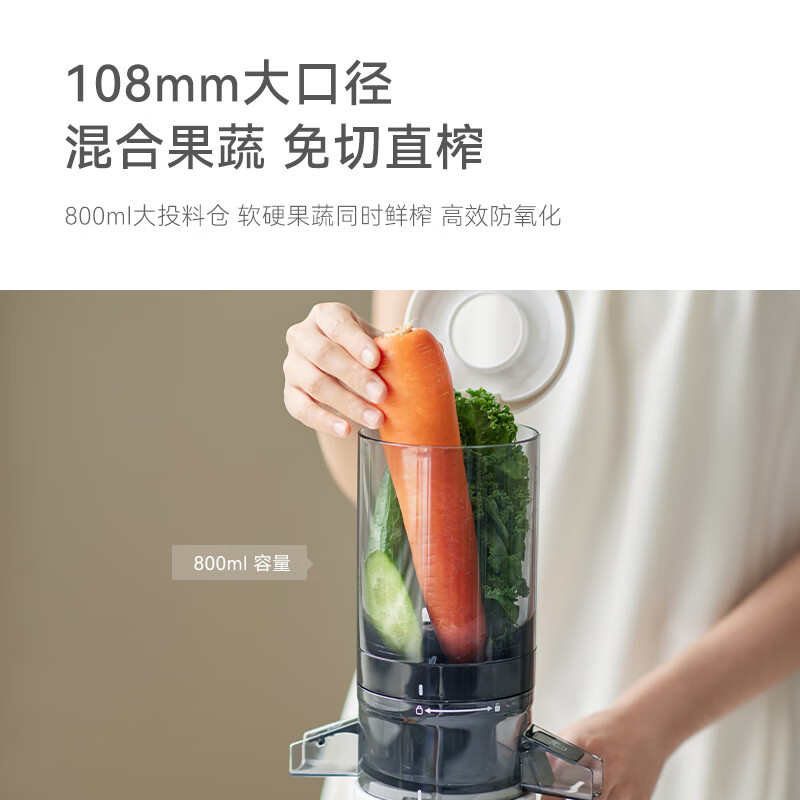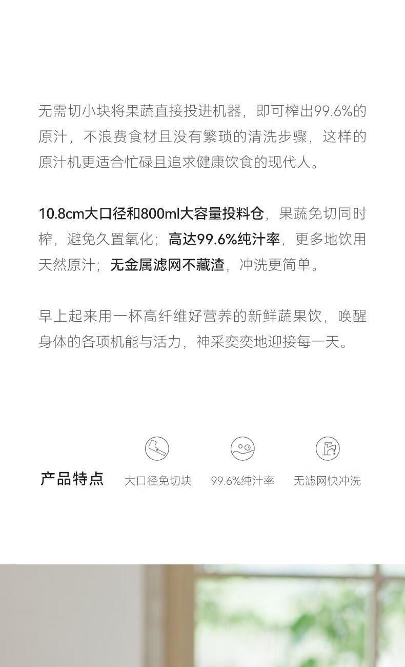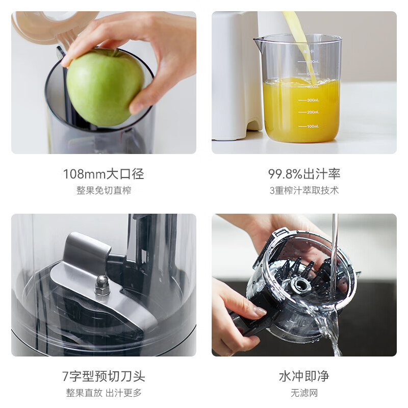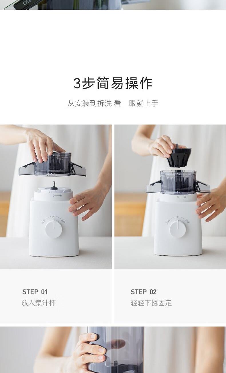 原汁机: 颜色:陶白 容 量:0.5L 重量:2.95kg 额定功率:100W 产品尺寸:190*150*403.5mm 包装尺寸:385*305*200mm