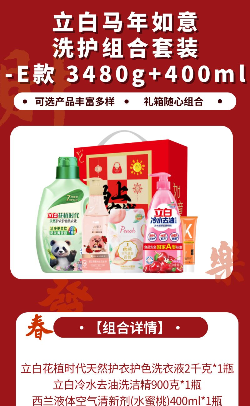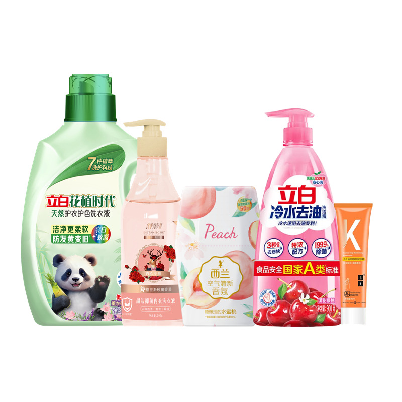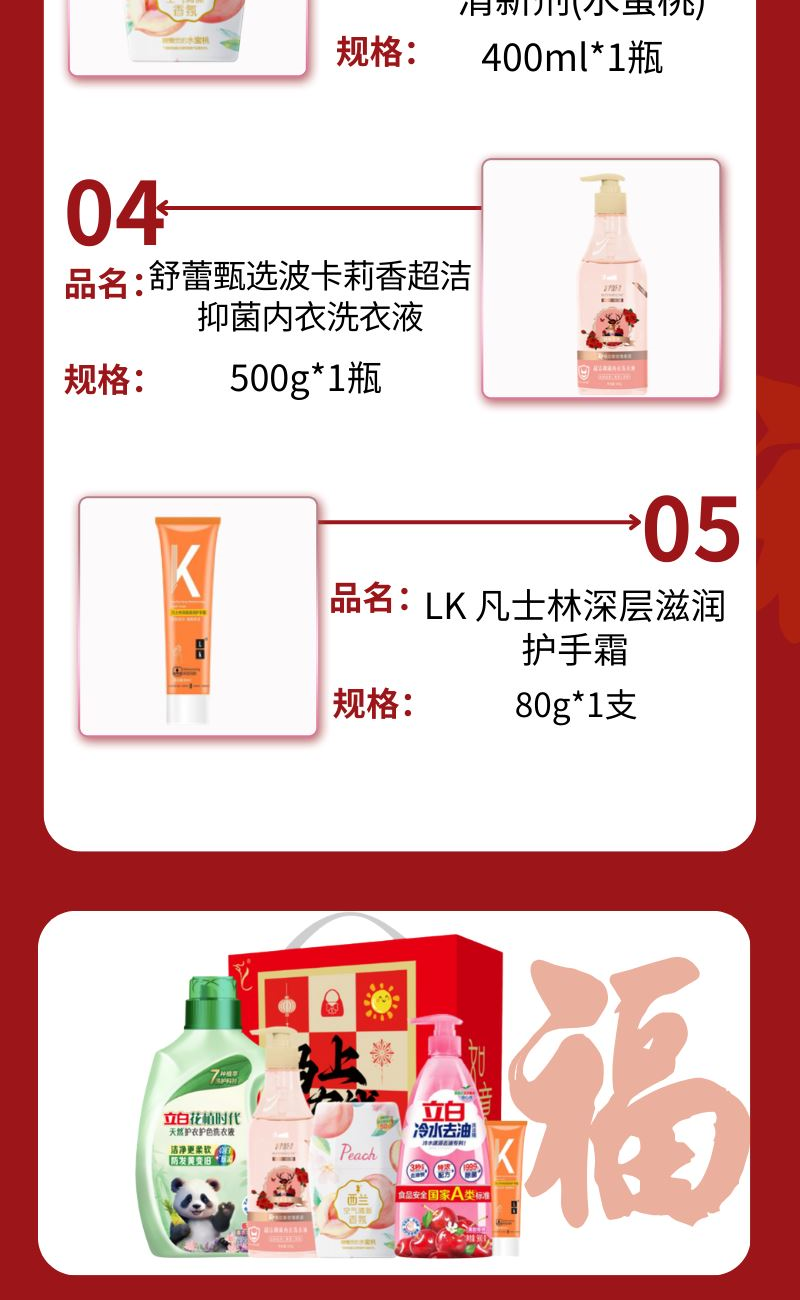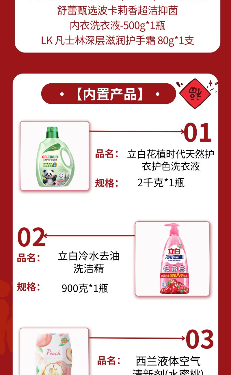 配置: 立白花植时代天然护衣护色洗衣液2千克*1瓶 立白冷水去油洗洁精900克*1瓶 西兰液体空气清新剂(水蜜桃)400ml*1瓶 舒蕾甄选波卡莉香超洁抑 菌内衣洗衣液-500g*1瓶 LK 凡士林深层滋润护手霜 80g*1支 卖点: 可选产品丰富多样,礼箱随心组合,多种价位因需而定,充分满足各种送礼需求,是商务送礼、单位福利的用心之选。