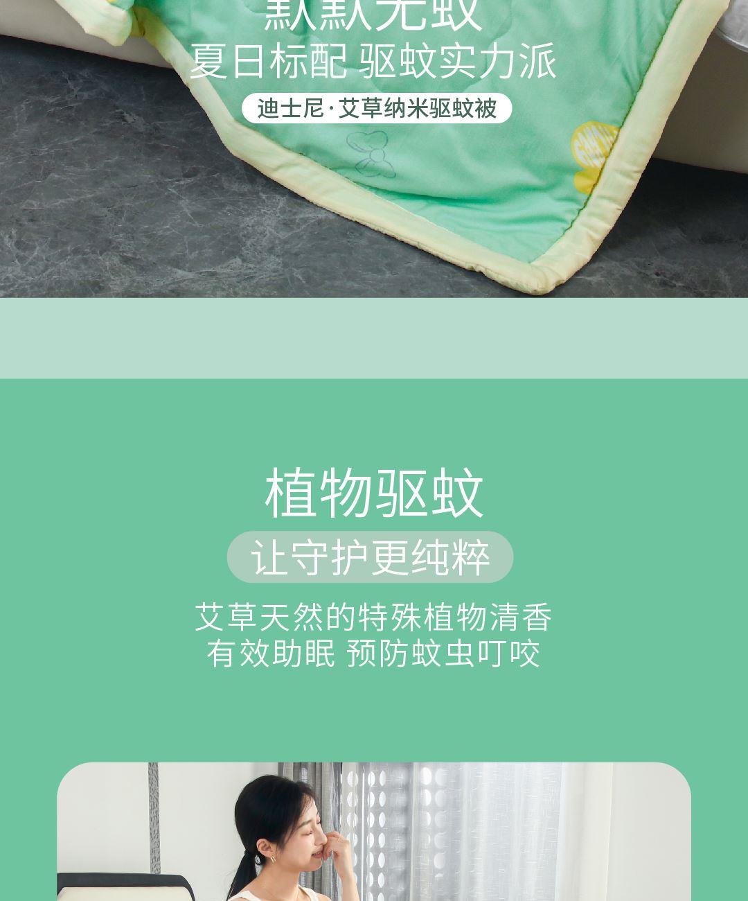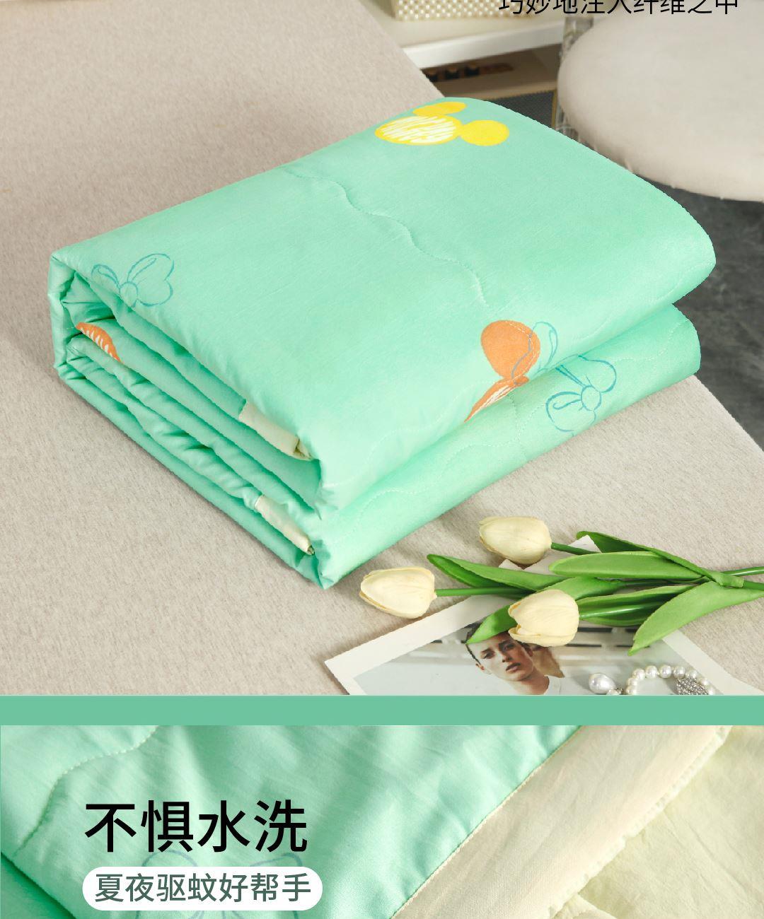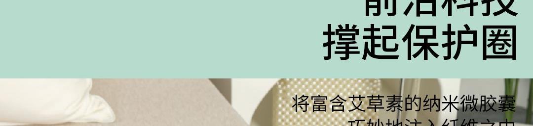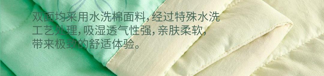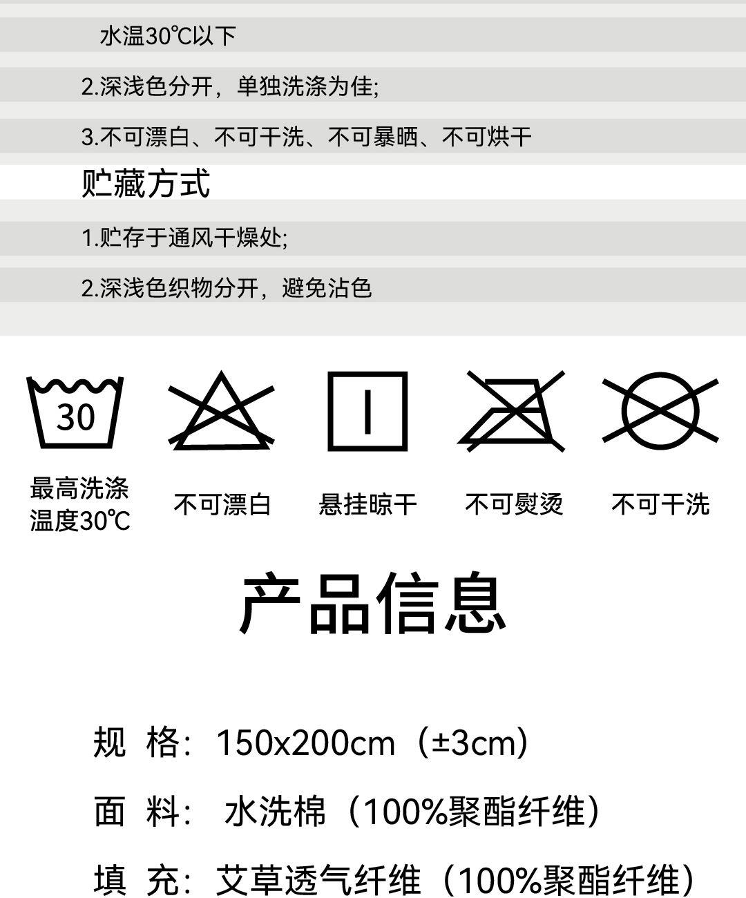 规 格:150x200cm(±3cm) 面 料: 水洗棉(聚酯纤维) 填 充:艾草透气纤维(聚酯纤维) 采用前沿科技,将富含艾草素的纳米微胶囊巧妙地注入纤维之中。艾草天然的特殊植物清香,有效助眠,预防蚊虫叮咬, 选用 5D 中空透气纤维填充,独特的微孔状结构设计,高效排汗,蓬松柔软,清爽舒适。 双面均采用水洗棉面料,经过特殊水洗工艺处理,吸湿透气性强,亲肤柔软,带来舒适体验。 秉持环保印染理念,产品通过 A 类检测认证,无荧光剂、无甲醛残留,真正做到安全放心。