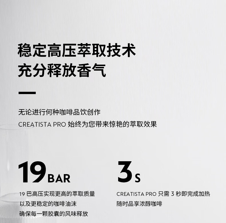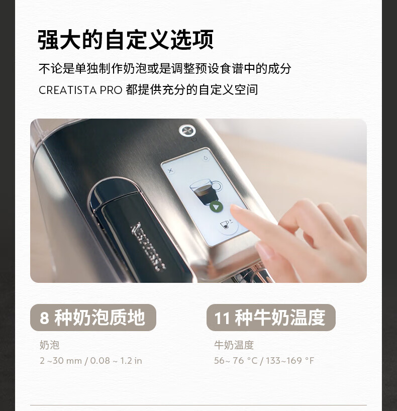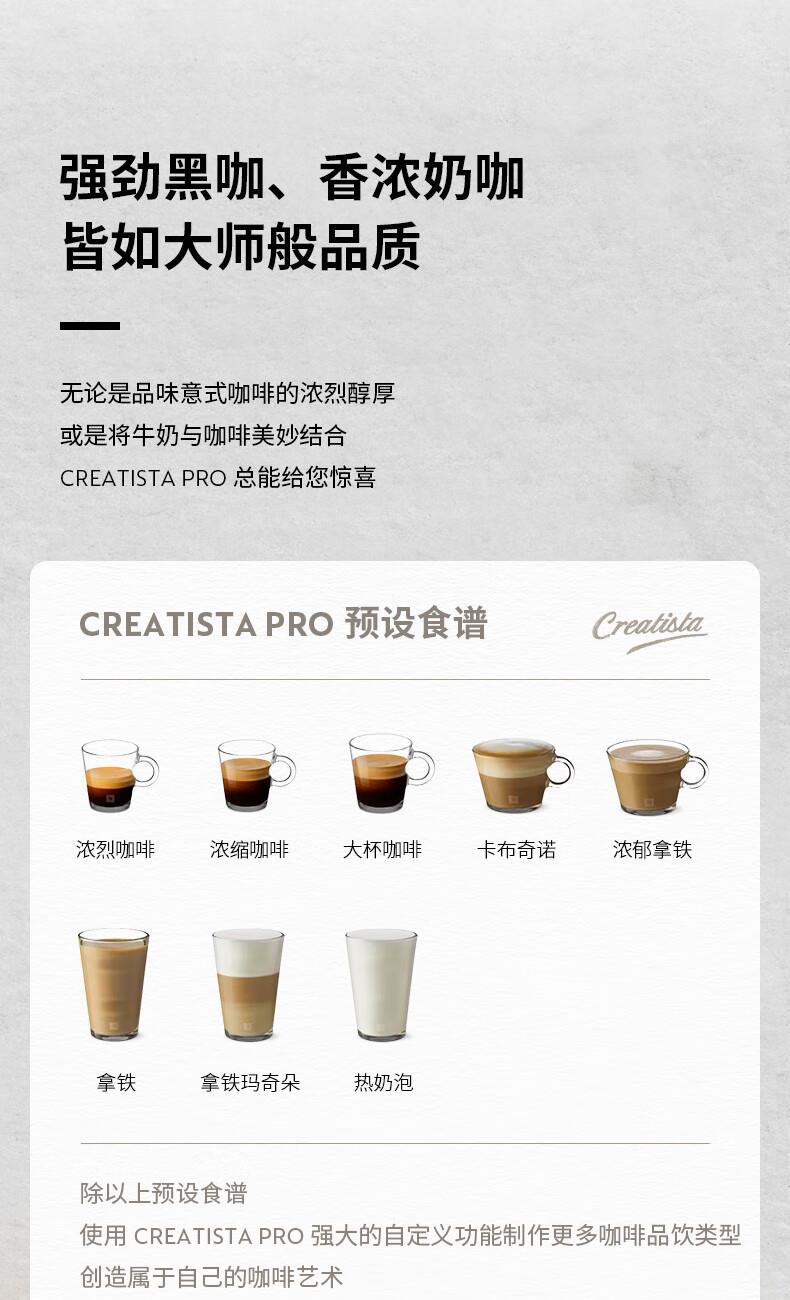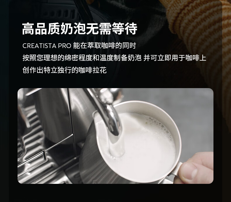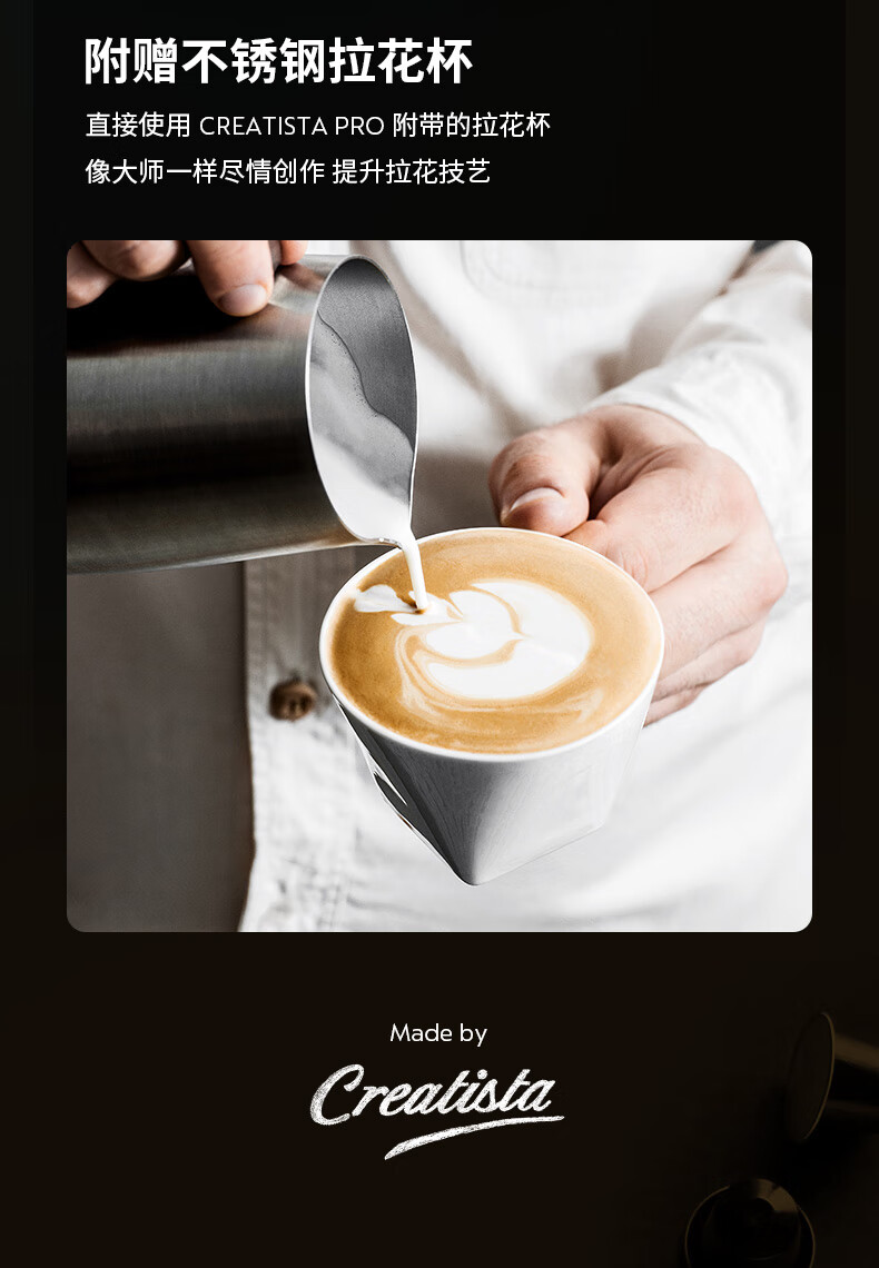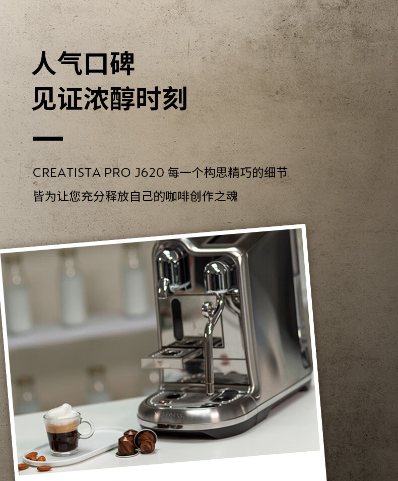 型号:J620 电源线长:1.2m 额定电压:220V 额定功率:2300W 产品尺寸:长429.4mm 宽327.5mm 高196.5mm 水箱容量:1.9L及以上 泵浦压力:19Bar 交互进阶更舒适的操作体验CREATISTAPRO所有精妙的设计皆为给咖啡爱好者提供更进阶更舒适的使用体验,全触控式屏幕,弹出式杯架,高品质奶泡无需等待。
