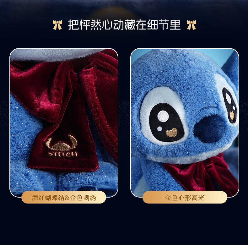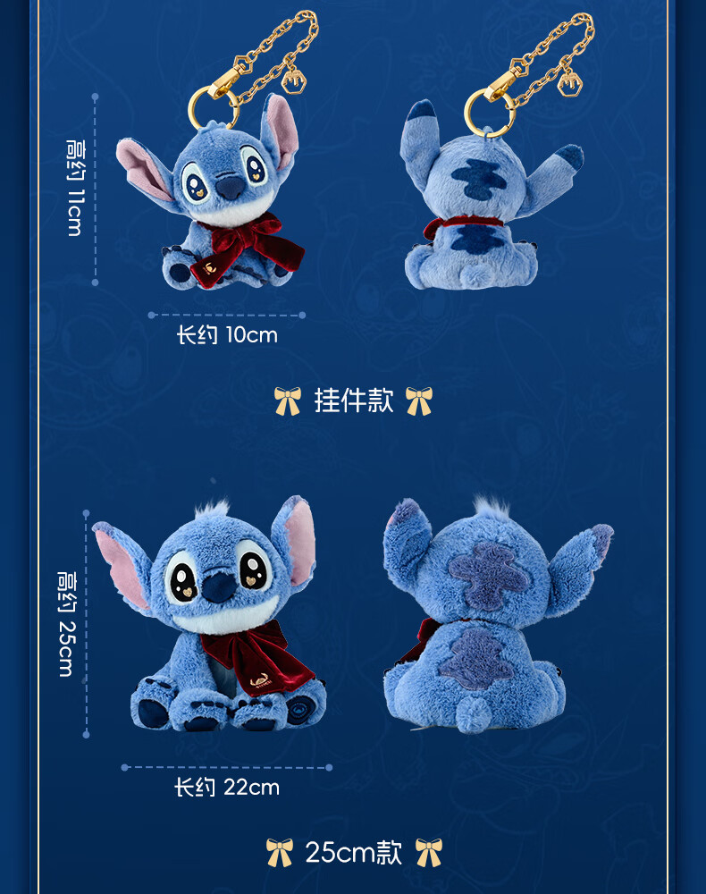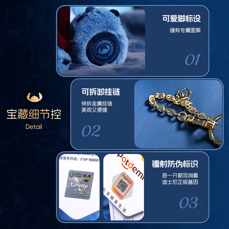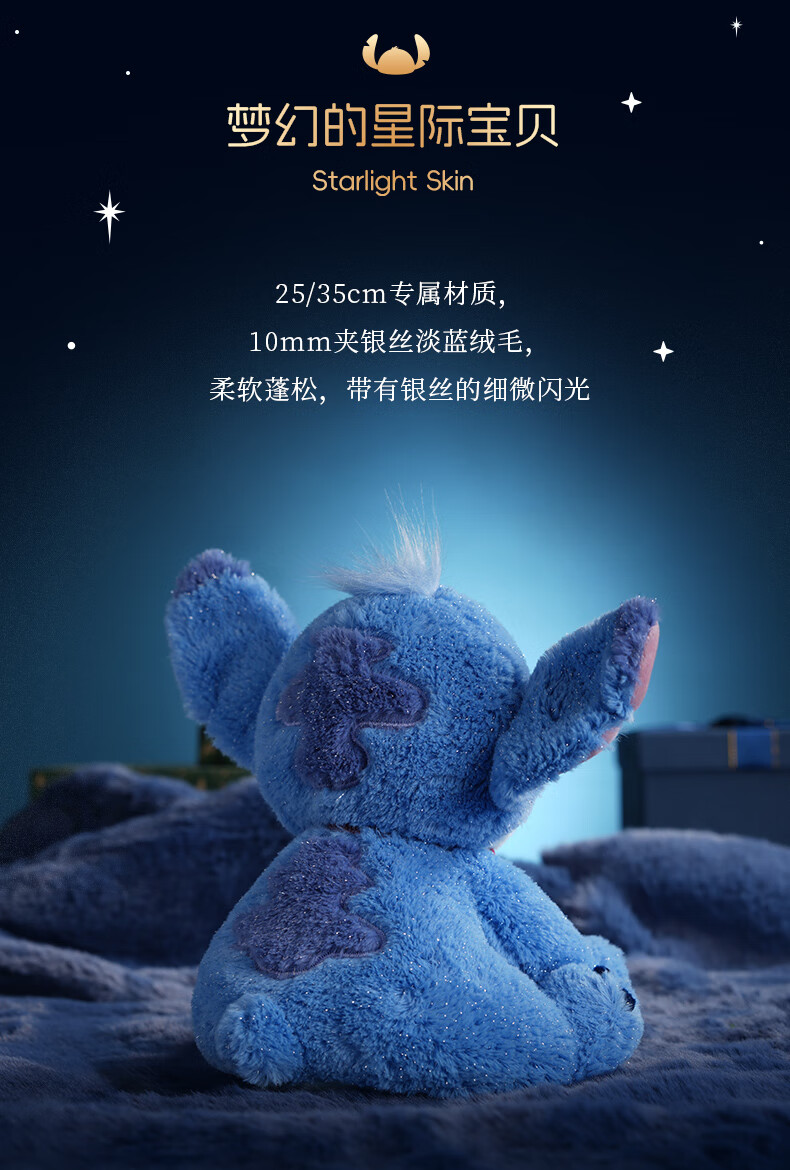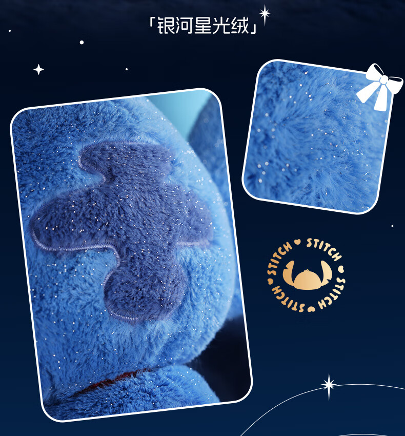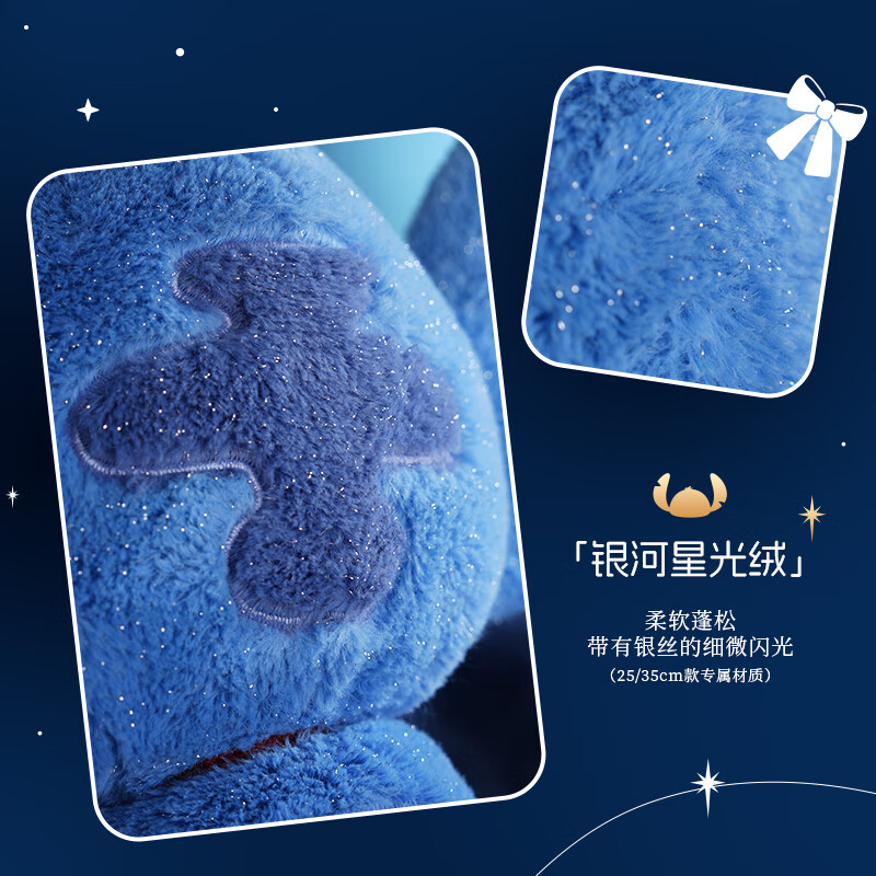 材质: 面料一聚酯纤维填充一聚酯纤维 尺寸: 约长30*宽26*高35cm(不含耳朵与尾巴) 外观特点:主体蓝色,耳朵内侧粉色,大眼萌态,眼中有心形元素增添可爱,脖颈系红丝绒蝴蝶结,色彩对比鲜明,造型别致吸睛 卖点:①10mm夹银丝淡蓝绒毛,柔软蓬松,带有银丝的细微闪光 ②淡蓝基底绒毛中镶嵌许多银丝纤维在灯光照耀下闪烁,宛如“星尘酒落" ③外观设计独特,蓝色主体搭配粉色耳朵、黑色大眼睛及俏皮造型,辨识度高。部分玩偶还会添加特色装饰,如红丝绒蝴蝶结,或融入节日、限定元素,满足不同审美与收藏需求 ④色彩搭配鲜明活泼,能快速抓住目光 ⑤制作工艺精细,从面部表情刻画到身体细节处理,都高度还原动画形象,配饰等细节也处理得当,展现高品质与匠心