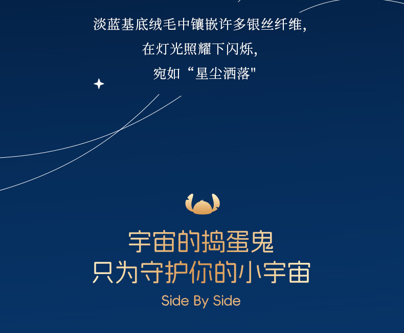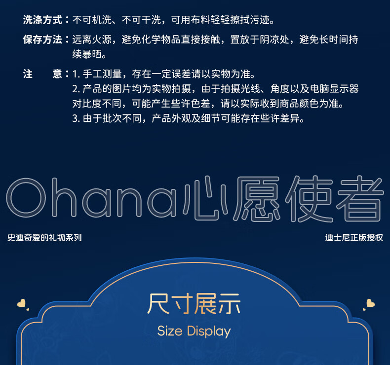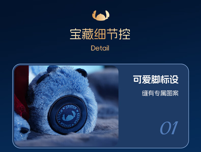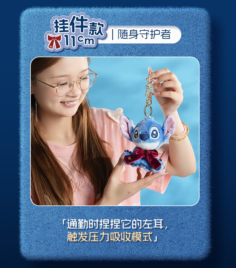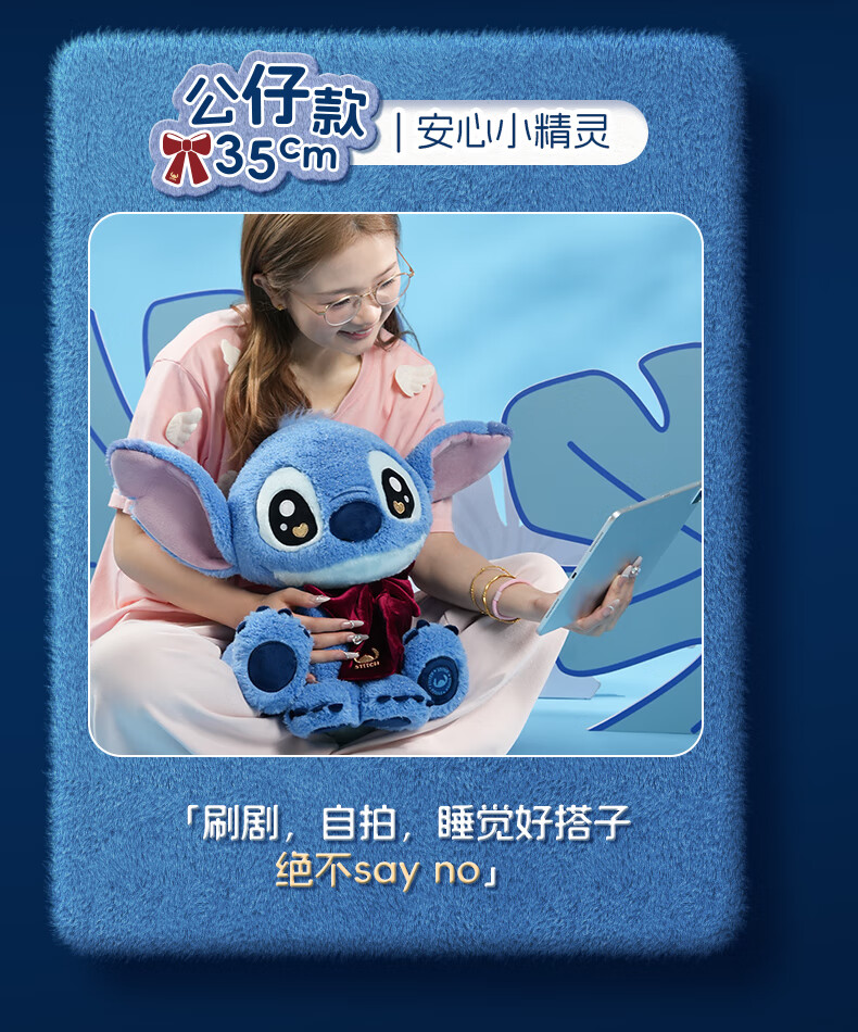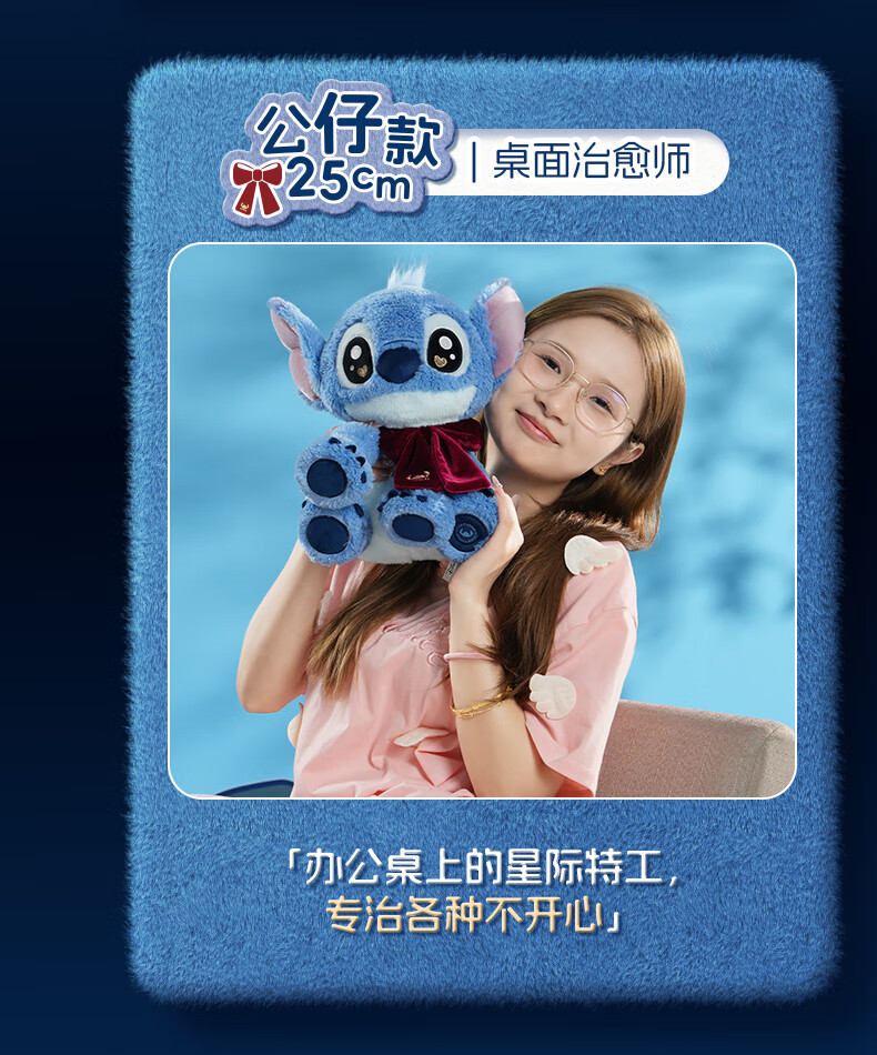 材质: 面料一聚酯纤维填充一聚酯纤维 尺寸: 约长30*宽26*高35cm(不含耳朵与尾巴) 外观特点:主体蓝色,耳朵内侧粉色,大眼萌态,眼中有心形元素增添可爱,脖颈系红丝绒蝴蝶结,色彩对比鲜明,造型别致吸睛 卖点:①10mm夹银丝淡蓝绒毛,柔软蓬松,带有银丝的细微闪光 ②淡蓝基底绒毛中镶嵌许多银丝纤维在灯光照耀下闪烁,宛如“星尘酒落" ③外观设计独特,蓝色主体搭配粉色耳朵、黑色大眼睛及俏皮造型,辨识度高。部分玩偶还会添加特色装饰,如红丝绒蝴蝶结,或融入节日、限定元素,满足不同审美与收藏需求 ④色彩搭配鲜明活泼,能快速抓住目光 ⑤制作工艺精细,从面部表情刻画到身体细节处理,都高度还原动画形象,配饰等细节也处理得当,展现高品质与匠心