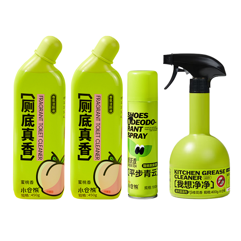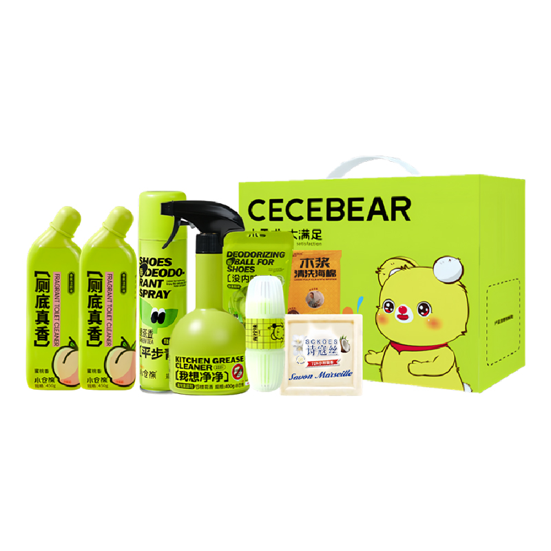 小仓熊香氛洁厕液(蜜桃香)450g 小仓熊香氛洁厕液(蜜桃香)450g 小仓熊鞋用除臭喷雾180ml 小仓熊除臭鞋球12g 小仓熊马桶挂篮-(单个装)50g 小仓熊油污净厨房深层清洁400g Sckoes诗蔻丝**皂310g 赠:Sckoes诗寇丝木浆清洗海绵1块 小仓熊甄选礼盒(265*95*270mm)