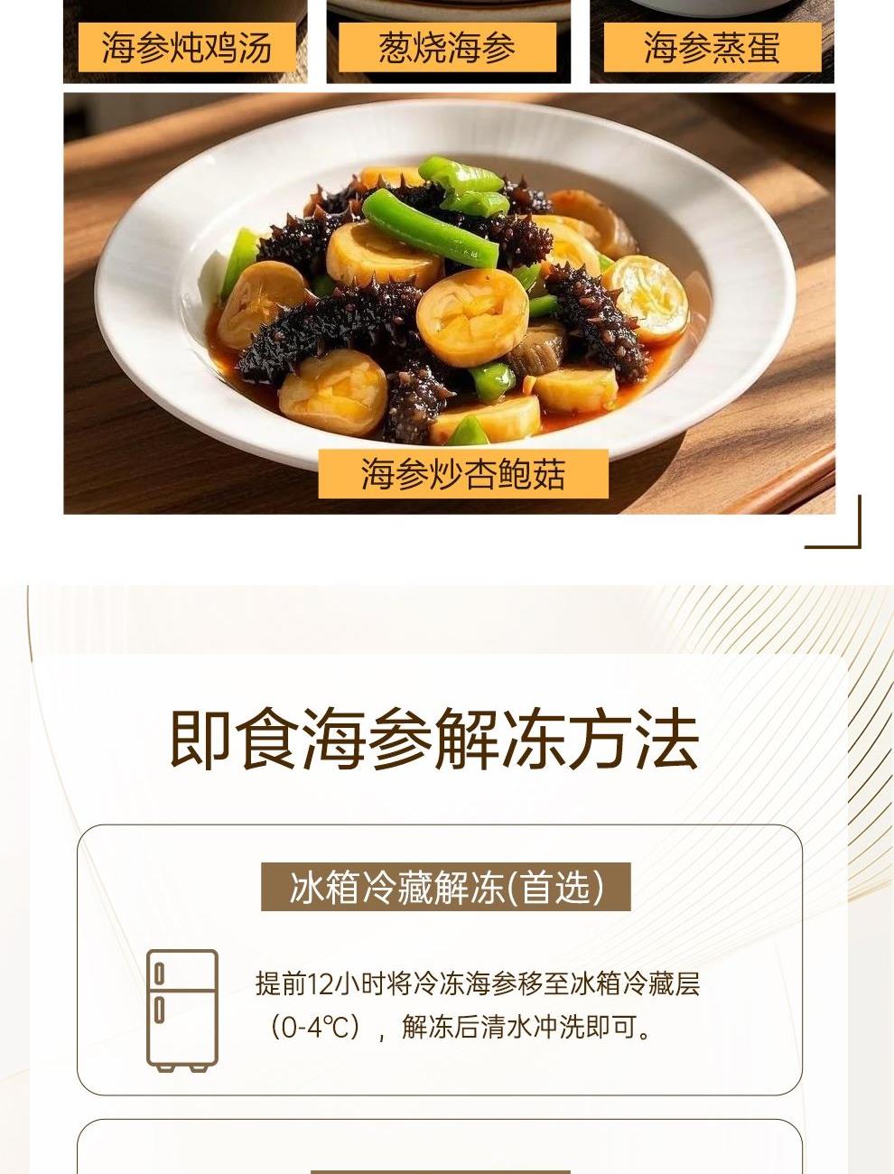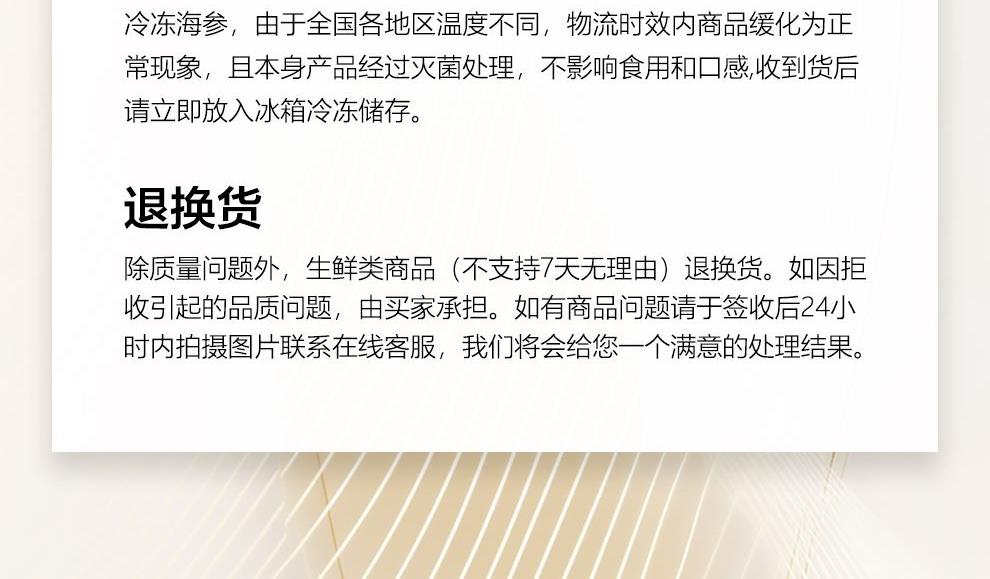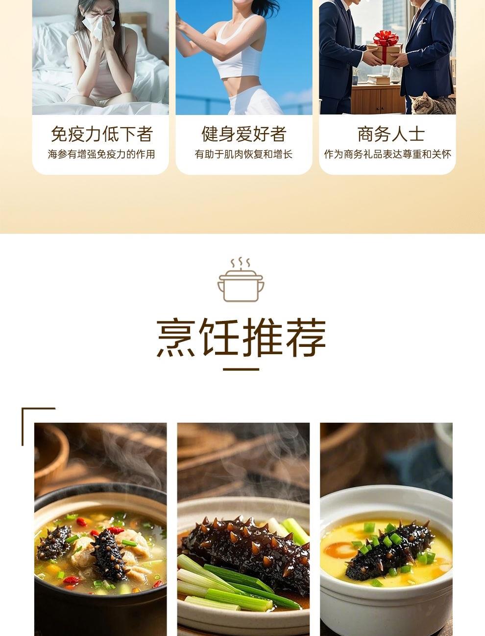 规格:大连即食海参750克(约14-25头) 卖点: 京润堂大连即食海参选自黄金海域北纬39°的辽参,海域环境好,水质清洁、温度适宜,海参品质高。选取参龄5年以上的辽参,富含多种营养成分,如高蛋白含量,海参粘多糖, 维生素和多种微量元素,具有调节体质、抗疲劳、抗肿瘤等潜在功效。