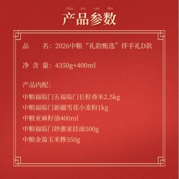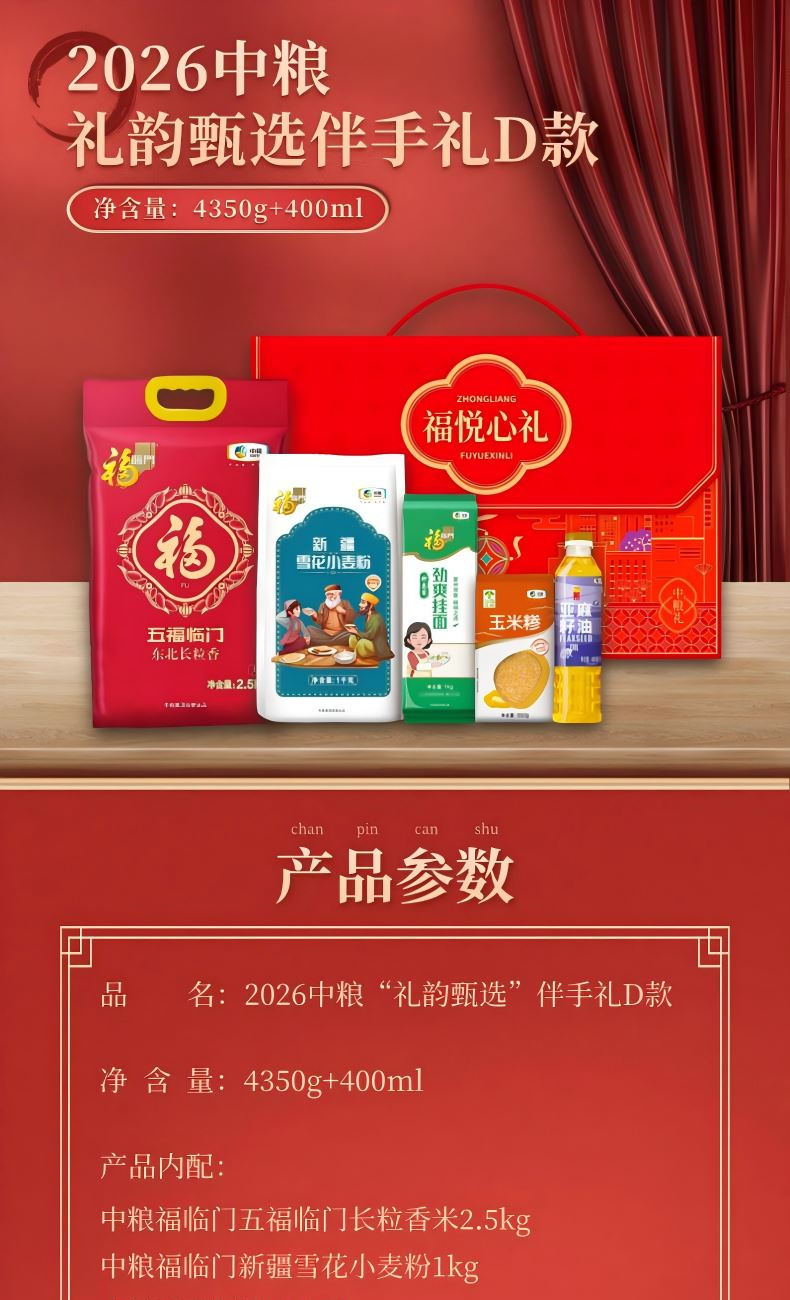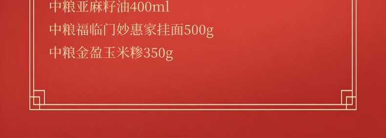 净含量:4350g+400ml 内 配: 中粮福临门五福临门长粒香米2.5kg 中粮福临门新疆雪花小麦粉1kg 中粮亚麻籽油400ml 中粮福临门妙惠家挂面500g 中粮金盈玉米糁350g 推荐理由: 央企品质保障,全产业链品控 1-中粮集团背书,从田间到餐桌全链路严控,严苛品控与标准化管理,安全放心。 高营养全谷物,保留原生营养 2-富含膳食纤维、B 族维生素与矿物质;精碾磨 / 稳态化技术,做到 “粗粮细口感”,营养与口感兼得。 产地优选 + 科学配比,实用更省心 3-东北 / 高原等优质产区原料,多品类组合、科学搭配,适配轻食 / 控糖 / 全家日常,一站式配齐。