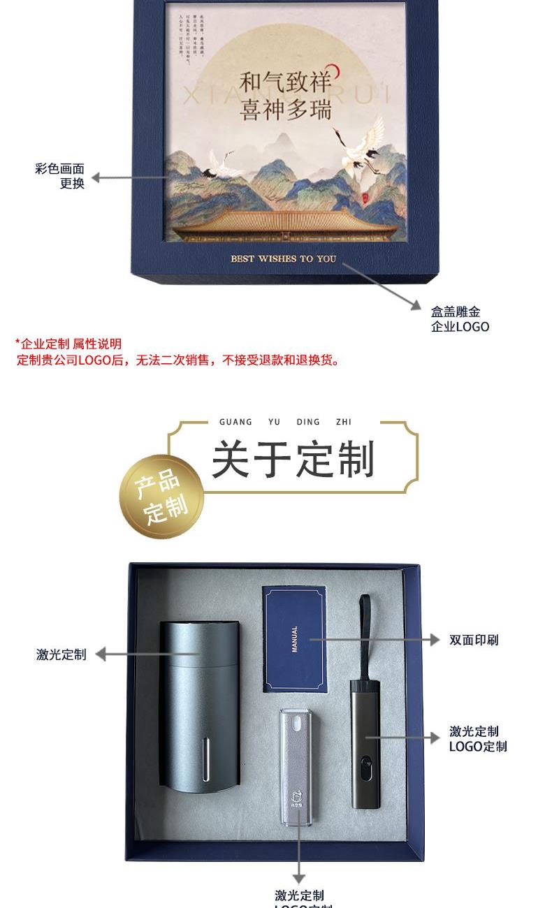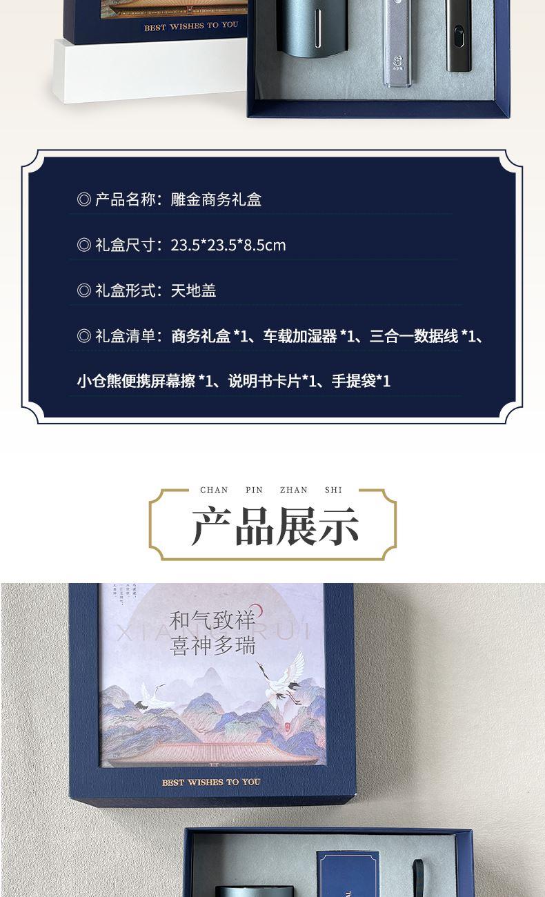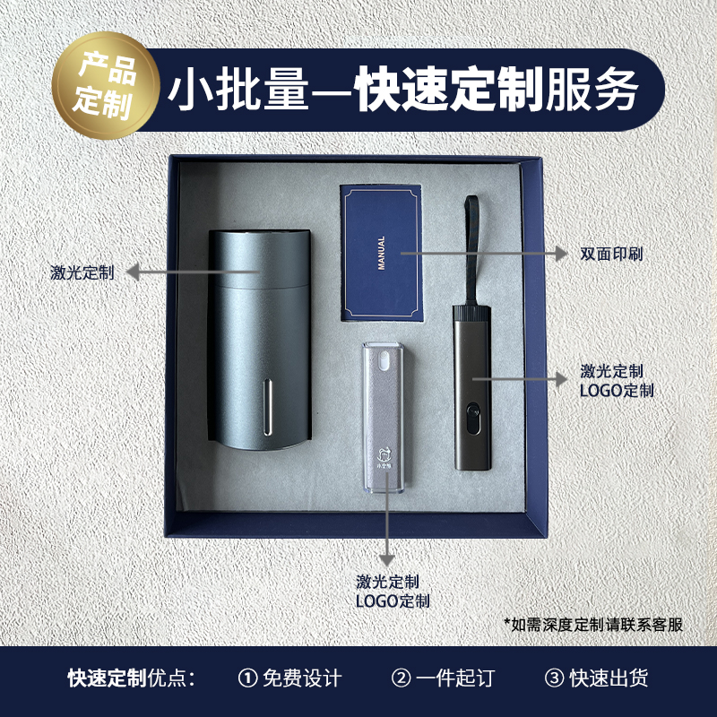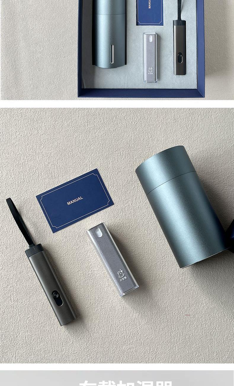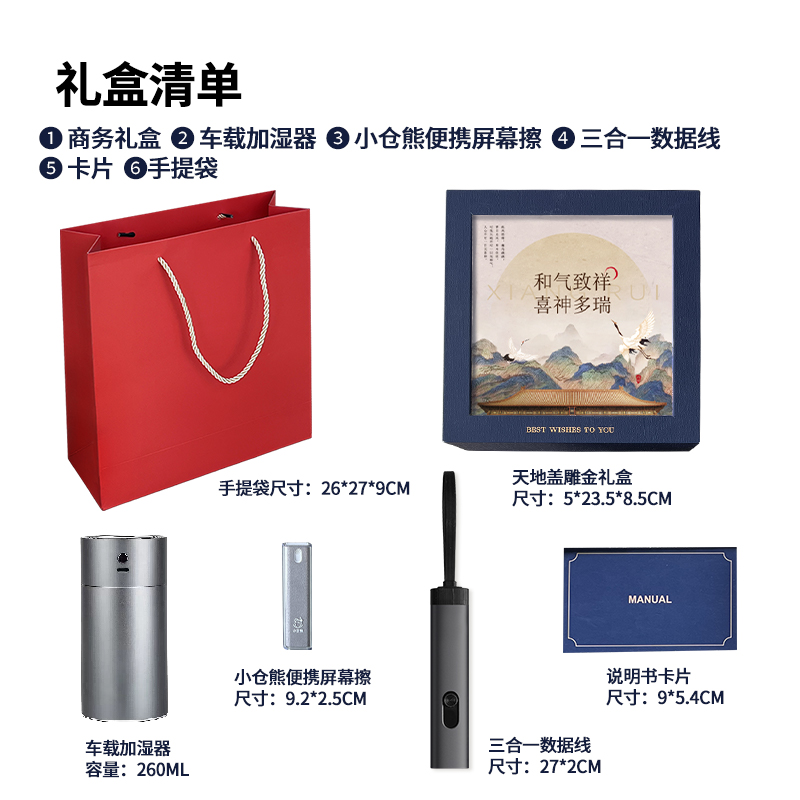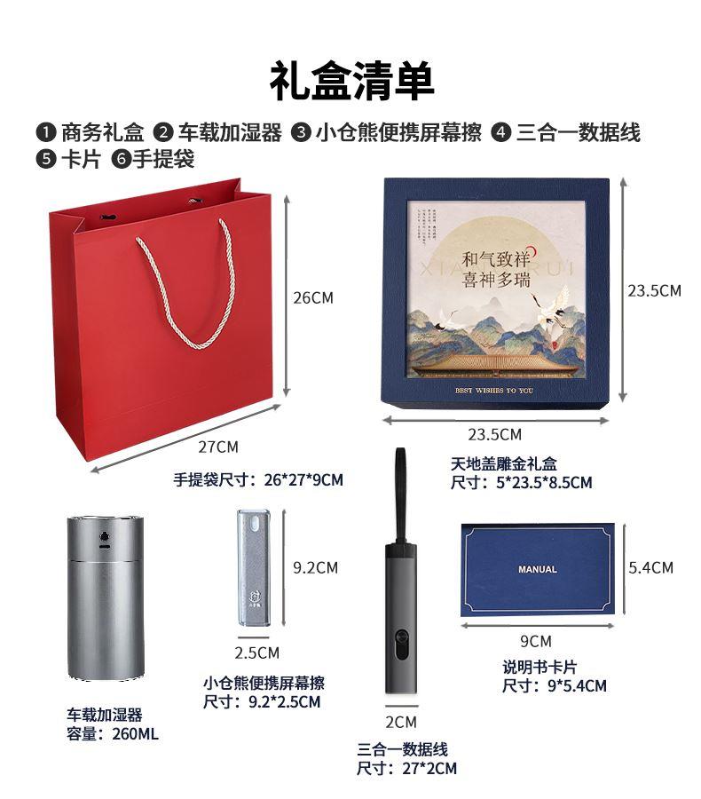 ❶ 车载香薰加湿器 容量:260ml 喷雾量:25-40ml/h 工作电流:250-350mA 额定功率:1.5-2w ❷ 便携屏幕擦 适用于:汽车屏幕、手机、平板电脑等平板屏幕 可重复使用(可按压120次) 尺寸:9.2*2.5cm ❸ 三合一数据线 尺寸:27*2cm,材质:铝壳+TPE+纯铜 净重:52g 电流:3A 接口:USB/安卓/苹果/TYPE-C ❹ 手提袋 材质:250g白卡 尺寸:26*27*9cm