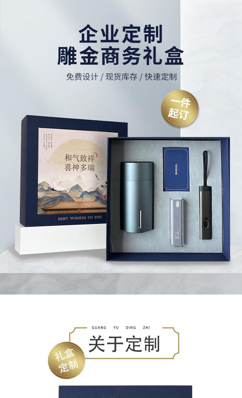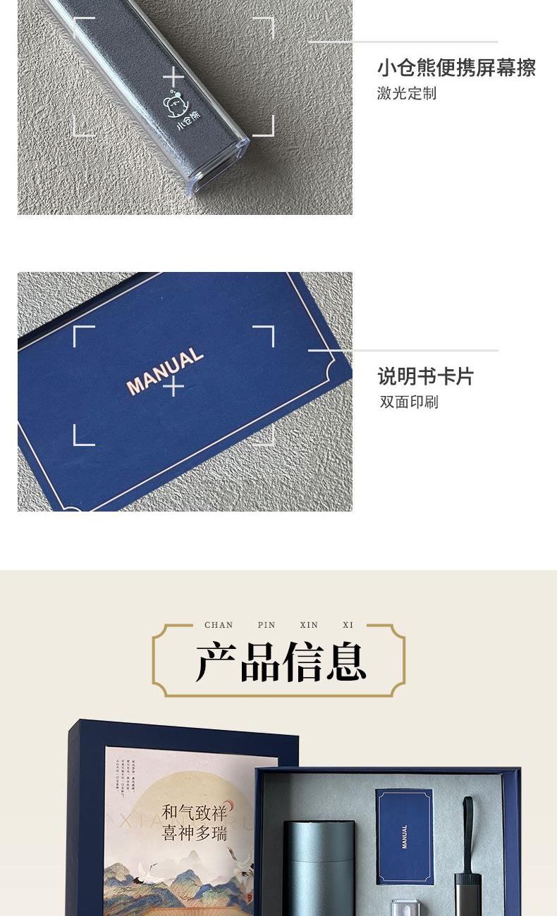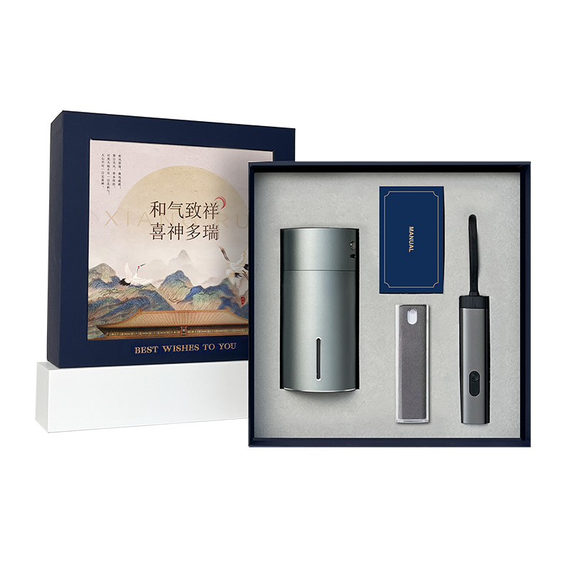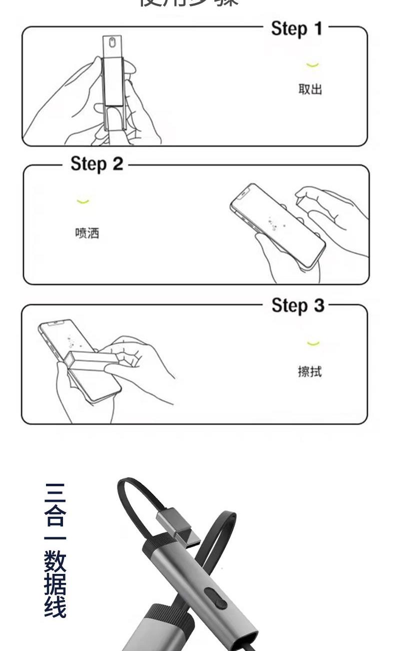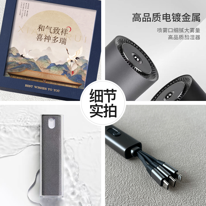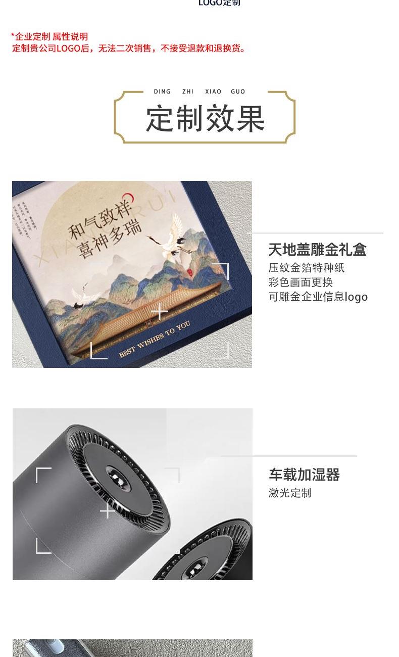 ❶ 车载香薰加湿器 容量:260ml 喷雾量:25-40ml/h 工作电流:250-350mA 额定功率:1.5-2w ❷ 便携屏幕擦 适用于:汽车屏幕、手机、平板电脑等平板屏幕 可重复使用(可按压120次) 尺寸:9.2*2.5cm ❸ 三合一数据线 尺寸:27*2cm,材质:铝壳+TPE+纯铜 净重:52g 电流:3A 接口:USB/安卓/苹果/TYPE-C ❹ 手提袋 材质:250g白卡 尺寸:26*27*9cm