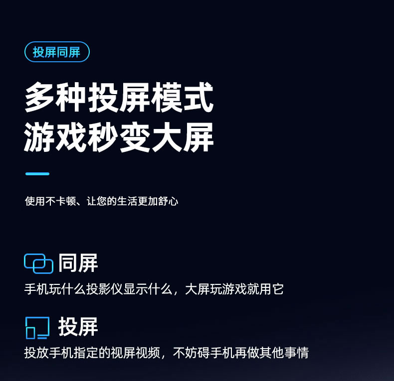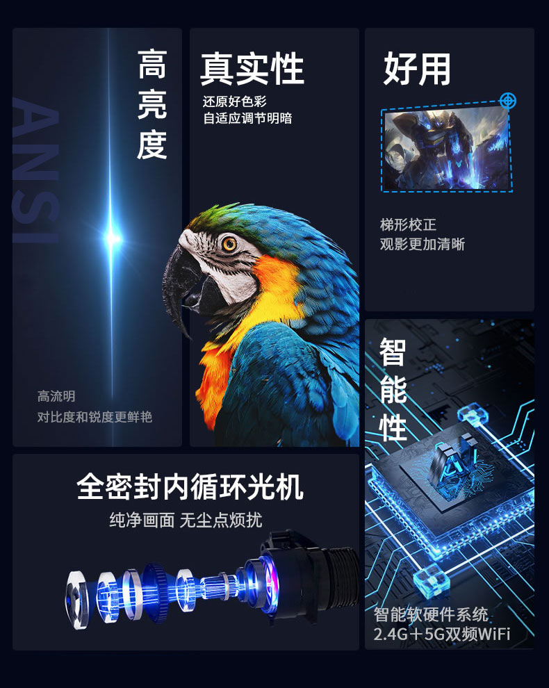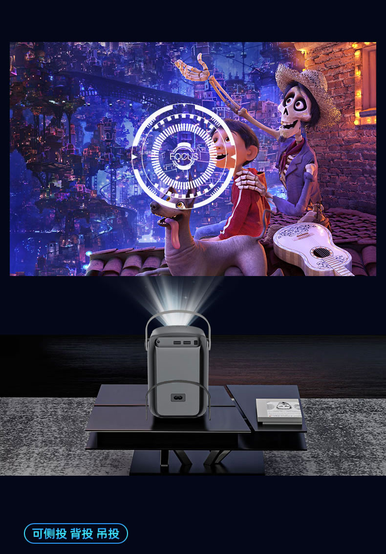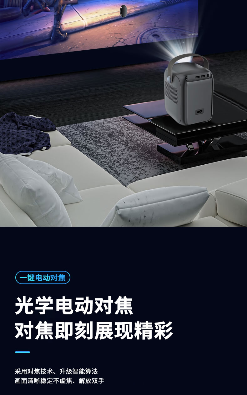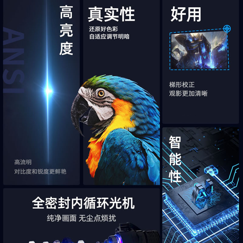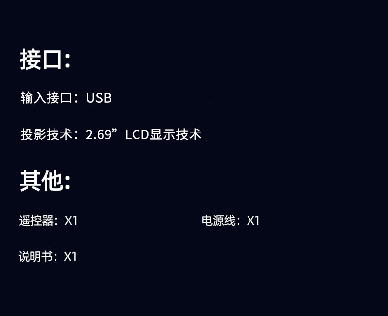 显示技术:LCD 光源:高节能长寿命:LED 标准分辨率:支持1080P解码 机身尺寸:约130x125x150mm 机身重量:约1kg 输入接口:USB/TF卡 屏幕尺寸:60-120对角线 调焦方式:手动 Ai语言声控:支持