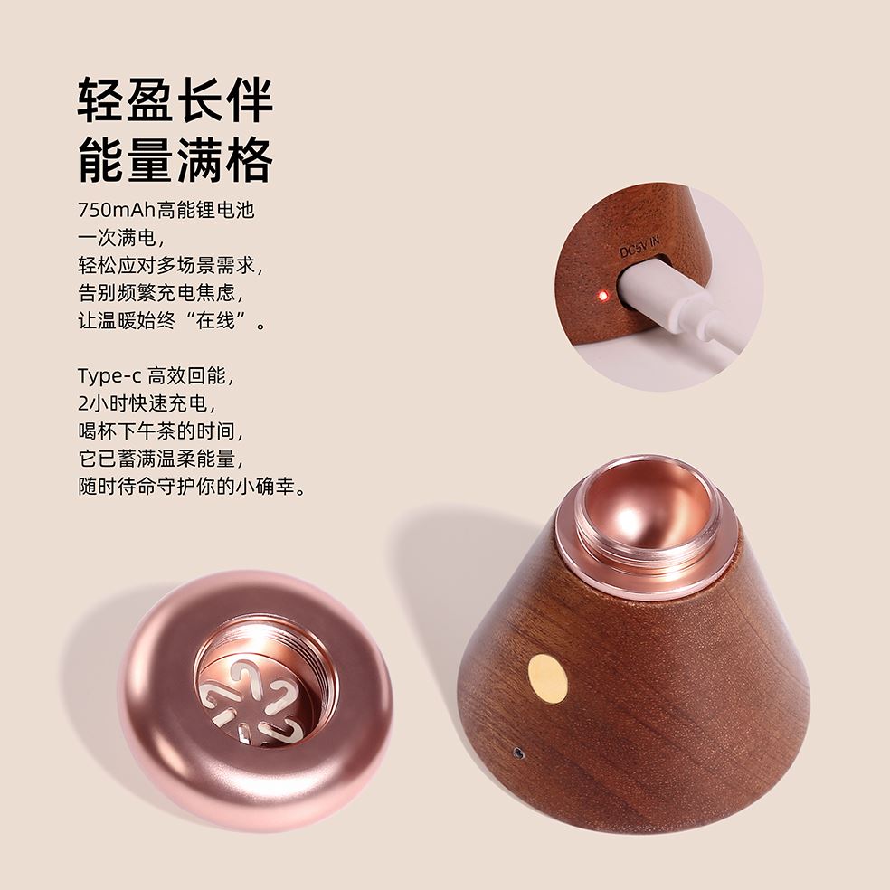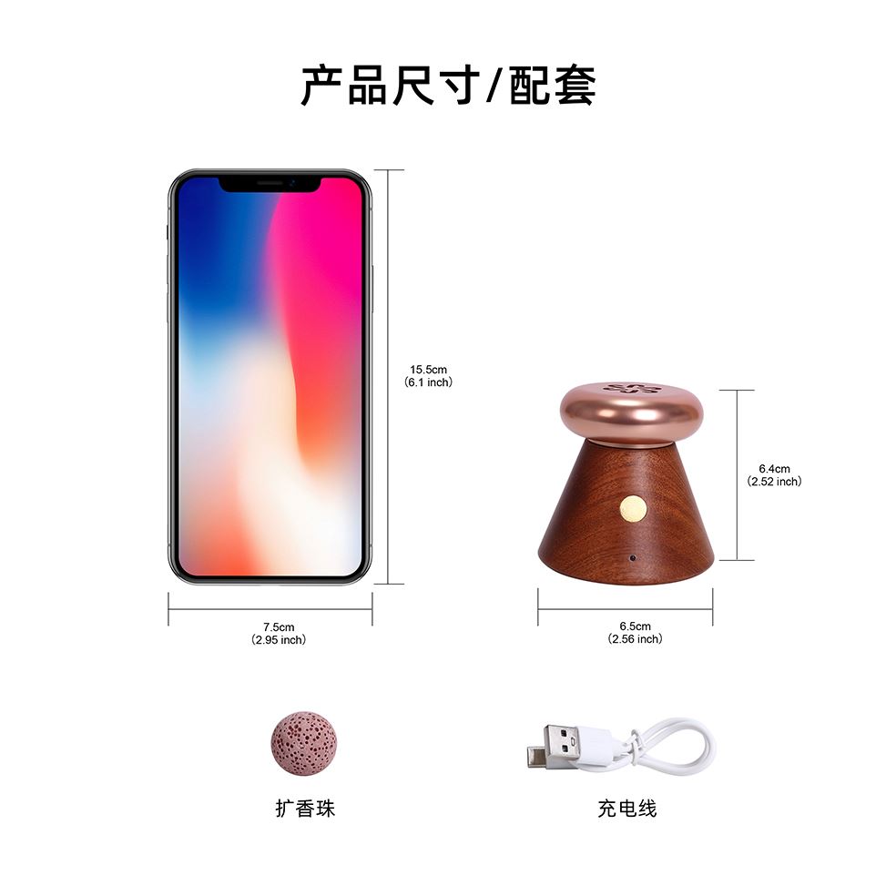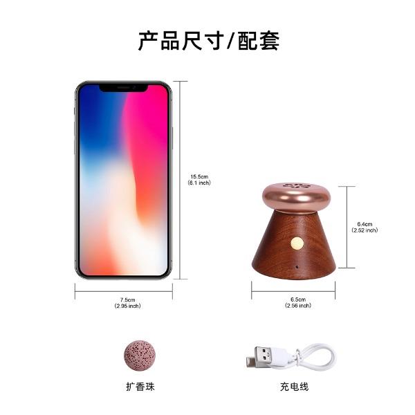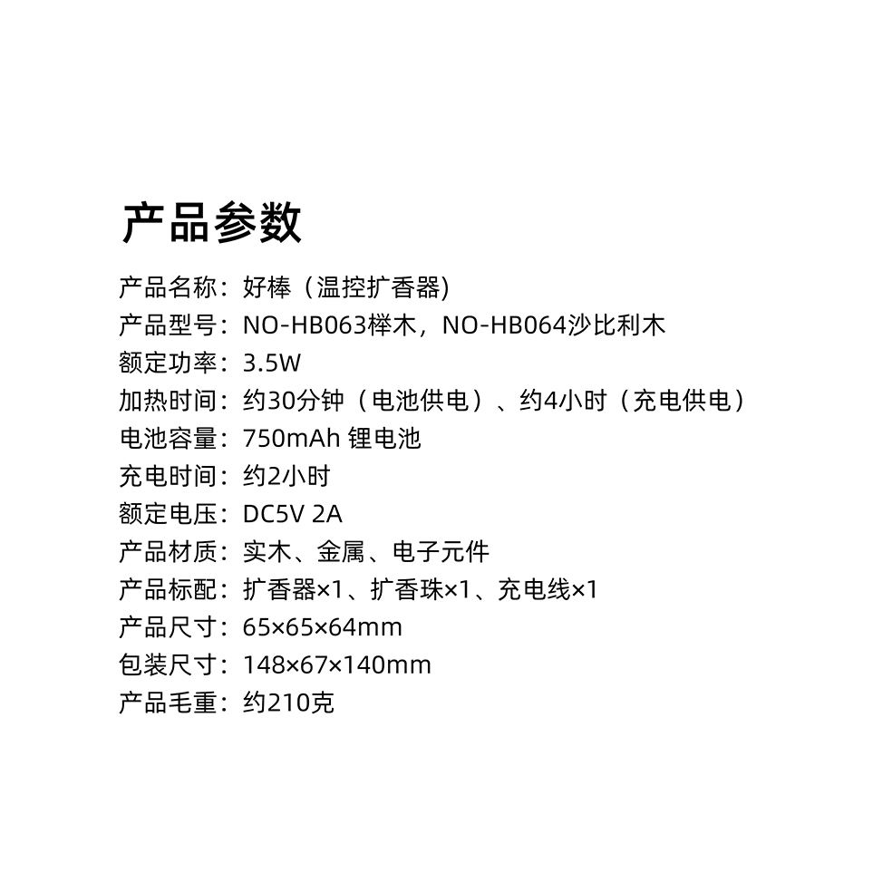 温控扩香器 产品型号:NO-HB063榉木,NO-HB064沙比利木 额定功率:3.5W 加热时间:约30分钟(电池供电)、约4小时(充电供电) 电池容量:750mAh 锂电池 充电时间:约2小时 额定电压:DC5V 2A 产品材质:实木、金属、电子元件 产品标配:扩香器x1、扩香珠x1、充电线x1 产品尺寸:65×65×64mm 包装尺寸: 产品毛重:约210克