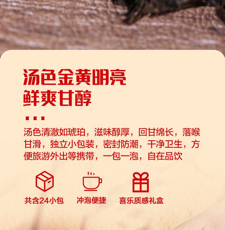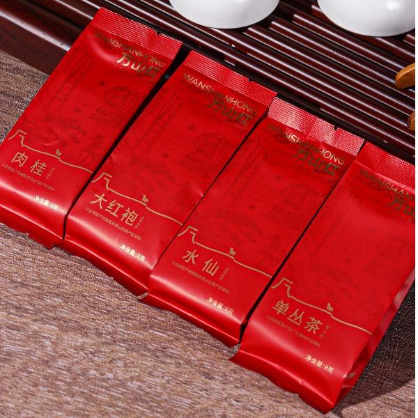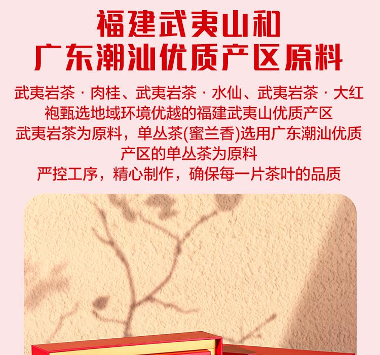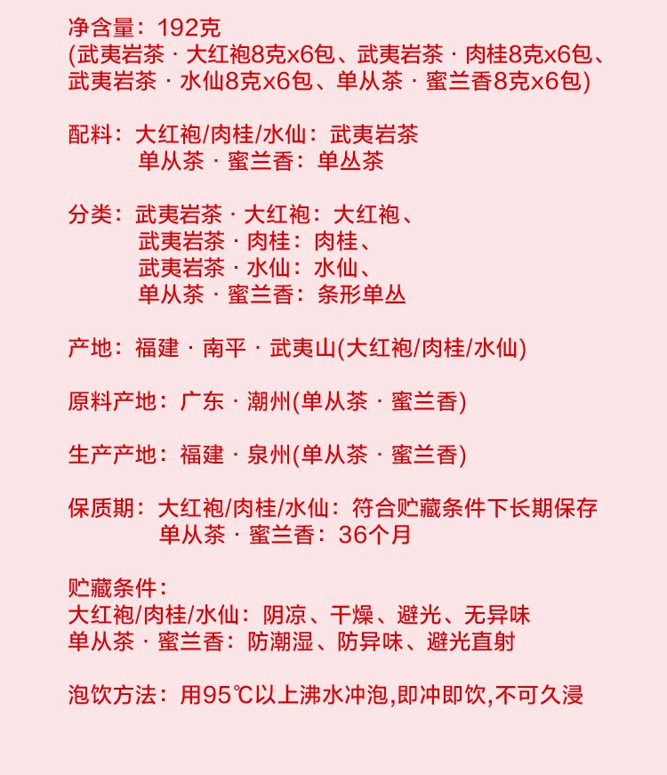 净含量:192克 (武夷岩茶·大红袍8克x6包、武夷岩茶·肉桂8克x6包、 武夷岩茶·水仙8克x6包、单从茶·蜜兰香8克x6包) 产地:福建·南平·武夷山(大红袍/肉桂/水仙) 生产产地:福建·泉州(单从茶·蜜兰香) 保质期:大红袍/肉桂/水仙:符合贮藏条件下长期保存 单从茶·蜜兰香:36个月 贮藏条件: 大红袍/肉桂/水仙:阴凉、干燥、避光、无异味 单从茶·蜜兰香:防潮湿、防异味、避光直射 泡饮方法:用95℃以上沸水冲泡,即冲即饮,不可久浸