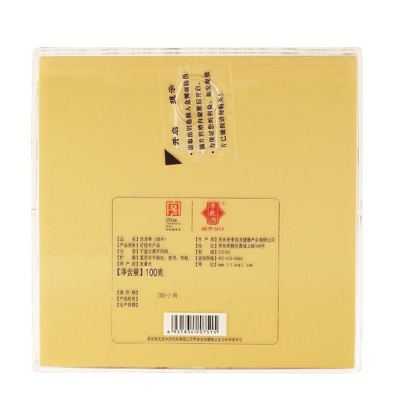 产品:李良济西洋参礼盒(此参有礼) 规格:100克 用法与用量:开水冲泡,每日建议食用量3-6克 贮藏方法:置阴凉干燥处,密封,防蛀 加拿大进口西洋参,包装精美 足龄老参,片薄均匀