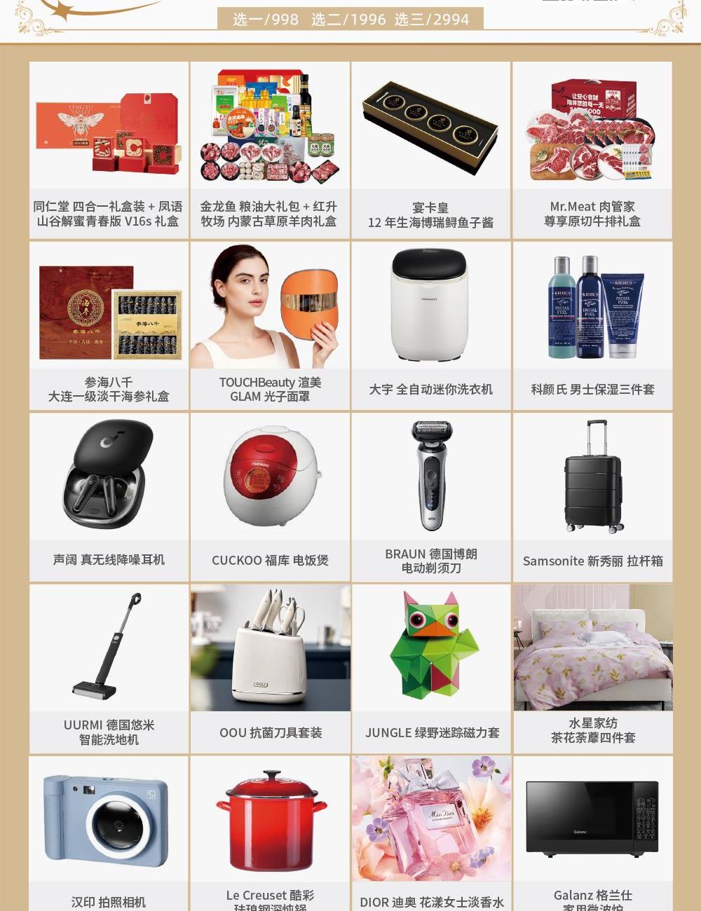 选项1 宴卡皇 12年生海博瑞鲟鱼子酱礼盒 选项2 同仁堂 四合一礼盒装+凤语山谷 解蜜青春版V16s礼盒 选项3 Mr.Meat肉管家尊享原切牛排礼盒 选项4 金龙鱼 粮油大礼包+红升牧场 内蒙古草原羊肉礼盒 选项5 参海八千 大连一级淡干海参礼盒 选项6 TOUCHBeauty渲美 GLAM光子面罩 选项7 大宇 全自动迷你洗衣机 选项8 科颜氏 男士保湿三件套 选项9 声阔 真无线降噪耳机 选项10 CUCKOO福库 电饭煲 选项11 BRAUN德国博朗 电动剃须刀 选项12 Samsonite新秀丽 拉杆箱 选项13 UURMI德国悠米 智能洗地机 选项14 OOU 白鲸系列套刀 选项15 JUNGLE 绿野迷踪磁力套-高阶 选项16 水星家纺 茶花荼蘼四件套 选项17 汉印 拍照相机 选项18 Le Creuset酷彩 珐琅钢深炖锅 选项19 迪奥 花漾女士淡香水 选项20 Galanz格兰仕 家用微波炉