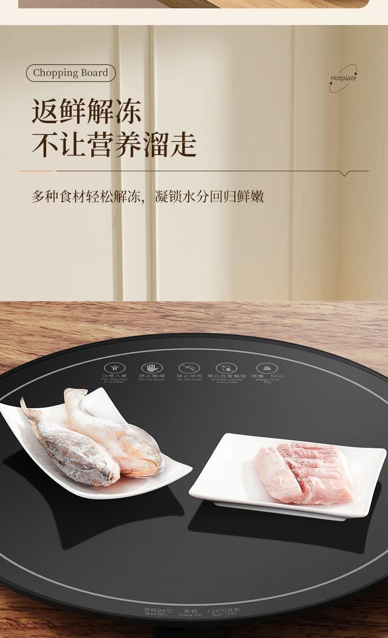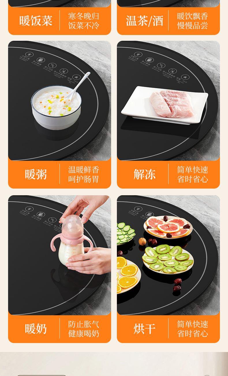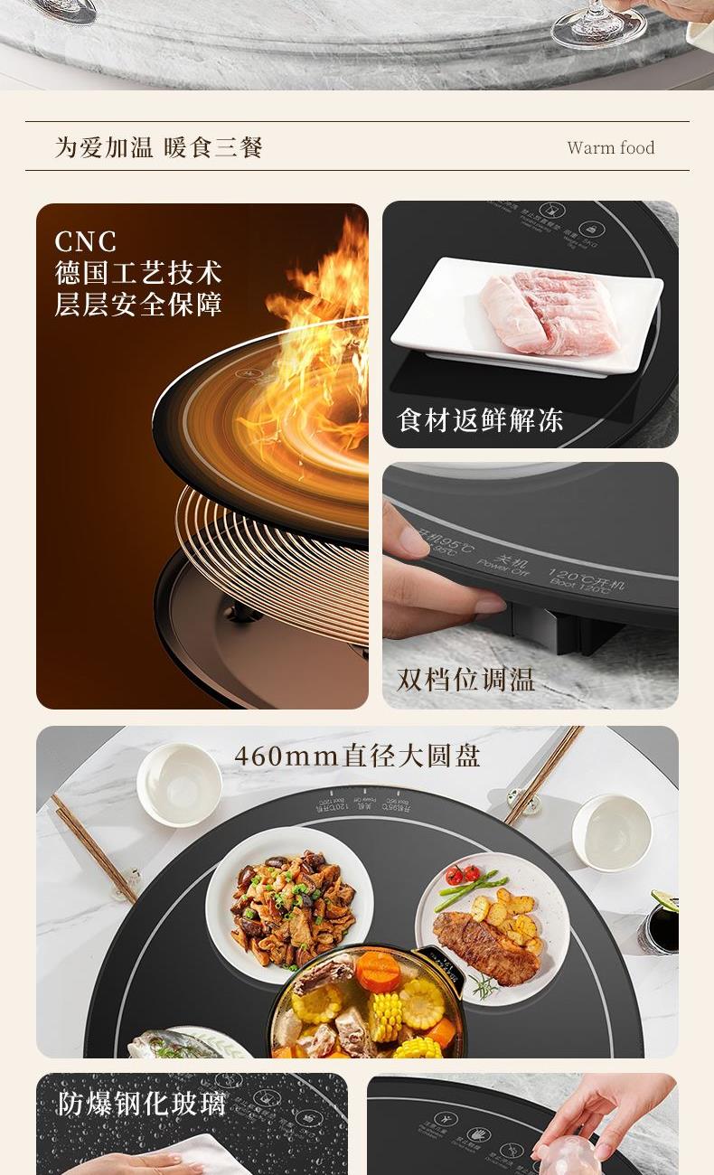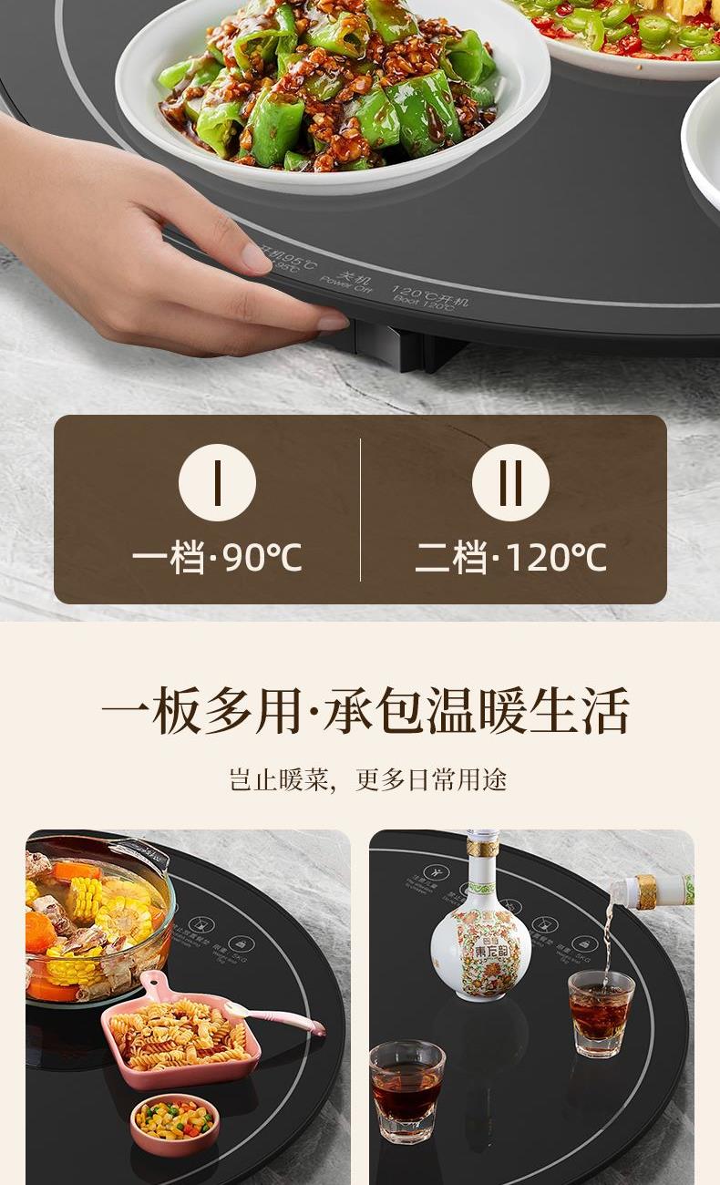 材质:pp+钢化玻璃+ 接口八字线 产品重量:2.1kg 产品尺寸:46*46*3cm 彩盒尺寸:48.6*6.5*51cm 外箱尺寸:70*52*49.2cm(20.3kg) 额定电压:220V额定功率:500W额定频率:50HZ 产品特点: 一键启动95-120℃调温,不挑餐具,拒绝冷饭菜,快速加热,满足4-5口人使用。 花式暖实力,暖在方方面面--暖菜/暖茶/暖汤/解冻 注意事项:注意儿童/禁止折叠加热/禁止冲洗/禁止放置餐垫/限重5KG/90-120度