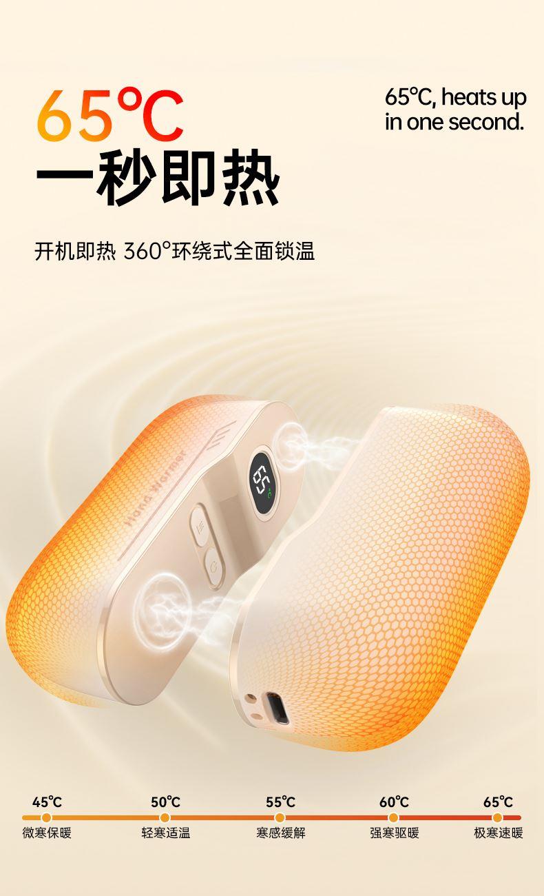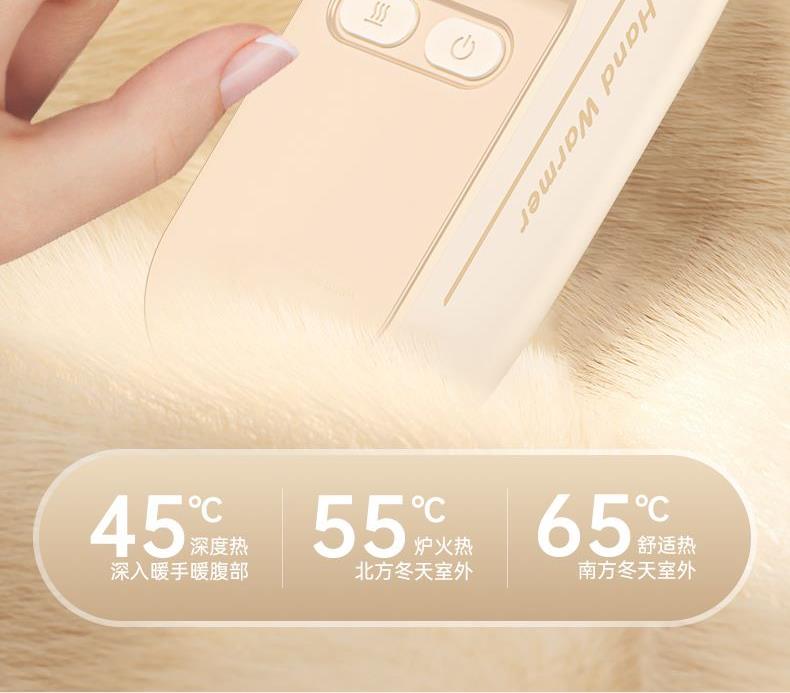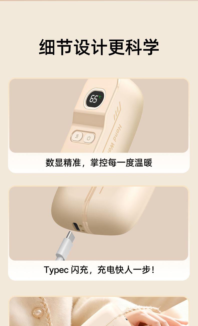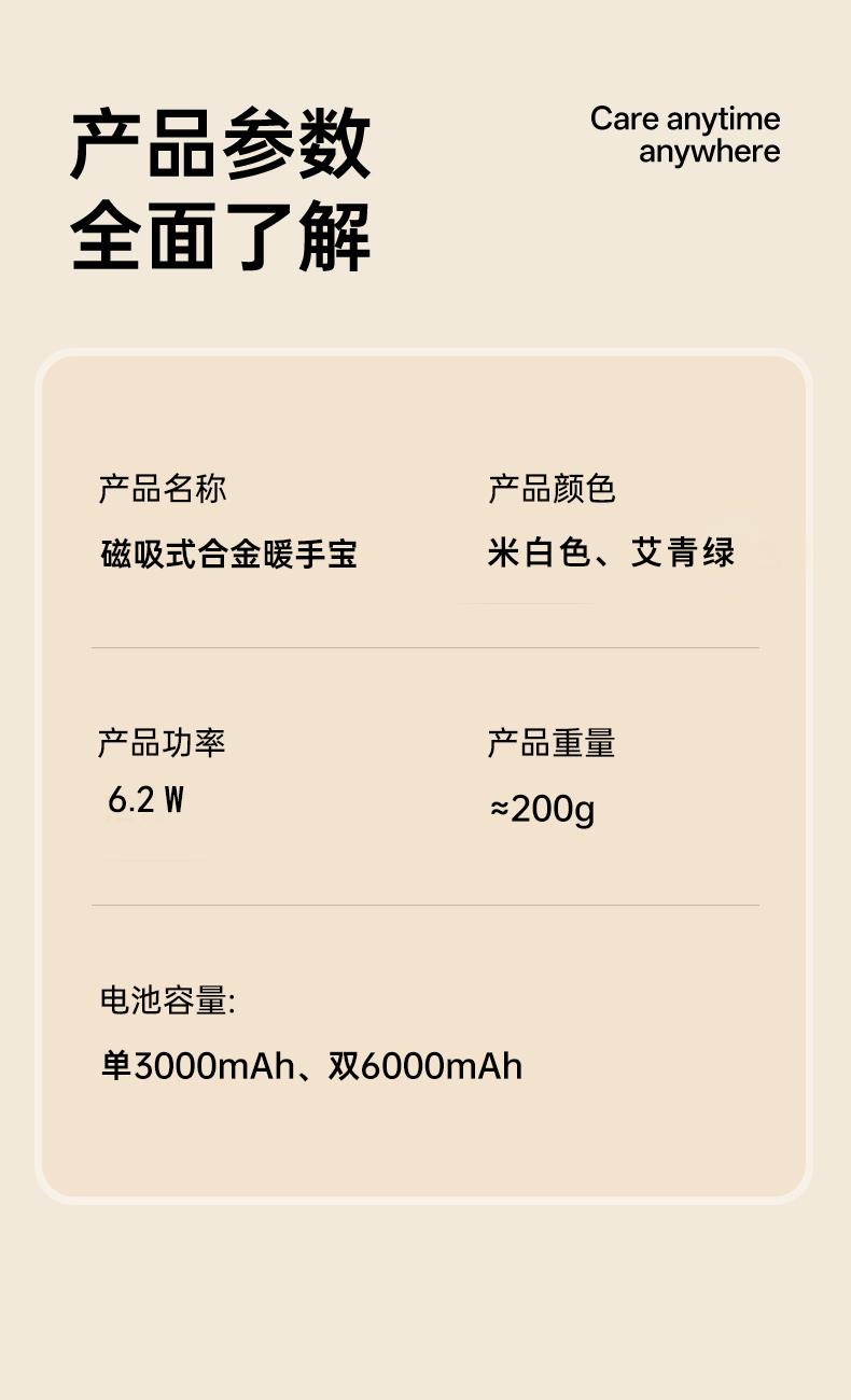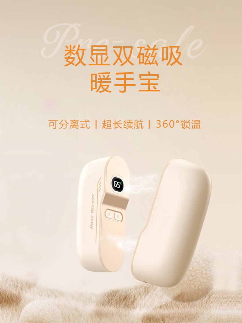 额定电压:5V/1Amax 额定功率:6.2W 产品毛重:268.4g 产品颜色:米白色 电池容量:双边6000mAh 产品尺寸:94*32*71.5mm 主要材质:铝合金 1.内置6000mAh电池,超长续航 2.Type-C充电,同时充俩,方便快捷 3.智能数显屏幕,电量、温度实时显示 4.5档温度调节,一秒即热,冷暖由你掌控 5.可分离磁吸组合设计,合并、单独取暖皆可