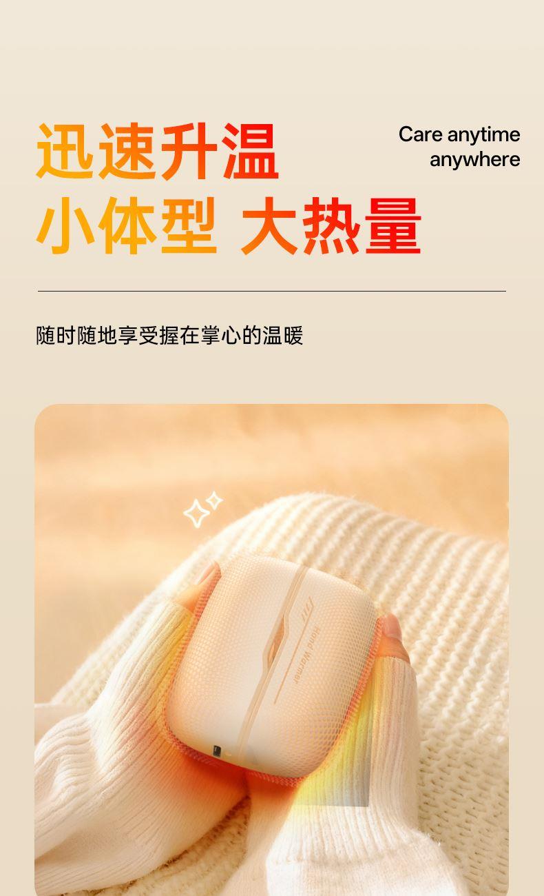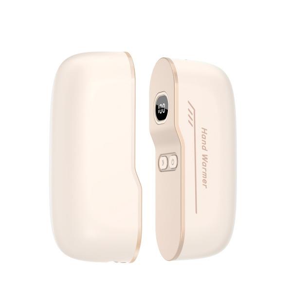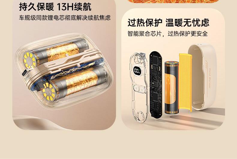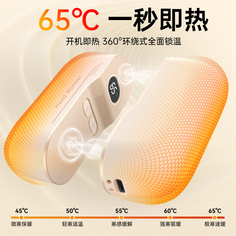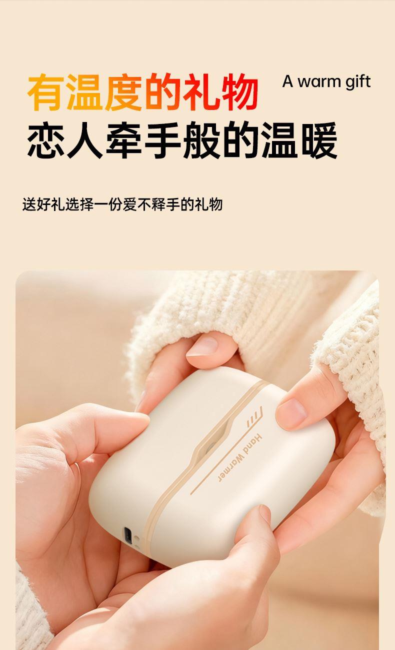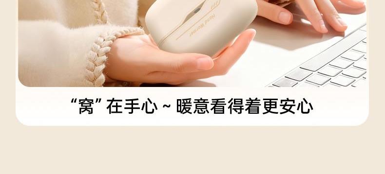 额定电压:5V/1Amax 额定功率:6.2W 产品毛重:268.4g 产品颜色:米白色 电池容量:双边6000mAh 产品尺寸:94*32*71.5mm 主要材质:铝合金 1.内置6000mAh电池,超长续航 2.Type-C充电,同时充俩,方便快捷 3.智能数显屏幕,电量、温度实时显示 4.5档温度调节,一秒即热,冷暖由你掌控 5.可分离磁吸组合设计,合并、单独取暖皆可