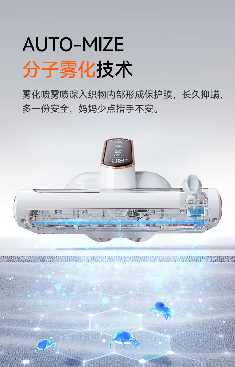 产品参数: 功率 150W 吸力 13000Pa 拍打宽度:215mm 电源线长度:无线 拍打频率:36000次/min 电池容量:26000mAh 产品描述: 1.无线除螨仪 ,随吸随走更轻松 2.特调高效除螨液 ,安全认证放心使用 双尘杯尘气分离 ,一倒即净 3.大屏显示尘螨指数 ,告别盲目除螨 4.两档除螨模式自由切换