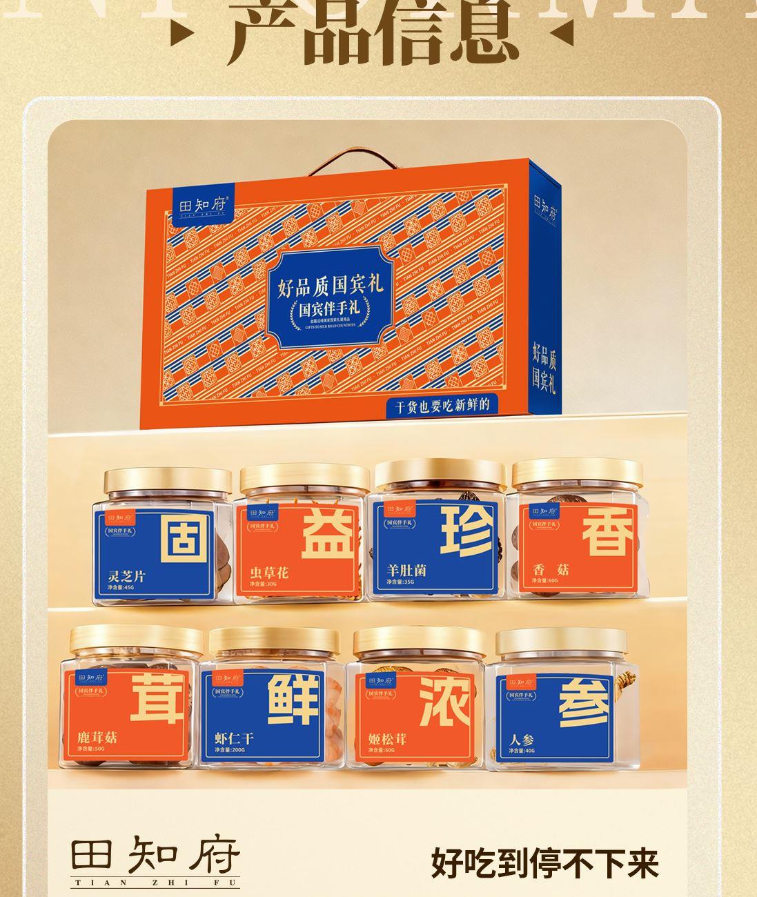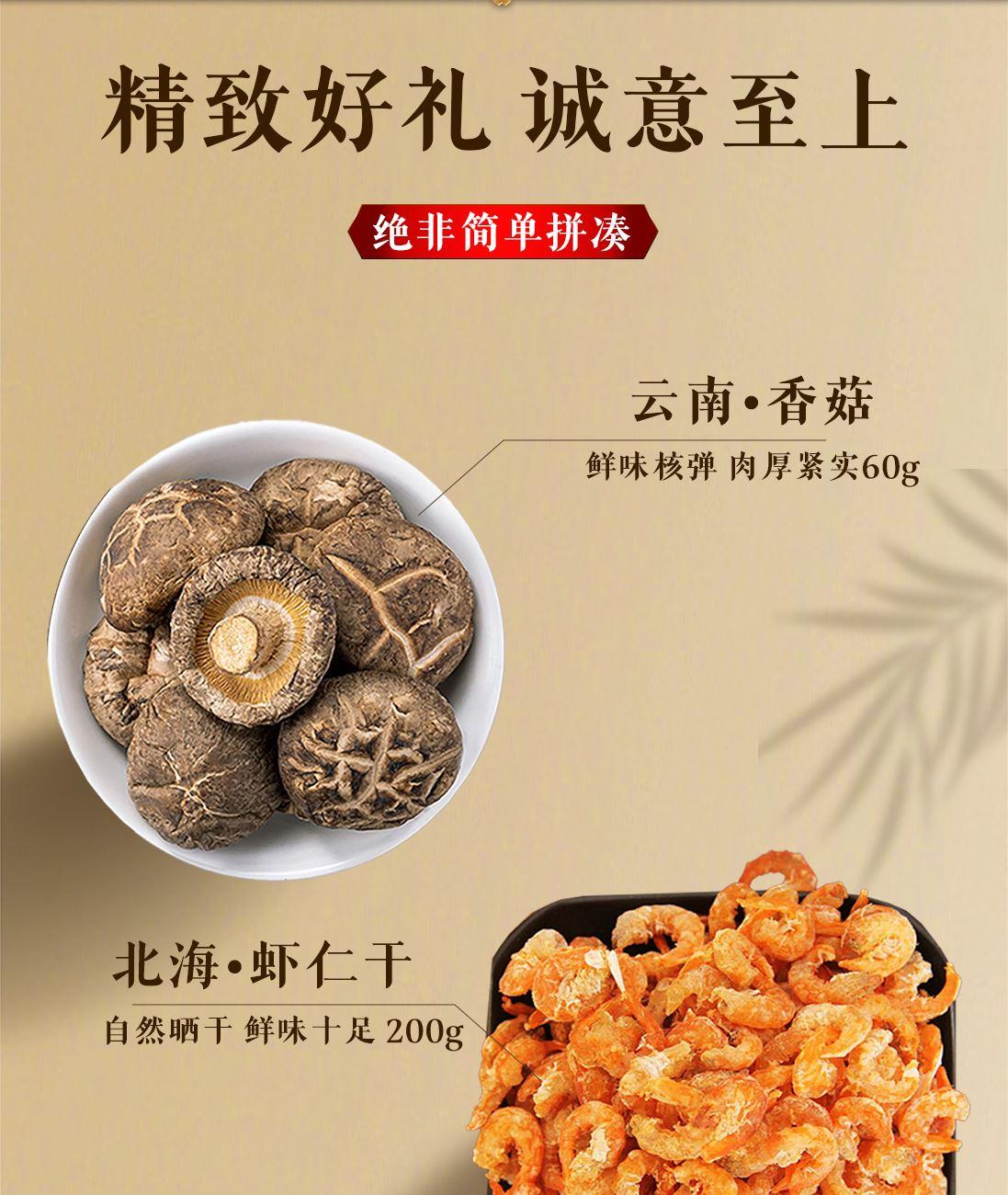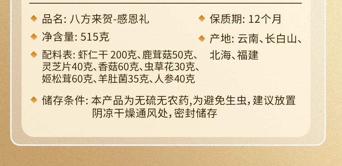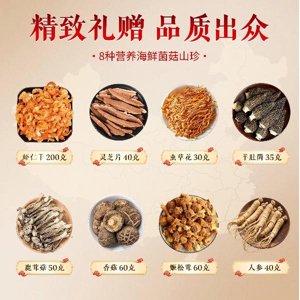 配置:虾仁干 200g、鹿茸菇 50g、灵芝片40g、香菇60g、虫草花30g、姬松茸60g、羊肚菌35g、人参40g 商品规格:515g/盒 产品尺寸:450*250*125mm 保质期:12个月 京东自营销量好评1w+,源头工厂,支持项目授权,项目保护