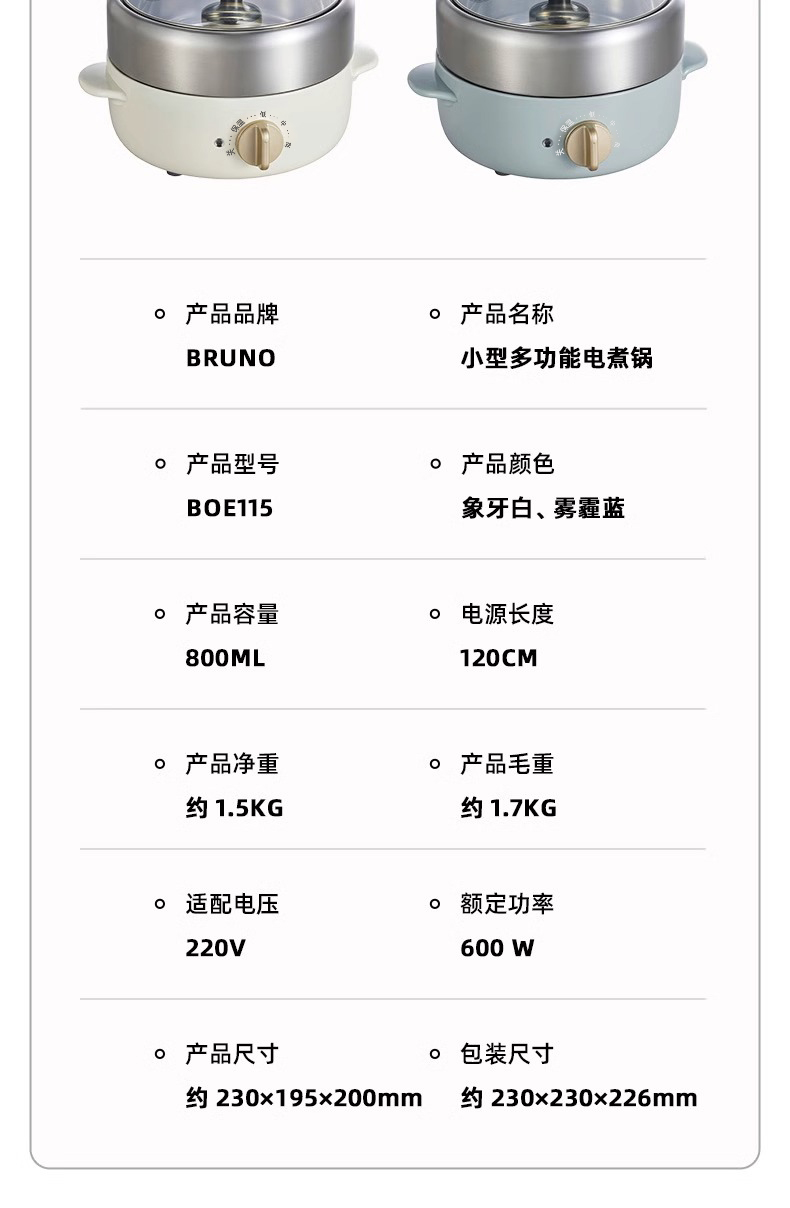 产品型号:BOE115 产品颜色:象牙白,雾霾蓝 产品容量:800ML 额定功率:600W 产品净重:约1.5KG 产品毛重:约1.7KG 产品尺寸:约230*195*200mm 包装尺寸:约230*230*226mm