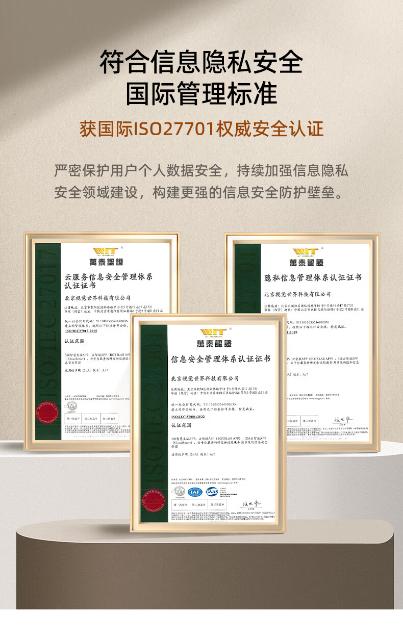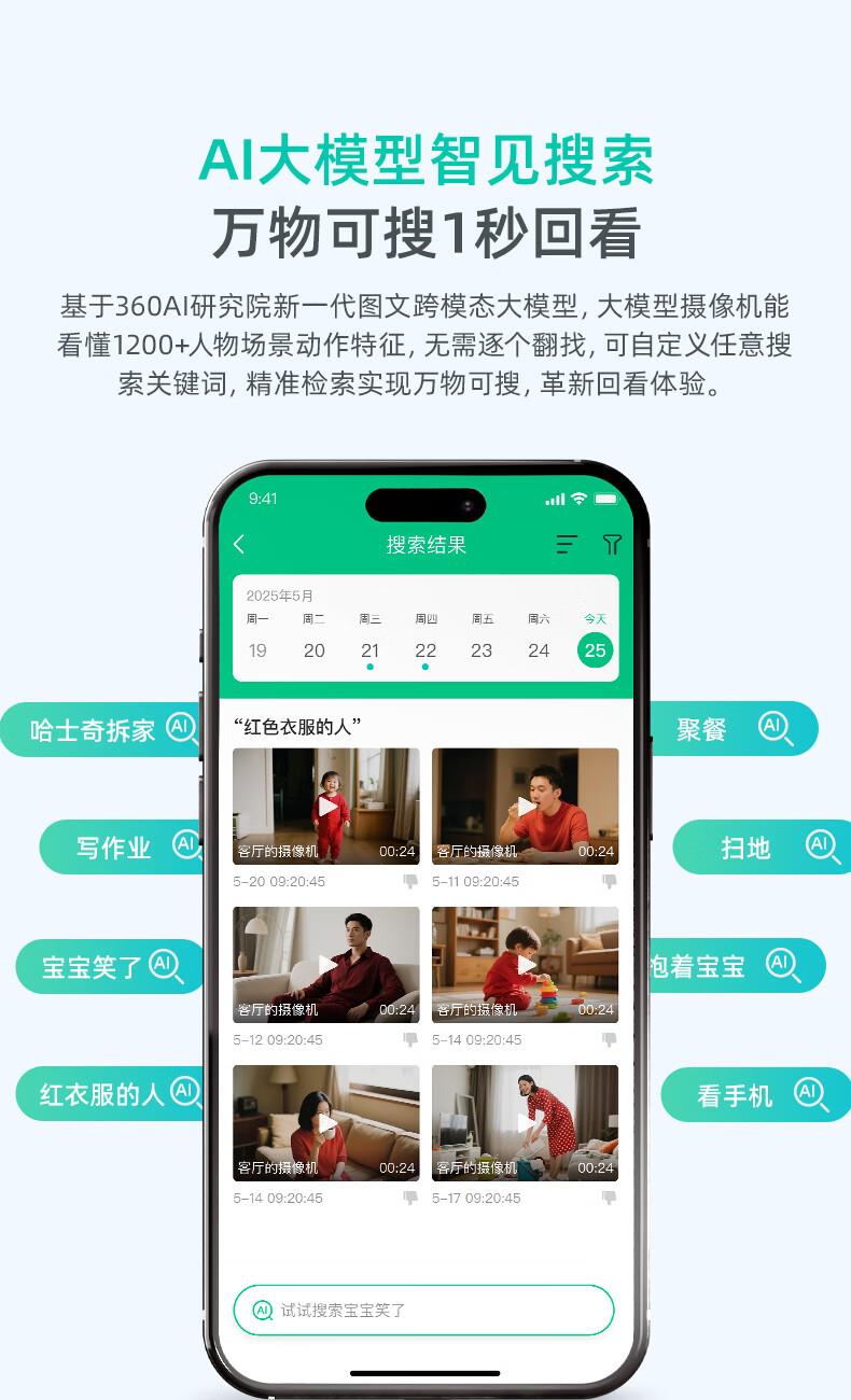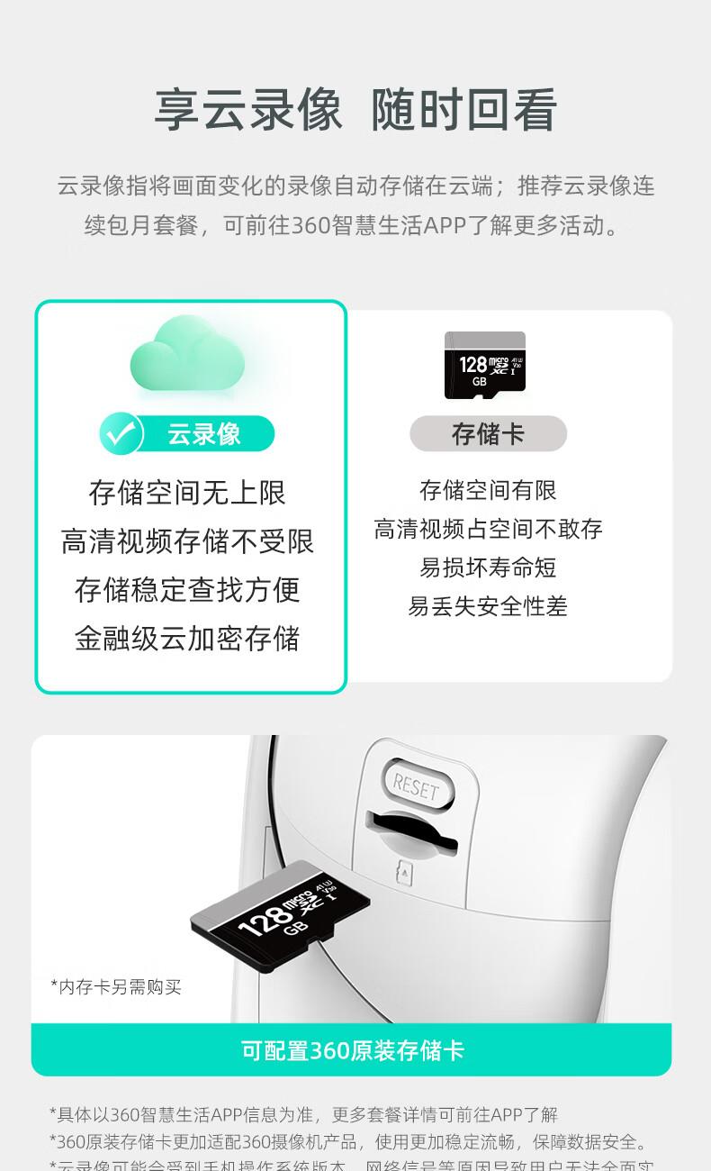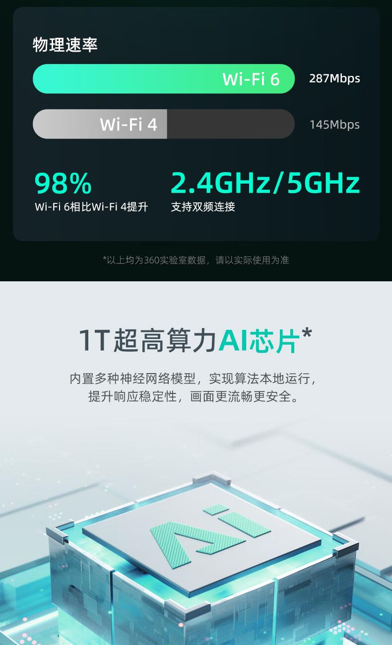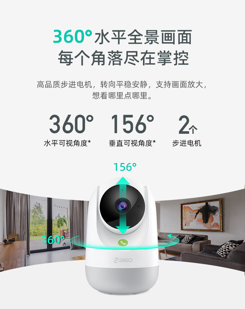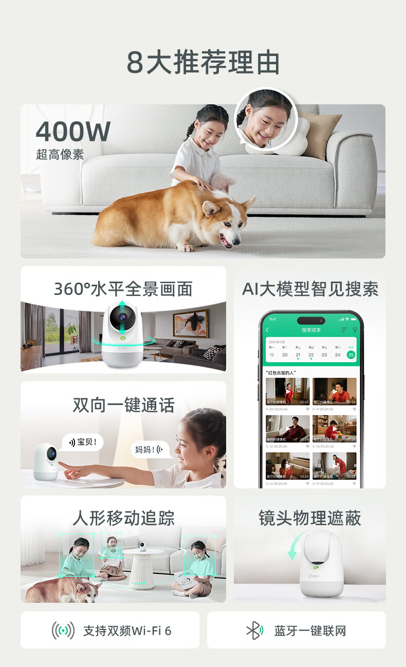 产品参数: 1、400W像素、旋转角度:水平360°,垂直156°、微光全彩。 2、重量:0.42kg、包装尺寸:95*90*160mm 产品功能: 1、360智能双频摄像头 2、看娃、看宠物、看老人、看门店多场景守护者 3、接入Deepseek,智能远程操纵设备,动嘴不动手 4、2.5K真高清 5、支持电脑、PC端、APP实时查看,满足不同场景使用:商超、仓库、餐饮等中小微企业客户,支持多人同时查看。(搭配360视觉云)
