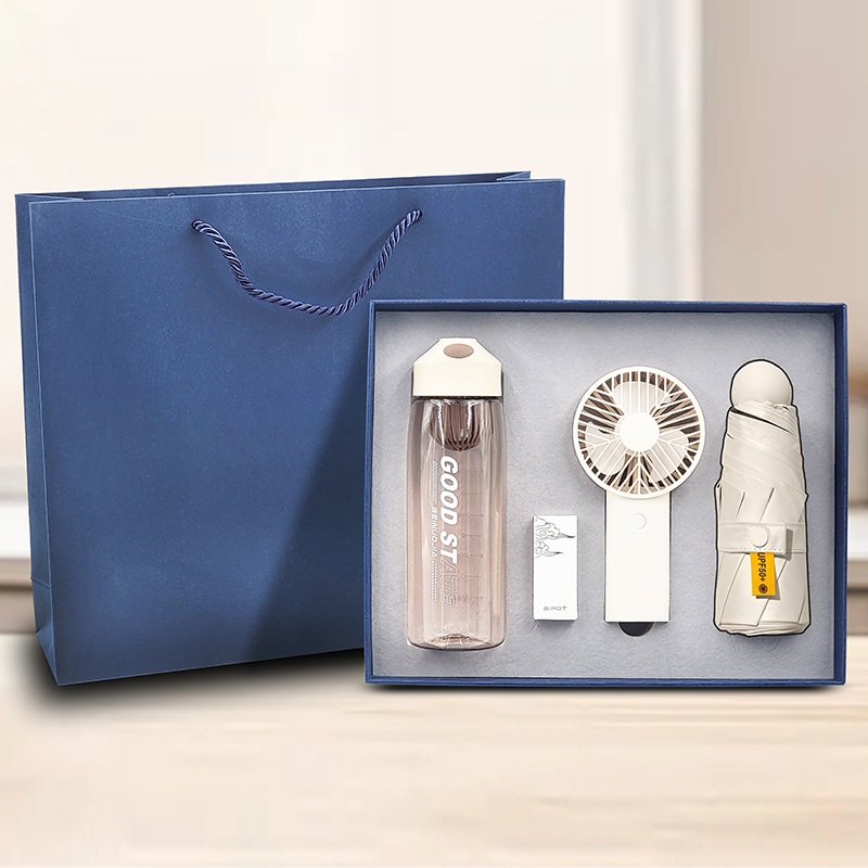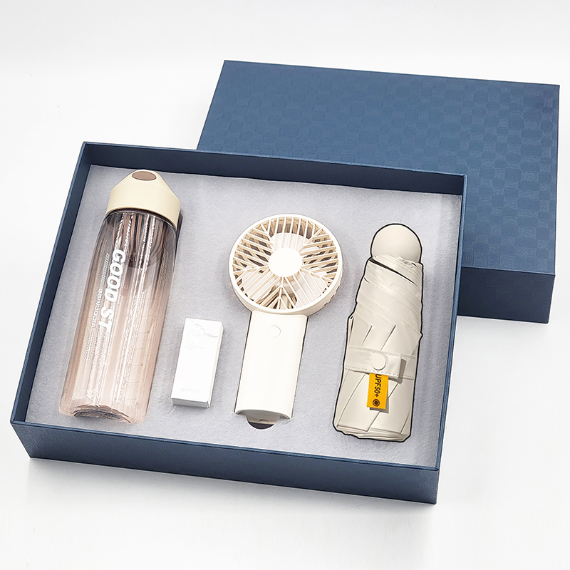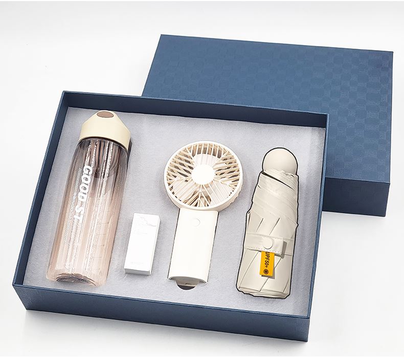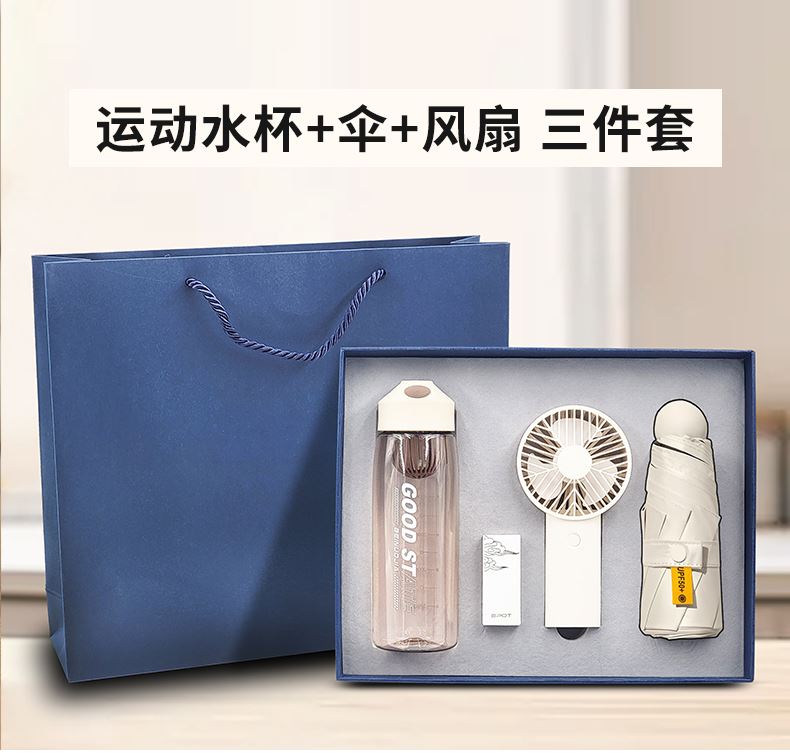 礼盒配置 : 1、550ml运动水杯;尺寸:208x68mm 2、风扇(三档调节风力、500mAh电池) 3、21寸5折6骨钢胶囊伞(高密度碰击黑胶布) 4、蓝色包装盒尺寸:328x263x75mm 5、蓝色手提袋尺寸:335x293x85mm 6、颜色:米白色 7、重量:27kg/箱