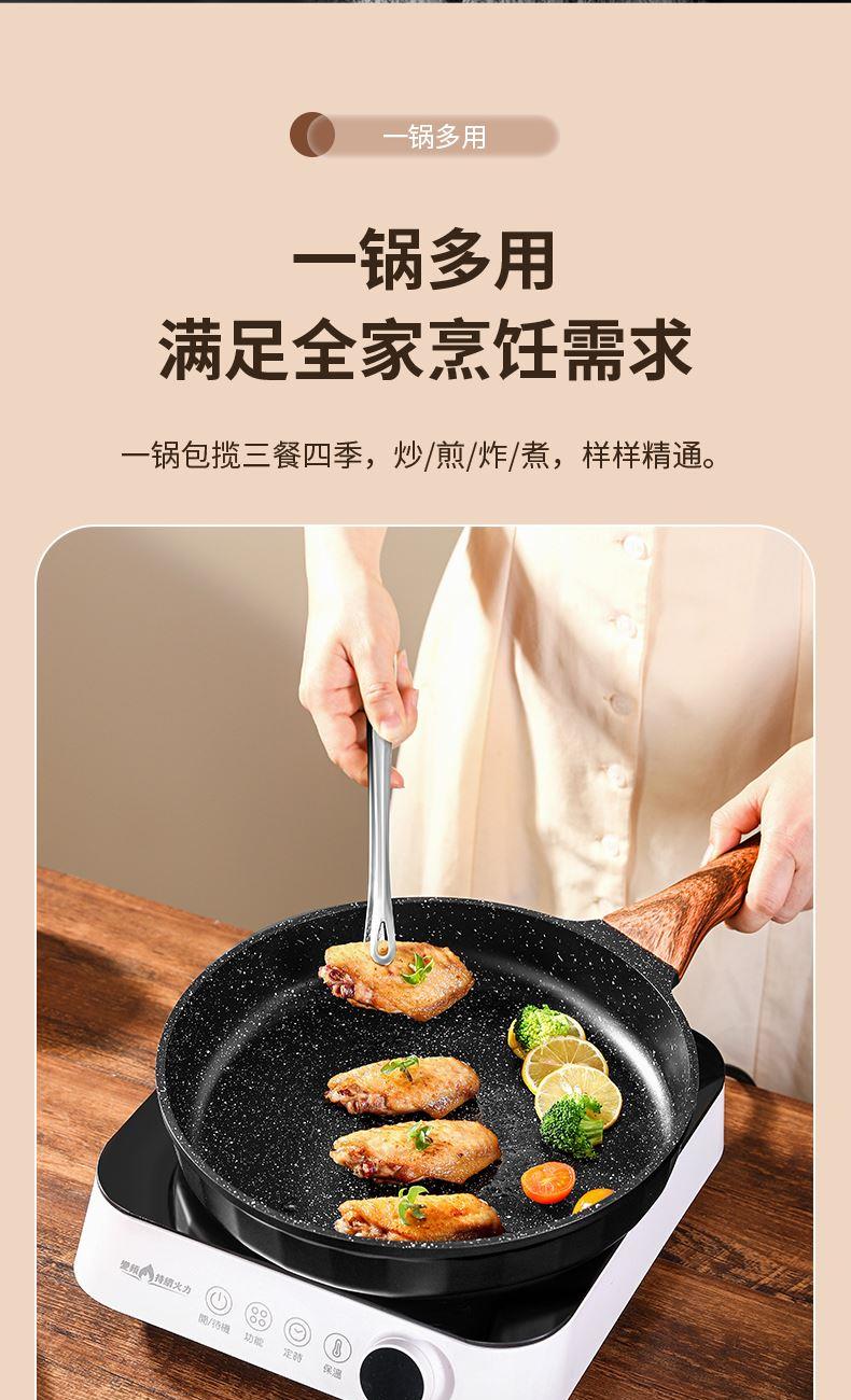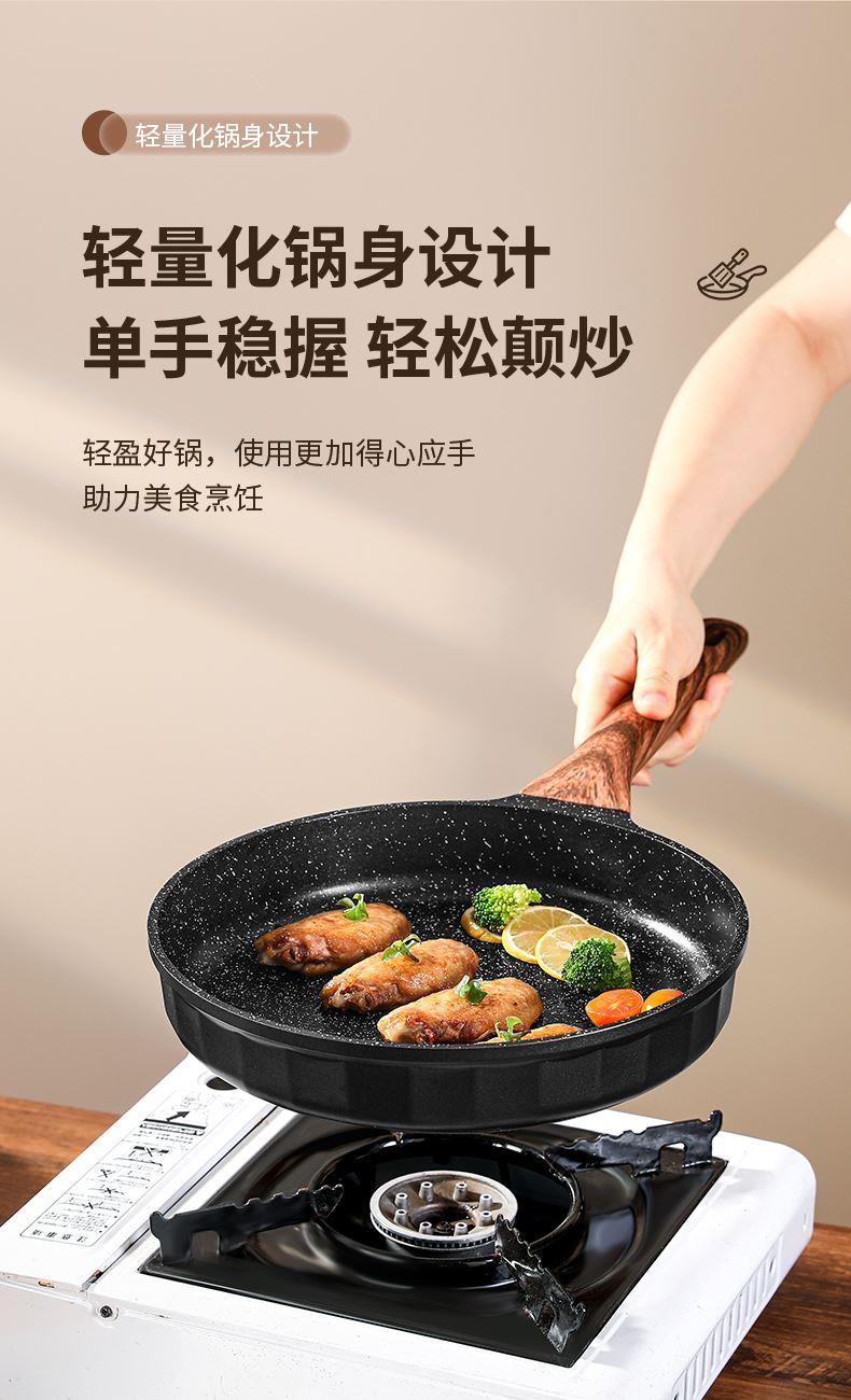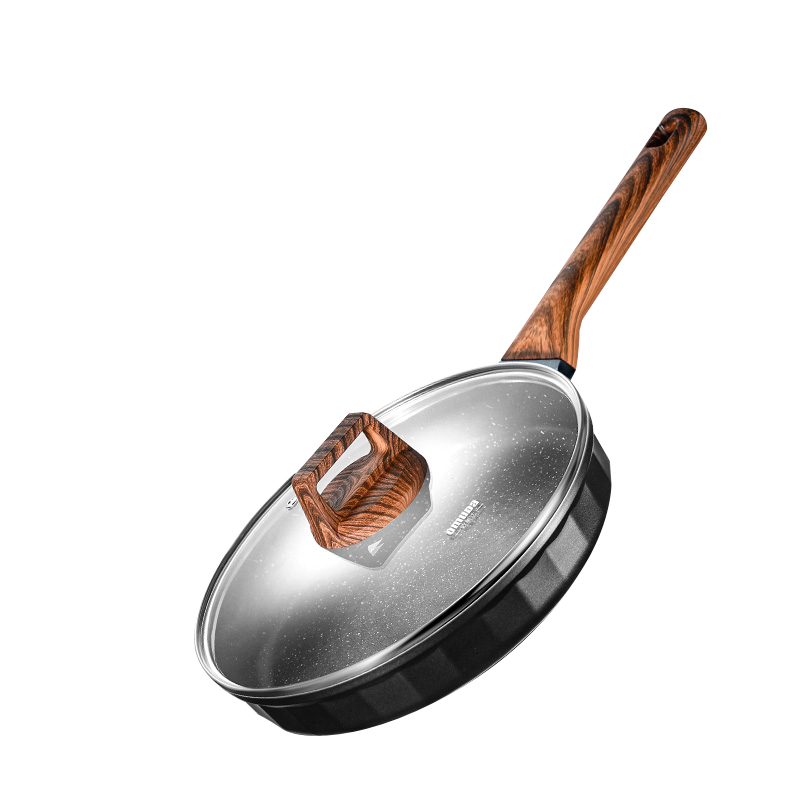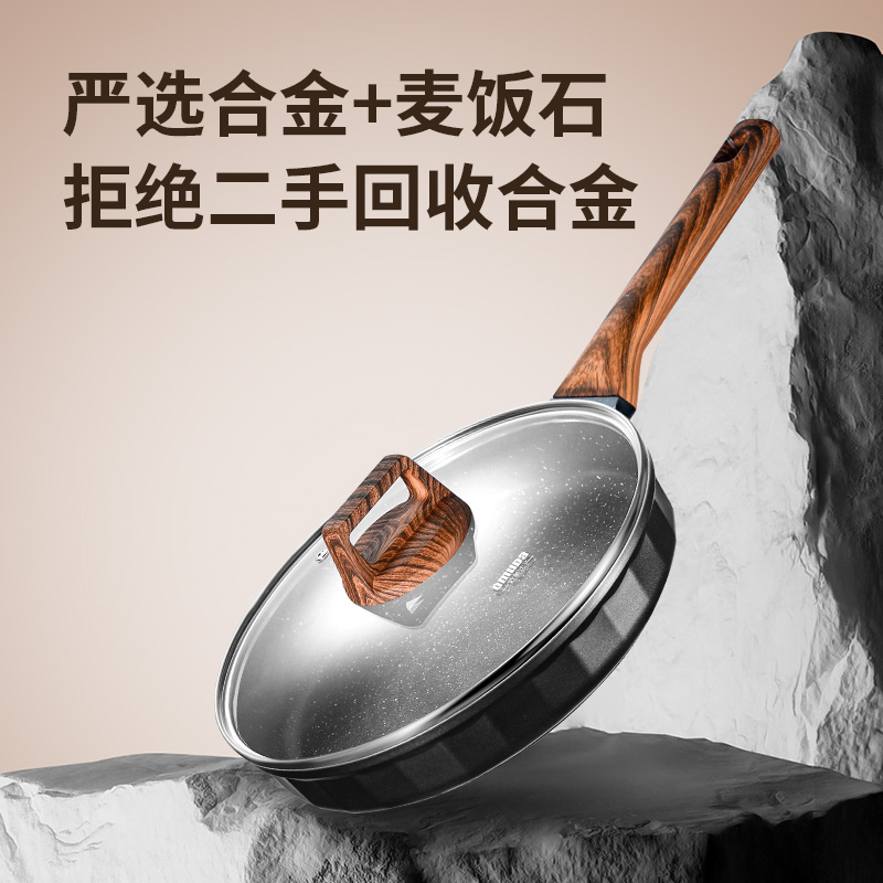 铝压铸 +食品级不粘复底 产品描述: ① 可煎可炒、随意翻炒 ② 一体压铸成型,坚固耐用,无铆钉设计易清洗, ③ 可视锅盖、防烫电木手柄、导流口设计,细节更彰显品质 ④ 兼容各种炉具,从煤气到电磁炉的热源都可以使用,锅底是浇铸不锈钢板,不会发生脱 落现象