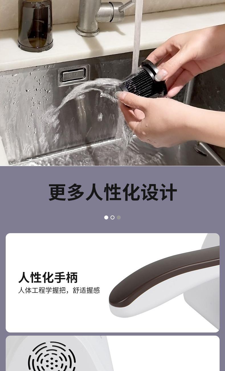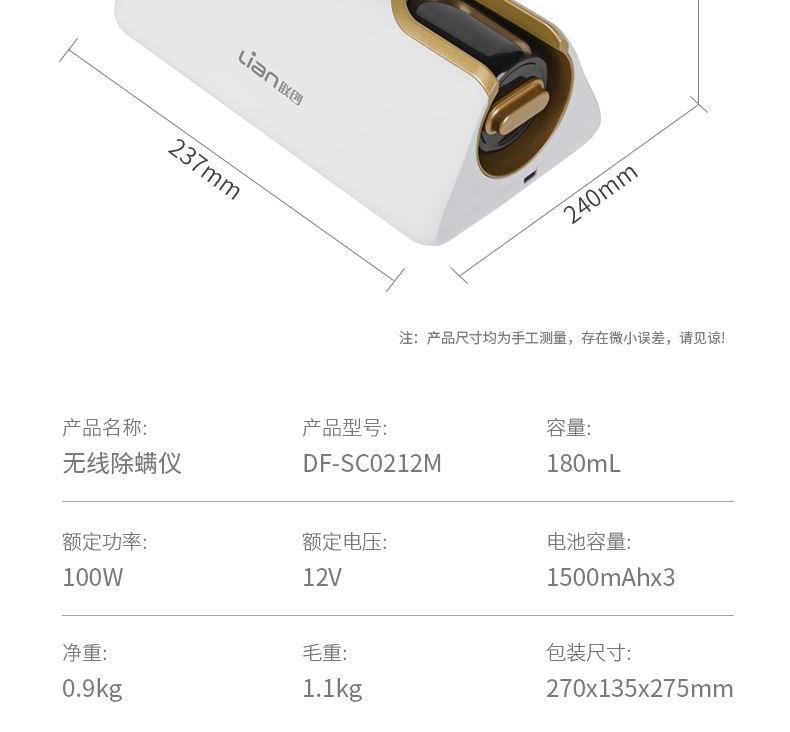 产品参数 工作电压:12V ⎓ 充电输入:5V ⎓ 2A 额定功率:100W 额定容量:180mL 产品净重:0.9kg 产品毛重:1.1kg 吸力:8000Pa 拍打次数:6000次/分 电池容量:1500mAh×3 充电时间:约3小时 包装尺寸:270x135x275mm 产品特点 1、无线束缚,随手吸附,操作更自由; 2、拍打振动,强劲吸力,随手可吸; 3、重复使用可水洗过滤海帕; 4、机身重量轻,小巧精致易收纳; 5、大容量续航 更持久更安全。