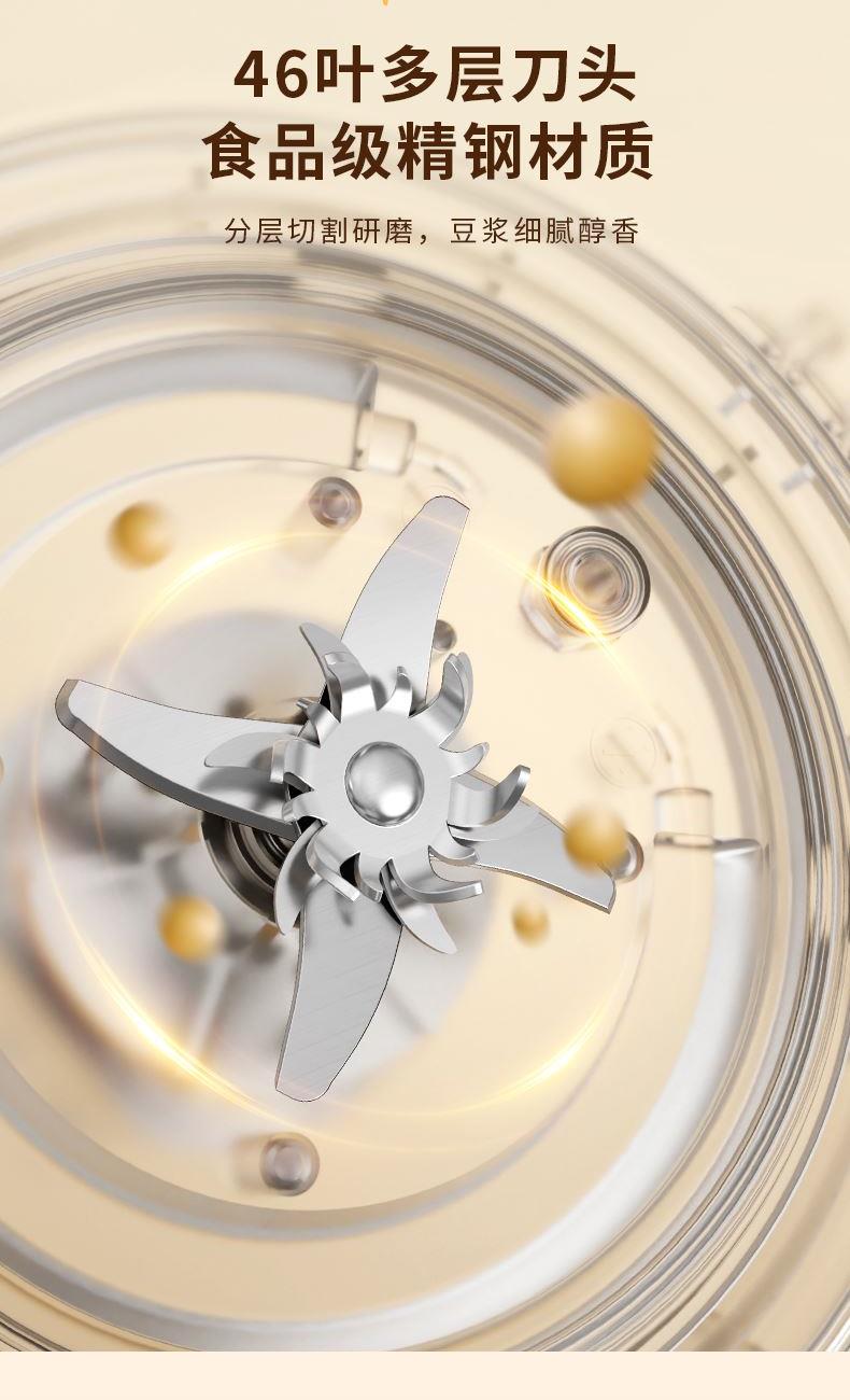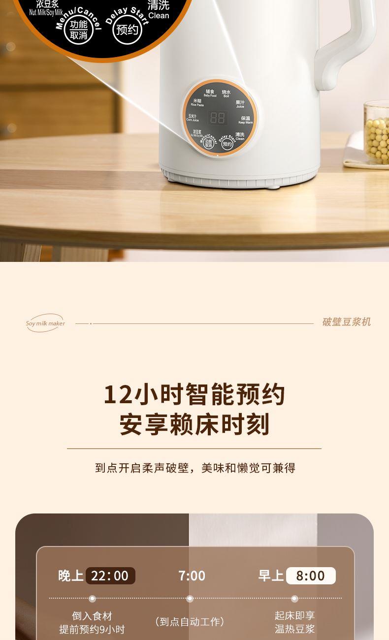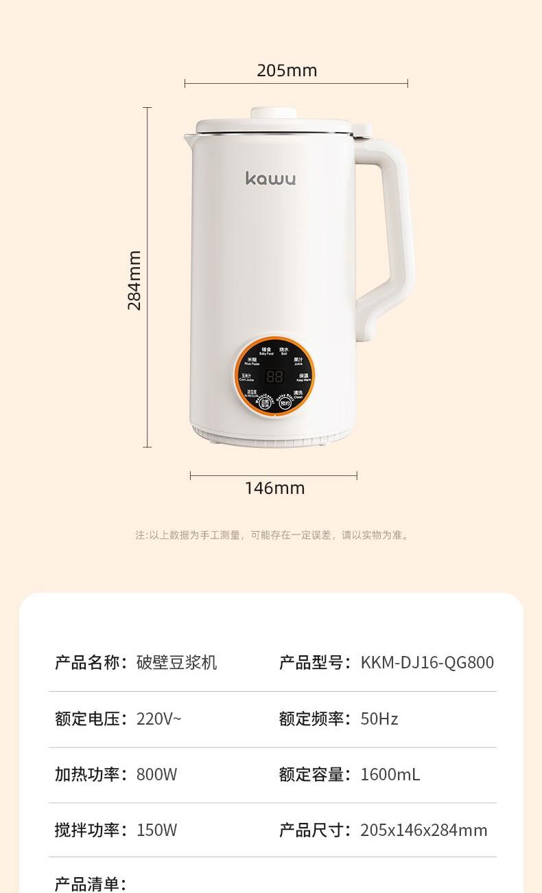 产品型号:KKM-DJ16-QG800 加热功率:800W 额定电源:220V~50Hz 产品尺寸:205x146x284mm 包装尺寸:200x2200x325mm 产品容量:1.6L 单台净重:1.3KG 单台毛重:1.7KG 1、46叶多层食品级精钢材质刀头,分层切割研磨,让豆浆更细腻香醇 2、12智能预约,1.6L大容量免泡豆免过滤,满足全家人的餐桌需求 3、智能显示大屏,触控灵敏清晰,8大智能菜系操作简单 4、一键自动清洗,底部设有散热孔,加长待机寿命