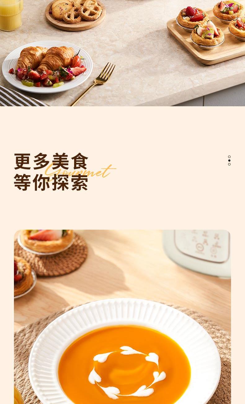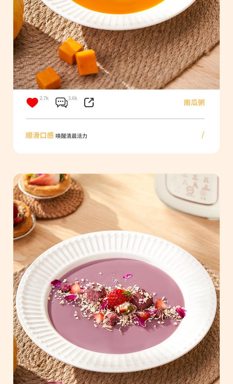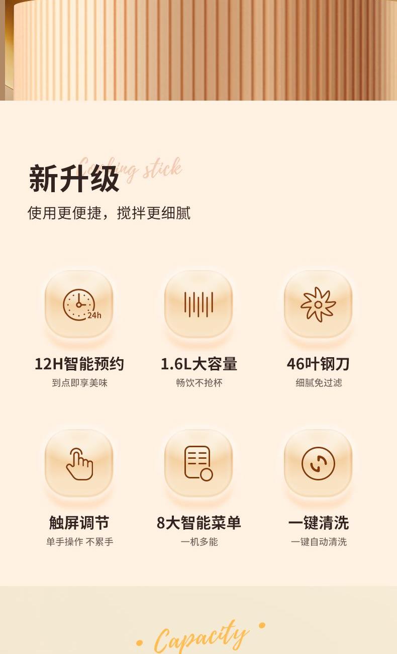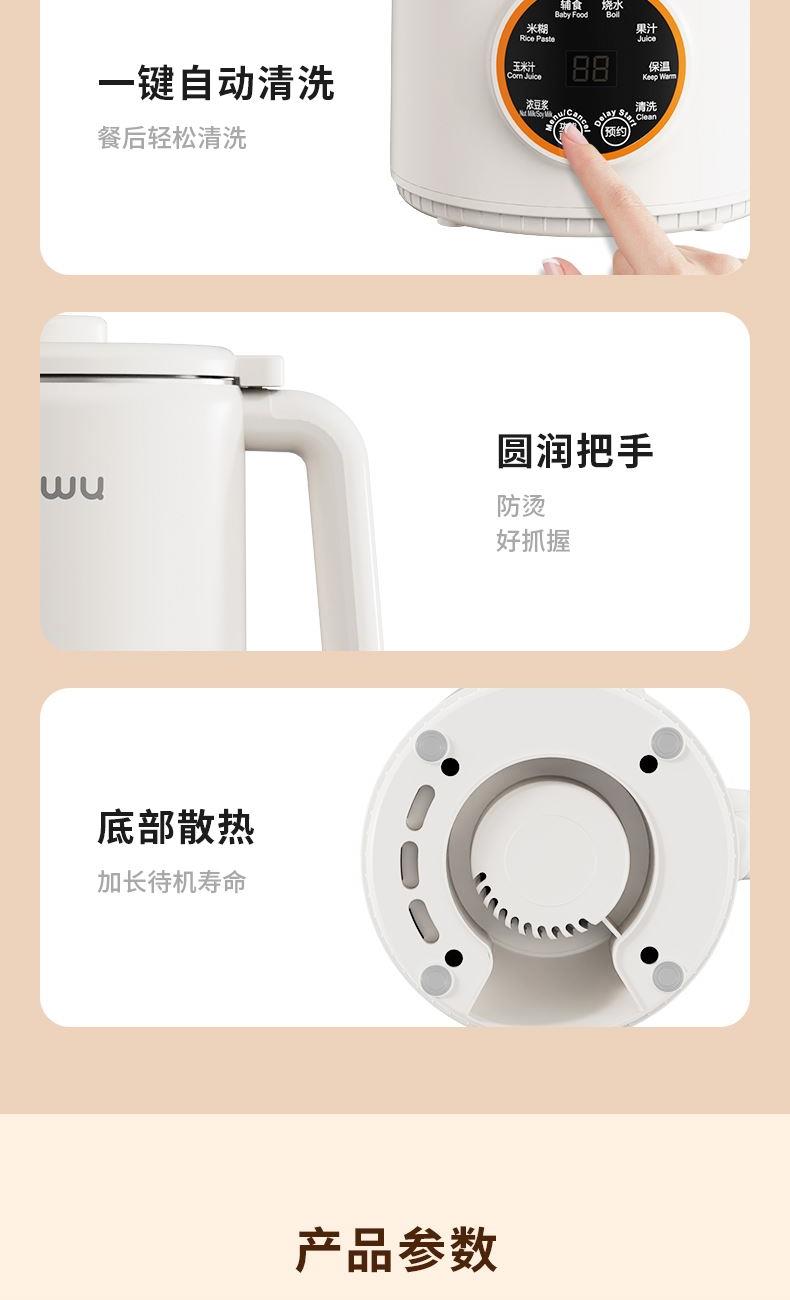 产品型号:KKM-DJ16-QG800 加热功率:800W 额定电源:220V~50Hz 产品尺寸:205x146x284mm 包装尺寸:200x2200x325mm 产品容量:1.6L 单台净重:1.3KG 单台毛重:1.7KG 1、46叶多层食品级精钢材质刀头,分层切割研磨,让豆浆更细腻香醇 2、12智能预约,1.6L大容量免泡豆免过滤,满足全家人的餐桌需求 3、智能显示大屏,触控灵敏清晰,8大智能菜系操作简单 4、一键自动清洗,底部设有散热孔,加长待机寿命