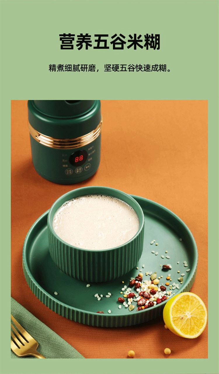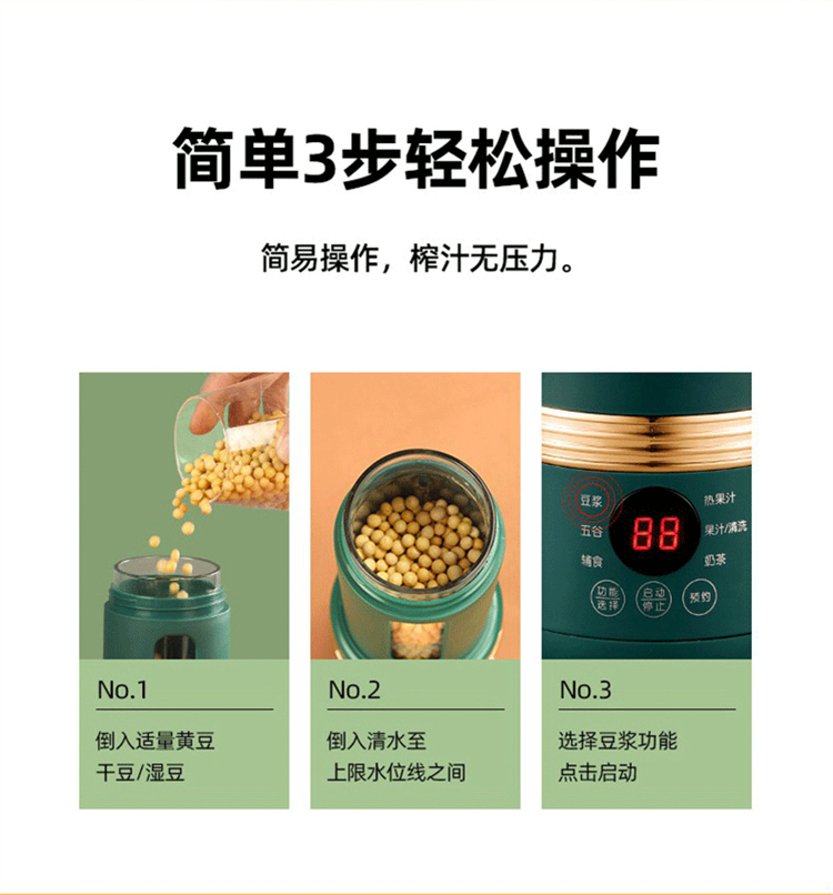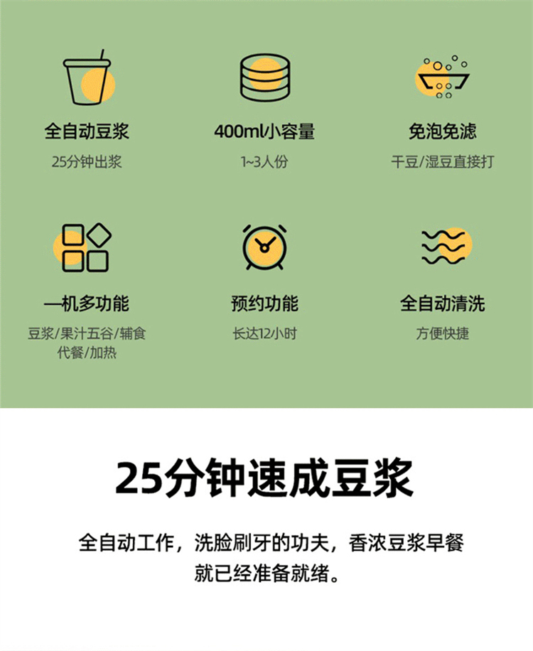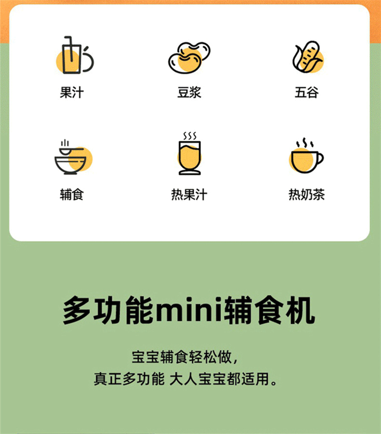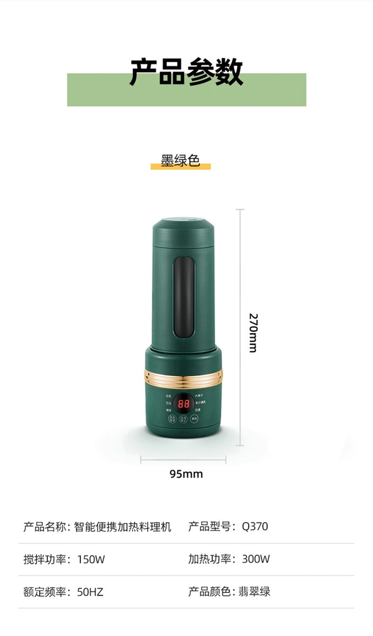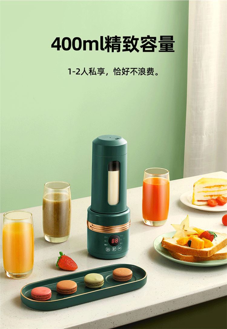 搅拌功率:150W 额定频率:50HZ 加热功率:300W 🌟 全龄适配·真正多功能 大人宝宝双向兼容,既是宝宝专属辅食机,也能满足全家日常需求,一台搞定辅食、豆浆、果汁等多种料理,性价比拉满。 ⚡ 高效省时·全自动免看管 25分钟速成豆浆,免泡豆直打无需提前准备,洗脸刷牙的功夫就能做好营养早餐;12小时智能预约功能,睡前设定,晨起直接享用,简化时间成本。 破壁口感·冷热双用更贴心 旋风六页精钢刀片+多段曲线智能熬煮,研磨充分破壁无渣,口感丝滑细腻;冷热两用设计,冬天可加热至45℃暖胃不烫口,夏天鲜榨冰饮,四季适配。 低耗轻音·场景无限制 低功率设计,宿舍使用不跳闸,节能又安全;轻音运行噪音小,工作时不打扰宝宝睡眠、家人休息,居家、宿舍都适用。 ✨ 小巧便捷·清洁无忧 400ml容量,适配1-2人私享,迷你小型易收纳、方便携带;可拆卸部件一冲即净,搭配液晶显示屏、防溢杯口、底层散热、防尘插口,细节拉满更省心。