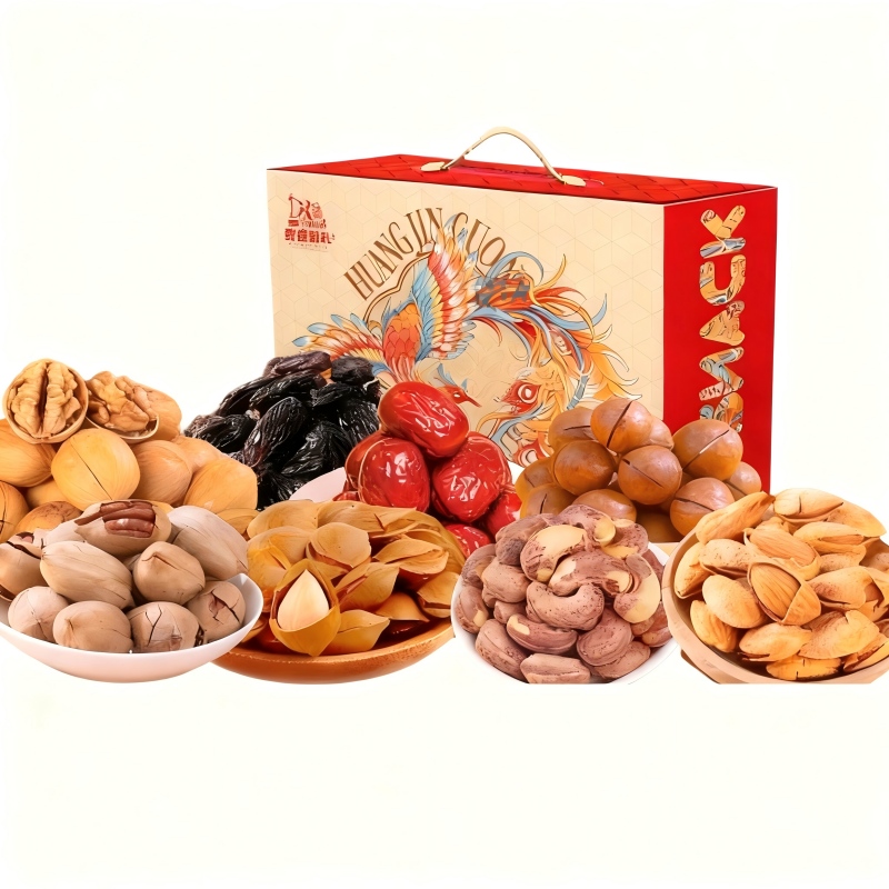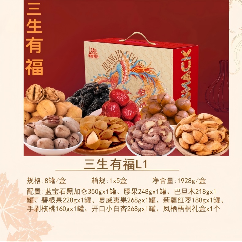 全球甄选,品质好果健康好味,心随礼至 1928g/盒;1x5盒 蓝宝石黑加仑350g*1罐 腰果248g*1罐 巴旦木218g*1罐 碧根果228g*1罐 夏威夷果268g*1罐 新疆红枣188g*1罐 手剥核桃160g*1罐 开口小白杏268g*1罐 凤栖梧桐礼盒x1个