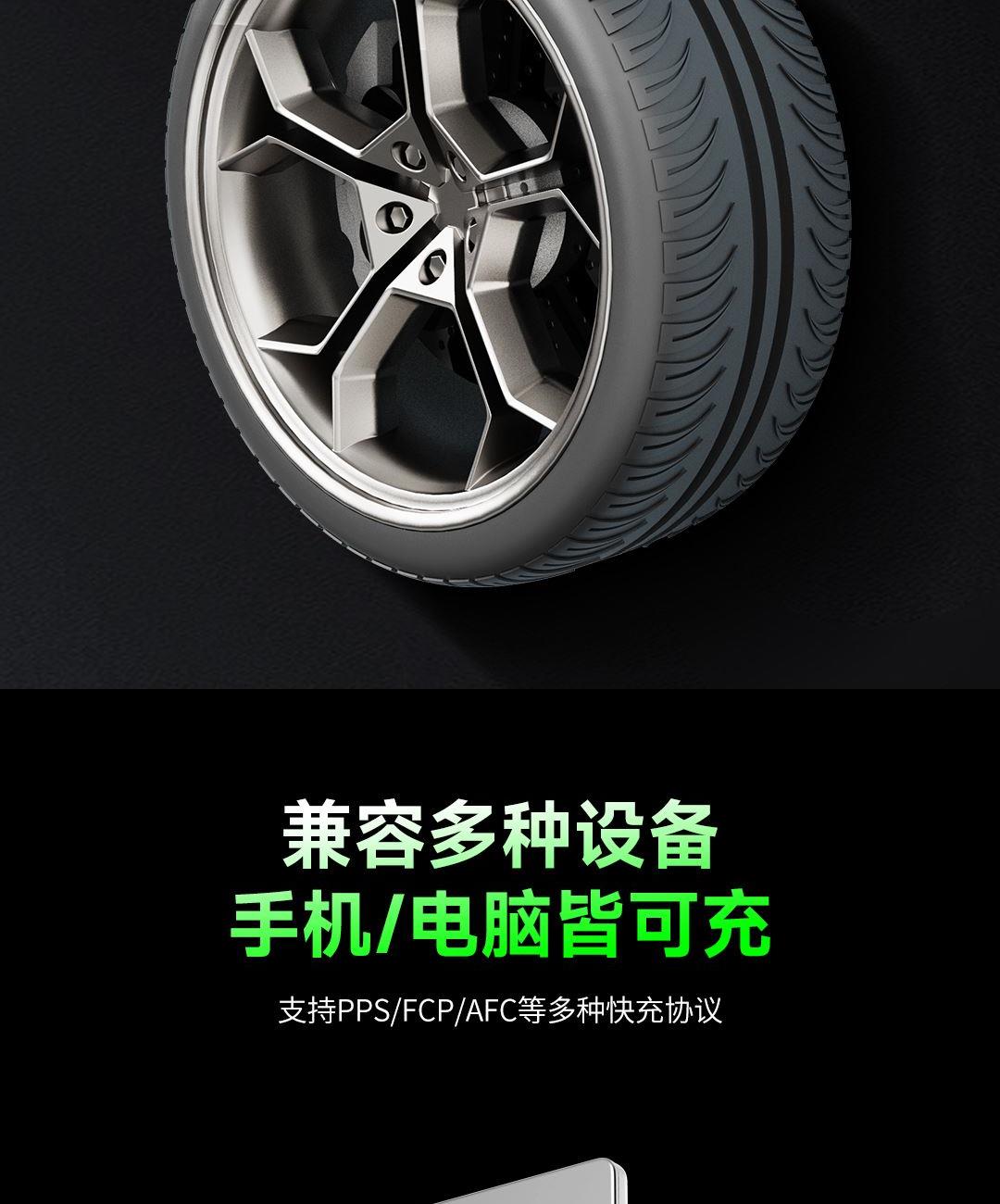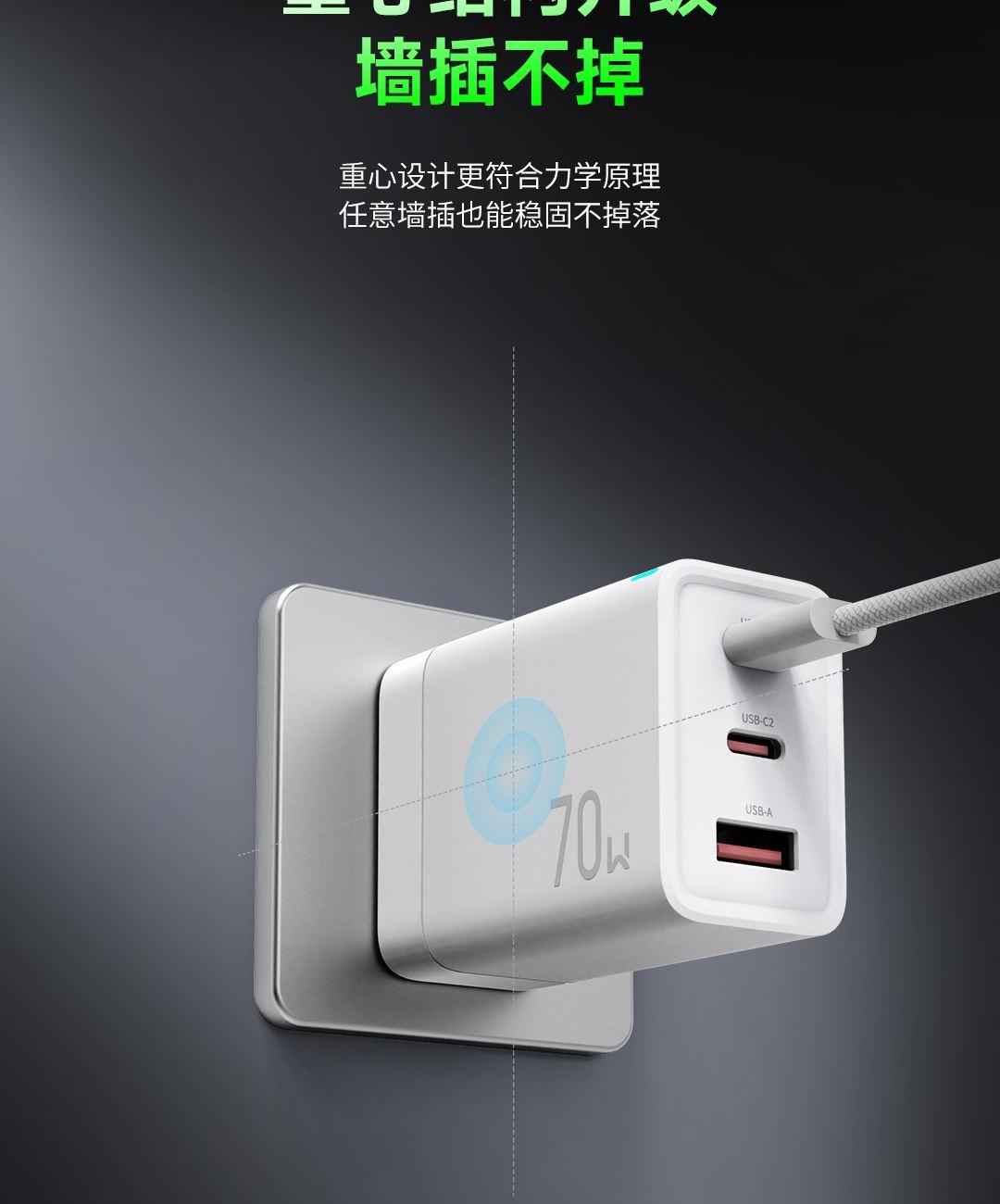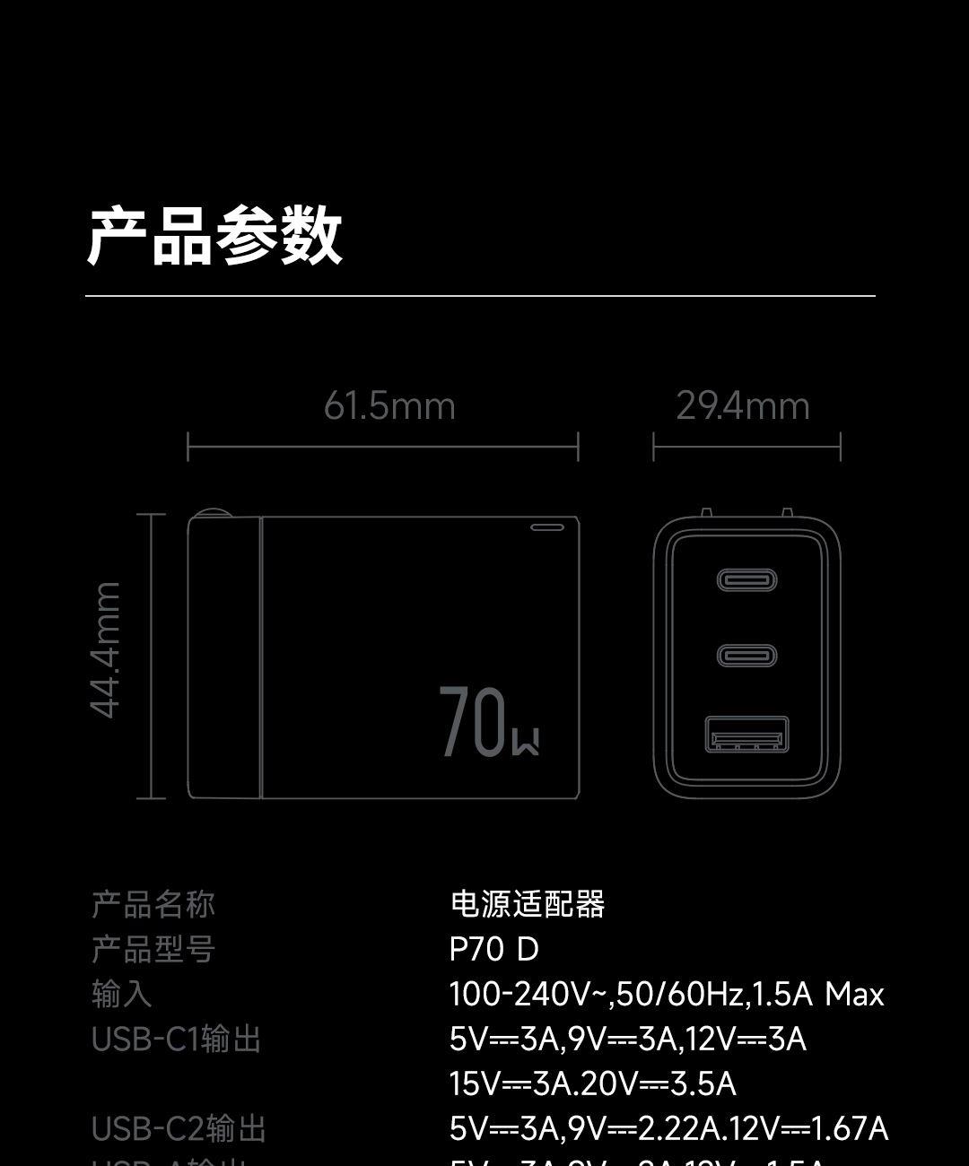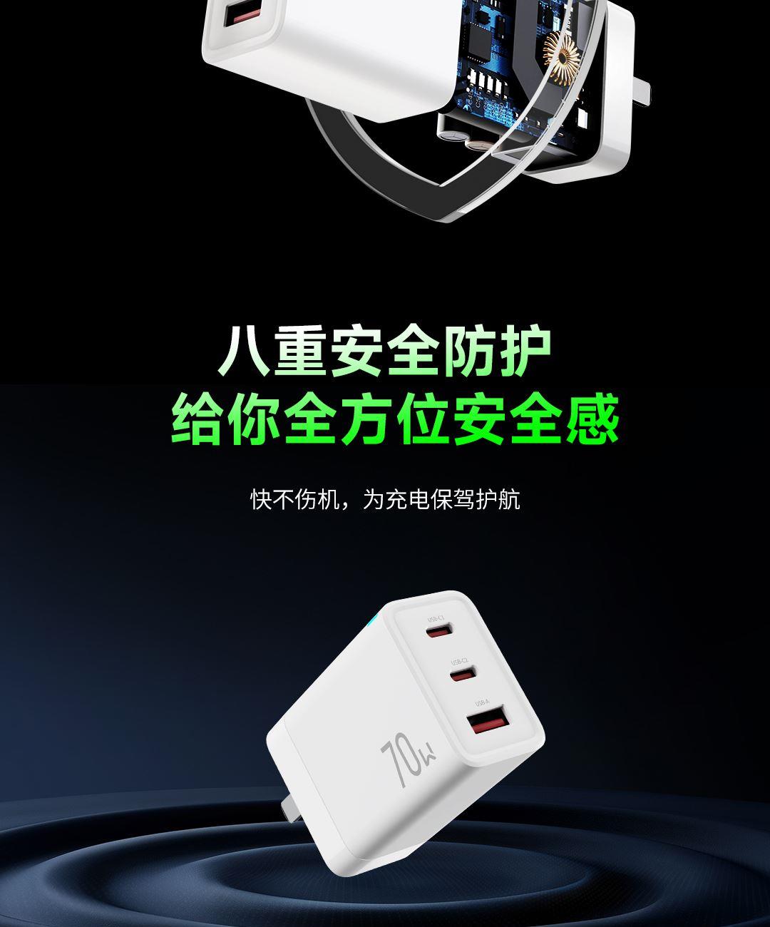 采用航天领域新型半导体材料GaN(氮化镓),使芯片集成度和能量转化率更高,体积更小,效率更高,发热更低. 可折叠插脚,便携70W飚速快充+PD60W数据线 USB-C1独立使用PD70W大功率输出,SUB-C2独立工作时支持20W输出,可供笔记本电脑快速充电; 2C口+1A口输出,可同时支持3台设备充电。智能调整输出电压及电流! 外壳采用V0级防火阻燃材质,耐磨耐用。3C安全认证,使用更安全. 输入:100-240V~,50/60HZ,1.5A 输出:5V=3A,9V=3A,12V=3A,15V=3A,20V=3.5A 产品尺寸:61.5*44.4*29.4mm 产品重量:约108g