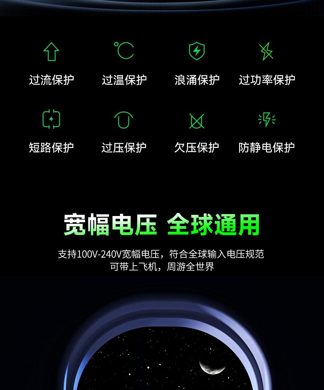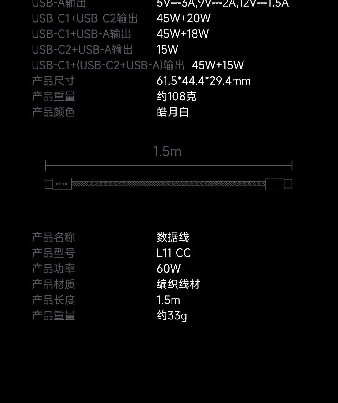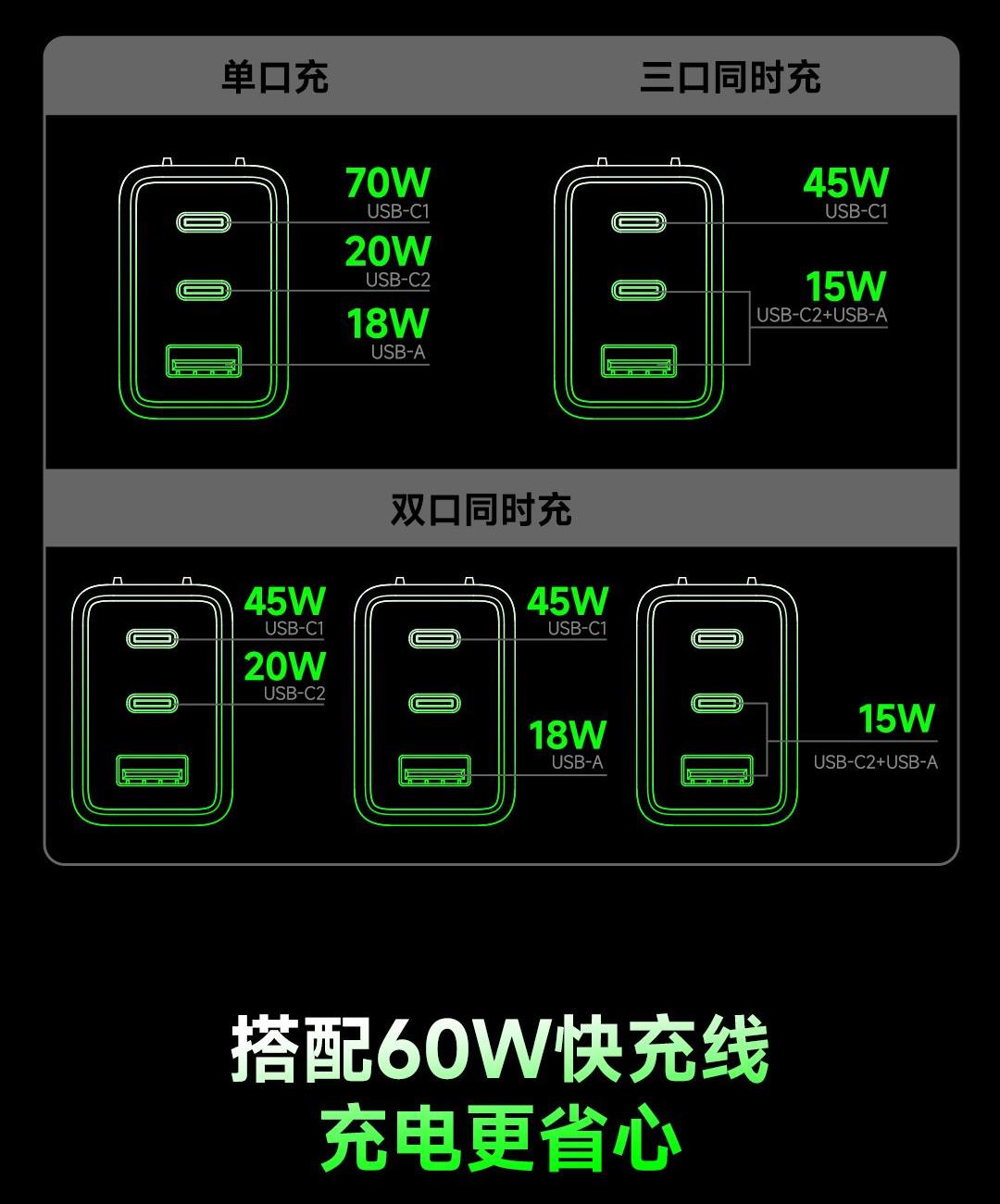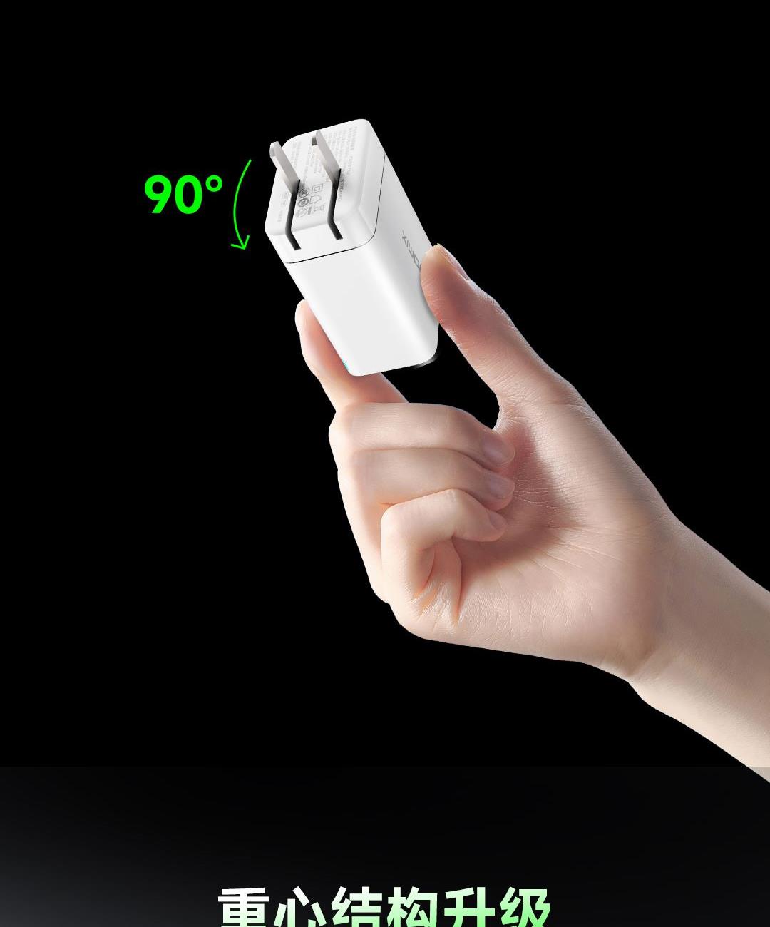 采用航天领域新型半导体材料GaN(氮化镓),使芯片集成度和能量转化率更高,体积更小,效率更高,发热更低. 可折叠插脚,便携70W飚速快充+PD60W数据线 USB-C1独立使用PD70W大功率输出,SUB-C2独立工作时支持20W输出,可供笔记本电脑快速充电; 2C口+1A口输出,可同时支持3台设备充电。智能调整输出电压及电流! 外壳采用V0级防火阻燃材质,耐磨耐用。3C安全认证,使用更安全. 输入:100-240V~,50/60HZ,1.5A 输出:5V=3A,9V=3A,12V=3A,15V=3A,20V=3.5A 产品尺寸:61.5*44.4*29.4mm 产品重量:约108g