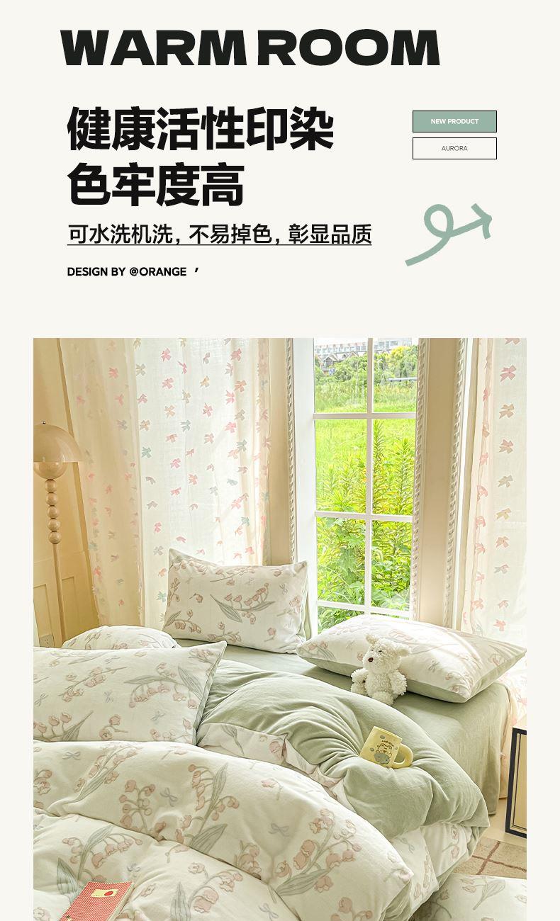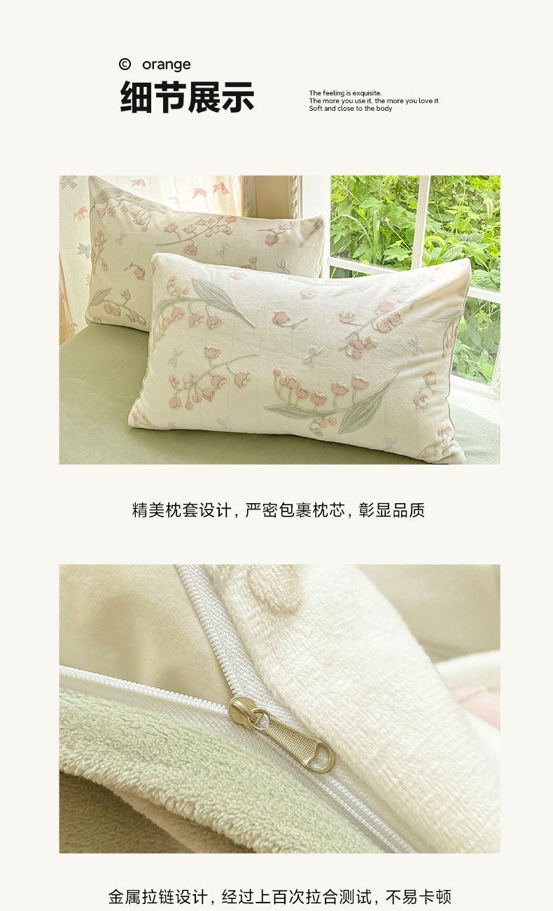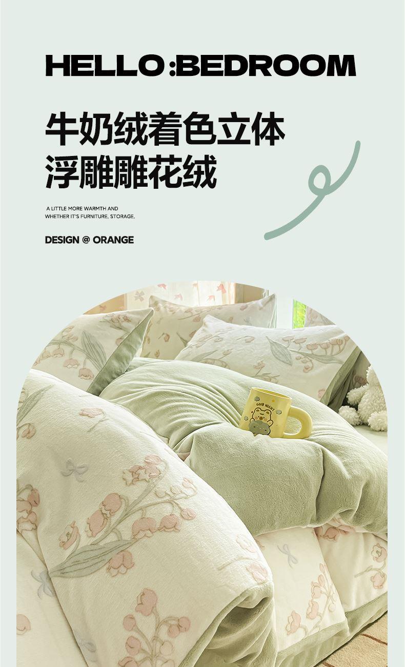 被套:200×230cm 床单:245×250cm 枕套:48×74cm 适用:1.5M-1.8M床 面料:牛奶绒(抗静电) 风格 : 简欧风格 套件采用高克重雕花绒面料,24H保暖呵护整夜温暖,柔软细腻,贴肤保暖,面料植入导电丝,免去静电烦恼,温暖整个冬季。