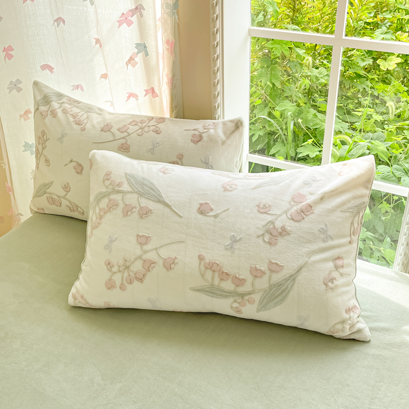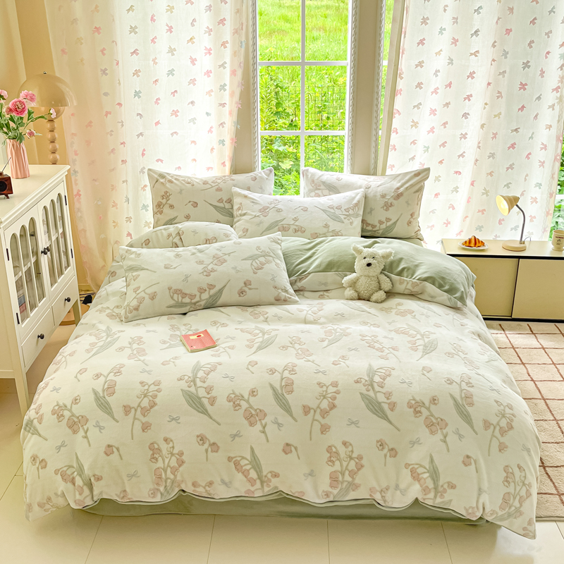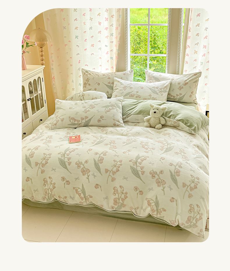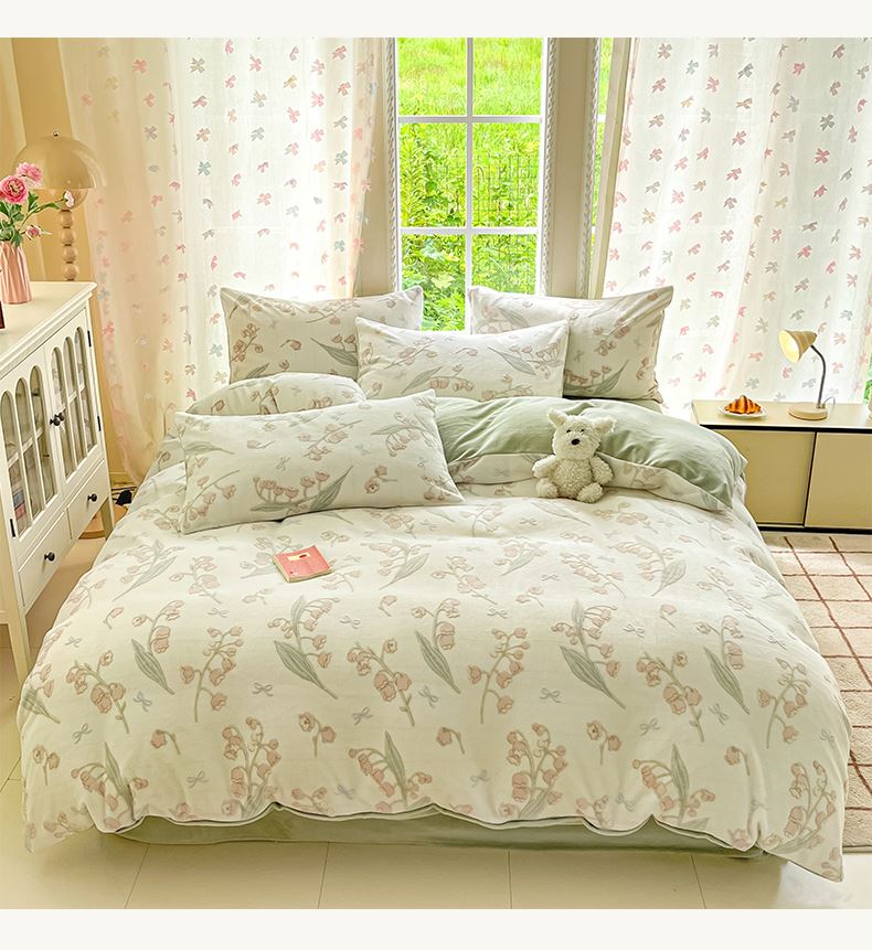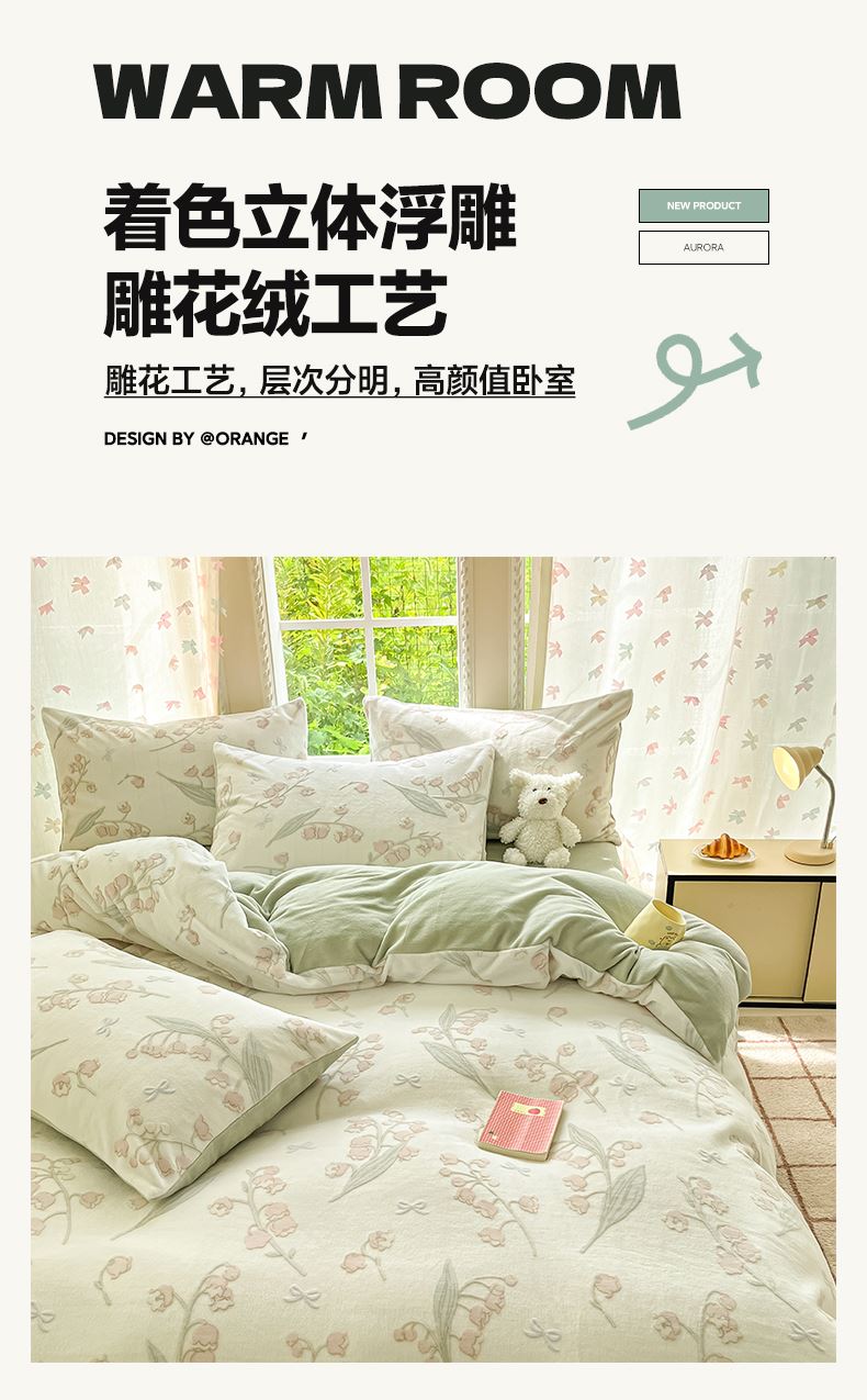 被套:200×230cm 床单:245×250cm 枕套:48×74cm 适用:1.5M-1.8M床 面料:牛奶绒(抗静电) 风格 : 简欧风格 套件采用高克重雕花绒面料,24H保暖呵护整夜温暖,柔软细腻,贴肤保暖,面料植入导电丝,免去静电烦恼,温暖整个冬季。