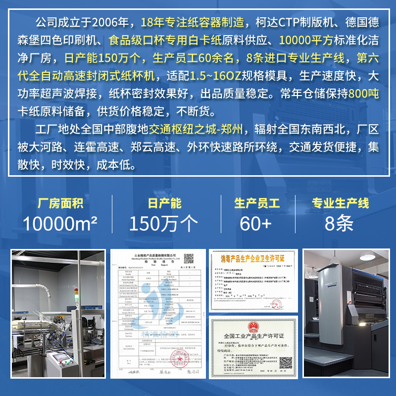 产品尺寸:上口径80mm下口径57mm高度95mm 内纸克重:300g 外纸:300g 外箱尺寸:64*50*65cm 主要成分:原生木浆 执行标准:GBT20808 卫生标准:GB15979 卫生许可证:(豫)卫消证字(2024)第0063号 产品等级:合格