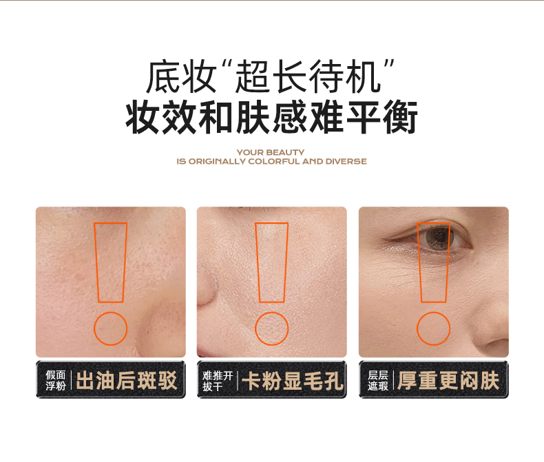 1、持妆PRO——长效贴肤更持妆,日落妆不落 水凝柔纱科技(三乙氧基辛基硅氧烷处理亲水气流粉体)亲水气流粉体经过柔纱,外衣处理,为肌肤带来水润感,上脸贴牢肌肤,柔软亲肤,底妆舒爽不掉线,妆随容动,透气不闷痘,保证肌肤呼吸 2、养肤PRO——保湿修护抗蓝光,贴妆更养肤 多重保湿、双重修护、抗蓝光,守护肌肤,底妆水润轻透不浮“燥” 护肤级保湿精粹9重玻尿酸、银耳子提取物、椰子果提取物、依克多因)——多重保湿成分,保湿不拔干,柔润不卡纹 双重活性修护精萃酵母发酵滤液、深海蓝藻蛋白——保持肌肤弹润,修护肌肤,有效抗老 聚繖岩蔷薇——抵御蓝光,强韧肌底,上妆不刺激,保持底妆鲜活亮泽 3、抗氧PRO——多重抗氧更透亮,天黑妆不黑 双重抗氧成分,虾青素、麦角硫因——避免底妆氧化暗沉,长时间带妆也不易暗沉发黄,深入肌底焕亮肌肤,呵护底妆不暗沉 4、轻透PRO——自然轻薄更亲肤,透气不闷痘 MOVING FILM动态透气盾(柔软树脂膜)——超柔软、耐摩擦、更透气,轻透服帖,如动态保护盾一般,根据肌肤动态调整自身状态,保持底妆舒爽不掉线,时刻守护底妆妆态。