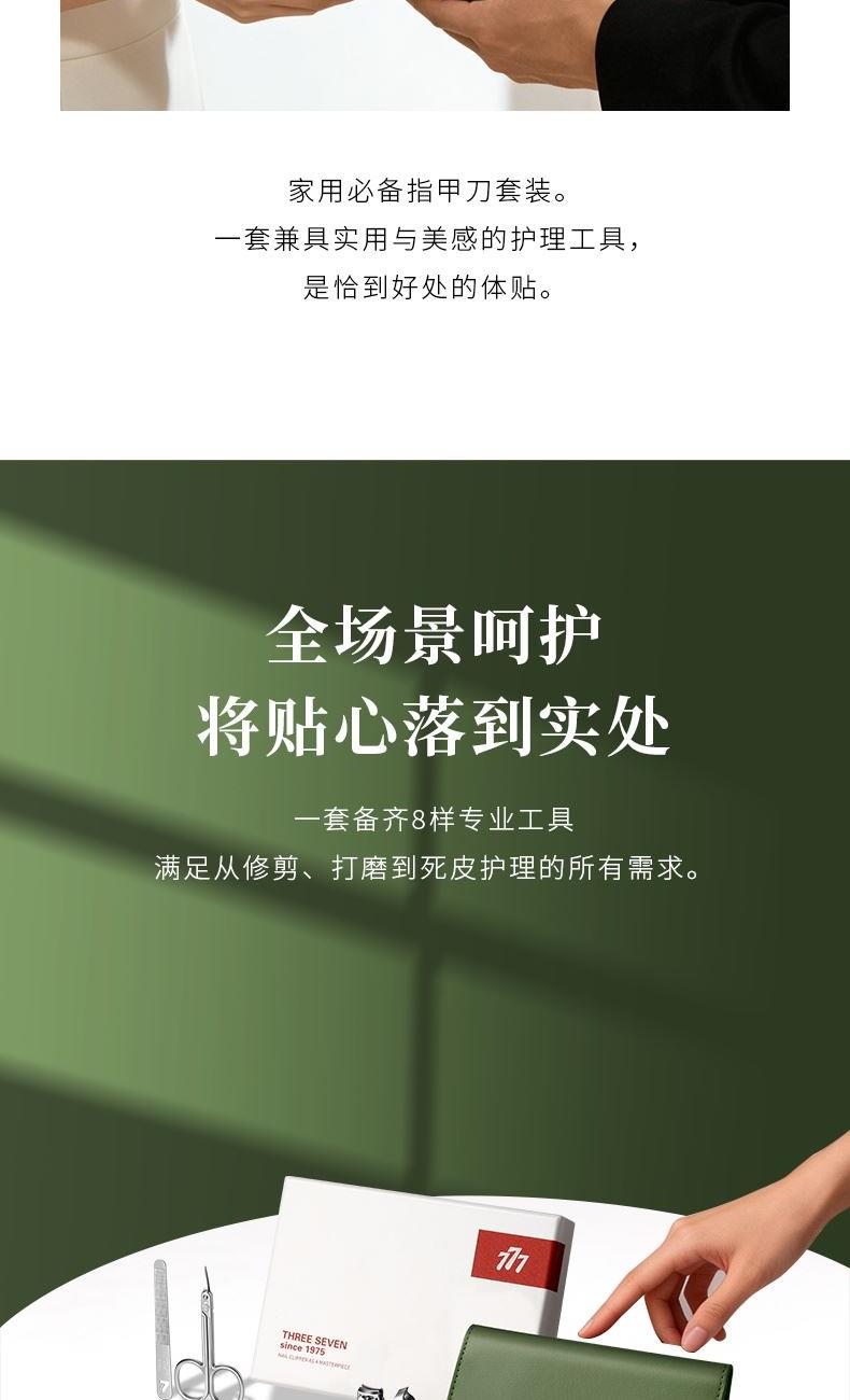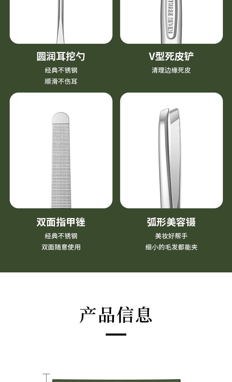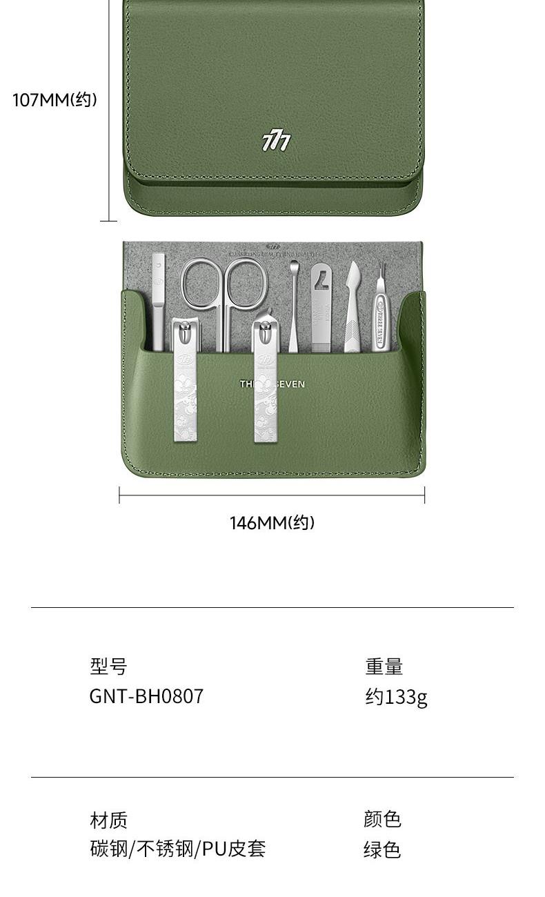 品 牌:THREE SEVEN/777 材 质:优质碳钢+PU皮套 规 格:106*142mm 产品颜色:绿色 套装内容:8件套(眉夹、中号平口指甲刀、中号斜口指甲刀、眉剪、耳挖、锉片、死皮推、死皮铲)