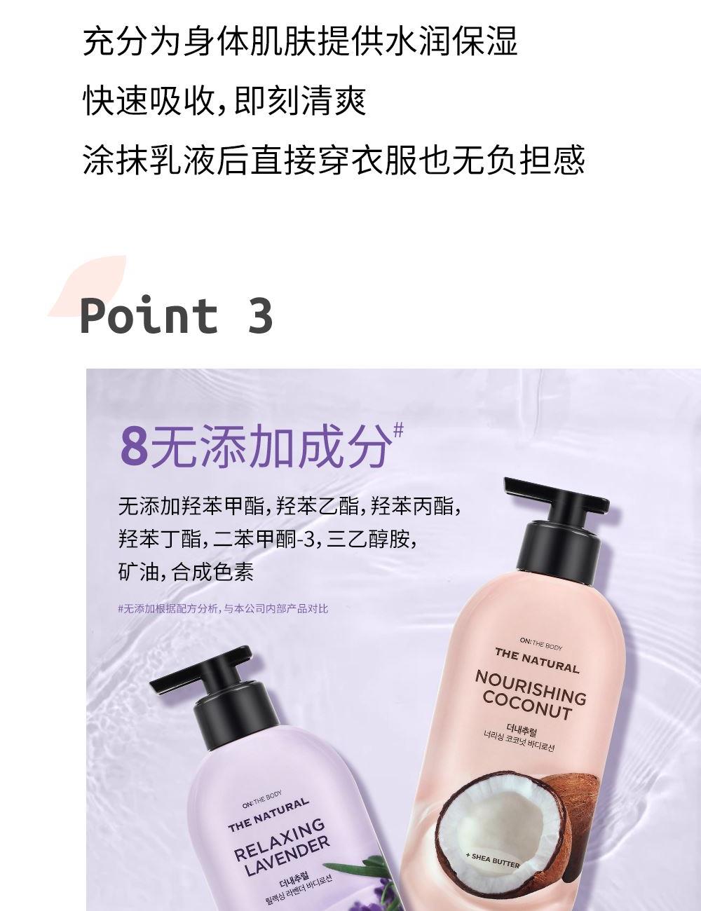 润体乳:韩国进口,蕴含植物油成分:油橄榄果油+椰子油,不黏腻的,快速被肌肤吸收的水润感。沐浴露:香水级香氛,产品功效:清洁皮肤,滋润美肌,留香更长,植物精油成分,细致渗透力,肌肤易吸收,打造润泽美肌。