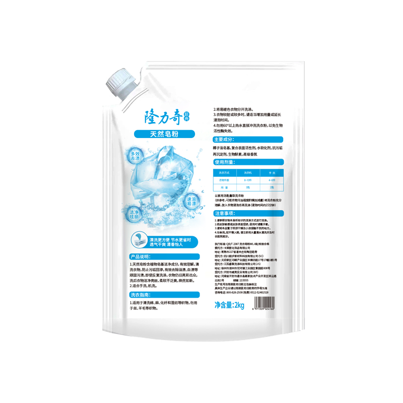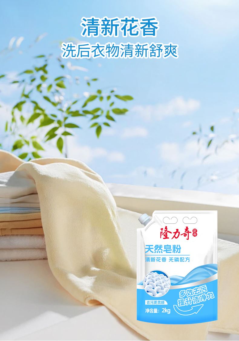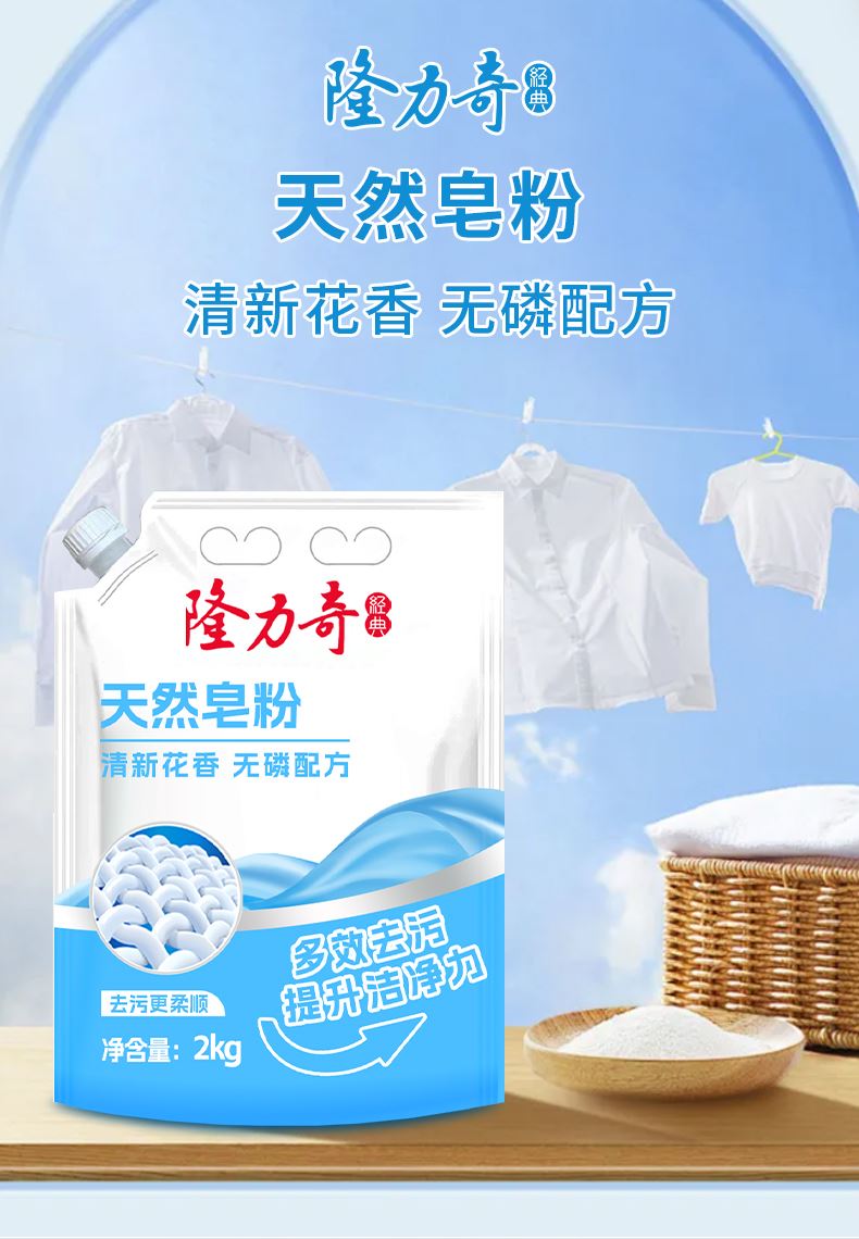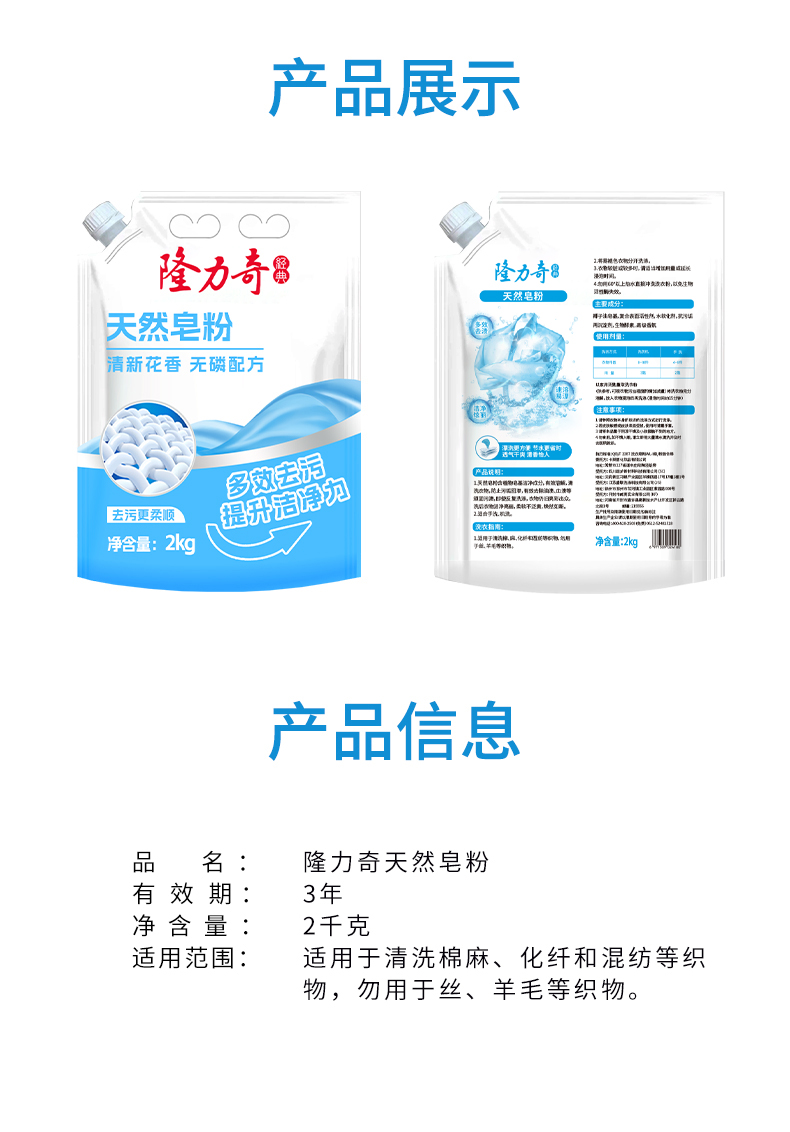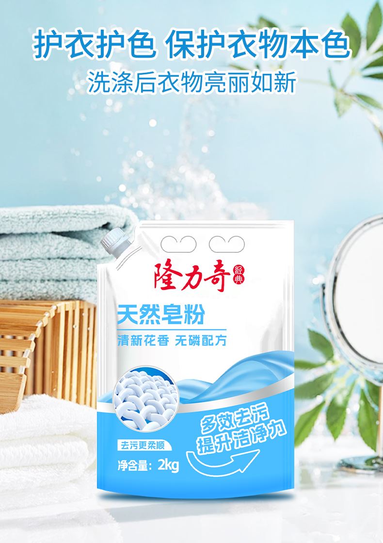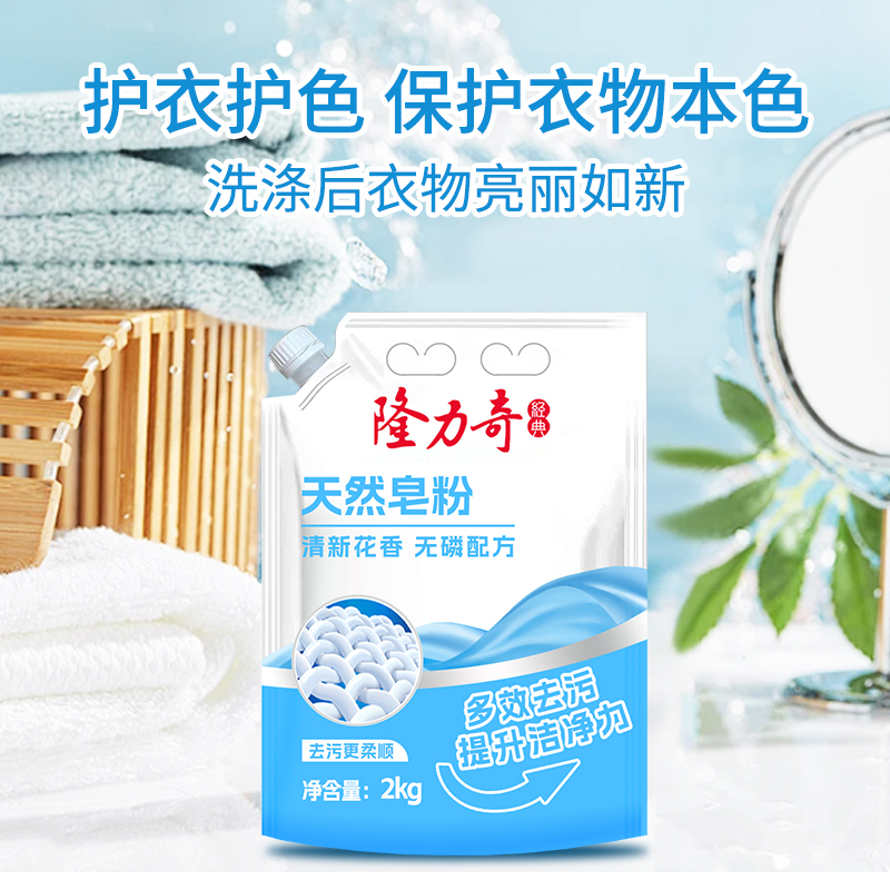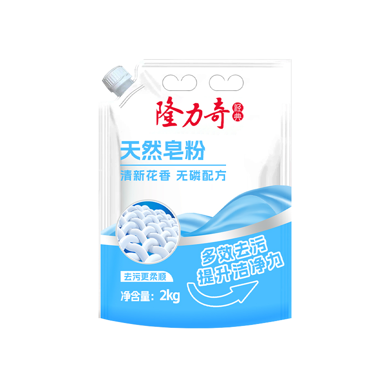 隆力奇天然皂粉2kg 货号:LLQ-8040100030 重量:2kg 保质期:三年 适用于清洗棉麻、化纤和混纺等织物,勿用于丝、羊毛等织物 成分:(中性配方)不添加磷、不添加氟、不添加荧光剂、不添加色素 功效:去异味、去霉味、去渍、护色等 产品卖点: 1.天然植物配方,温和无刺激,手洗机洗都适用; 2.高效去污护色,深层清洁不伤衣物,持久留香; 3.低泡易漂省水,环保节能,快速溶解无残留