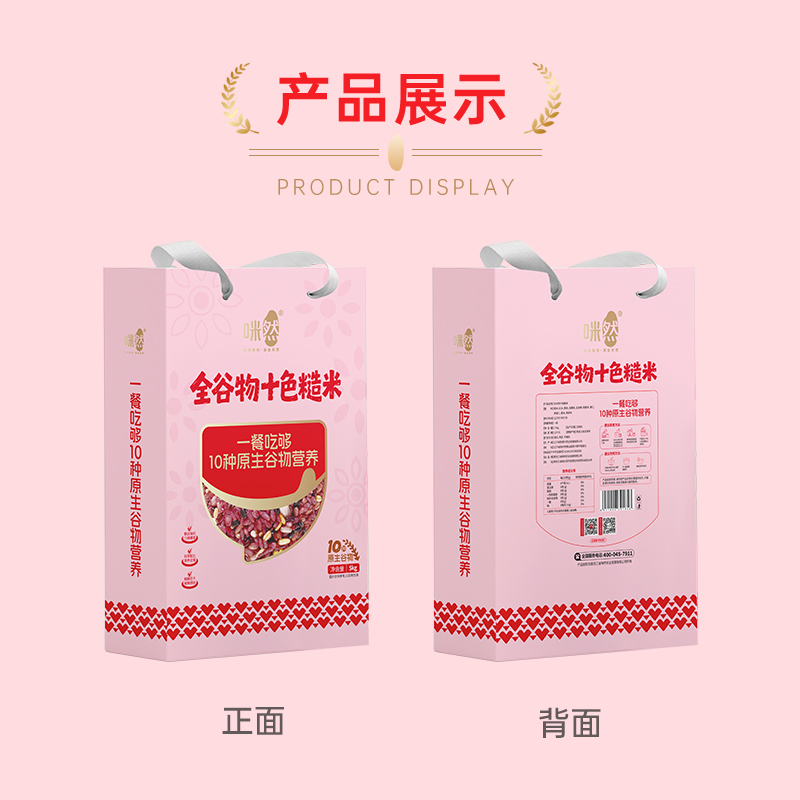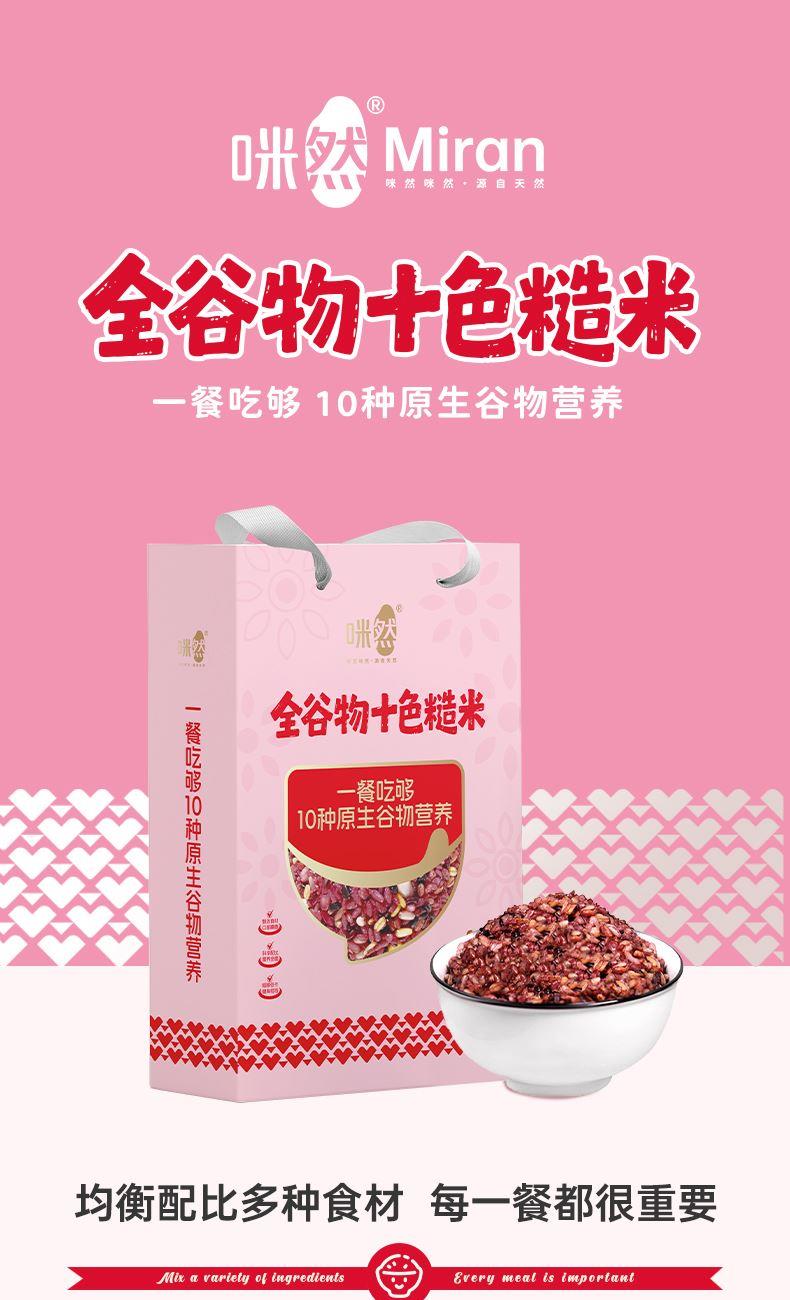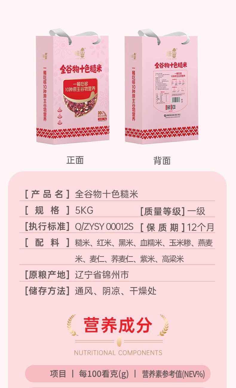 产 品 :咪然全谷物十色糙米5kg 执行标准 : Q/ZYSY 00012S 保 质 期 :6个月 产 地 : 辽宁省锦州市 箱 规 :8*2.5 内配:糙米、红米、黑米、血糯米、玉米糁、燕麦米、麦仁、荞麦仁、紫米、高梁米