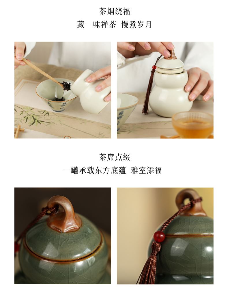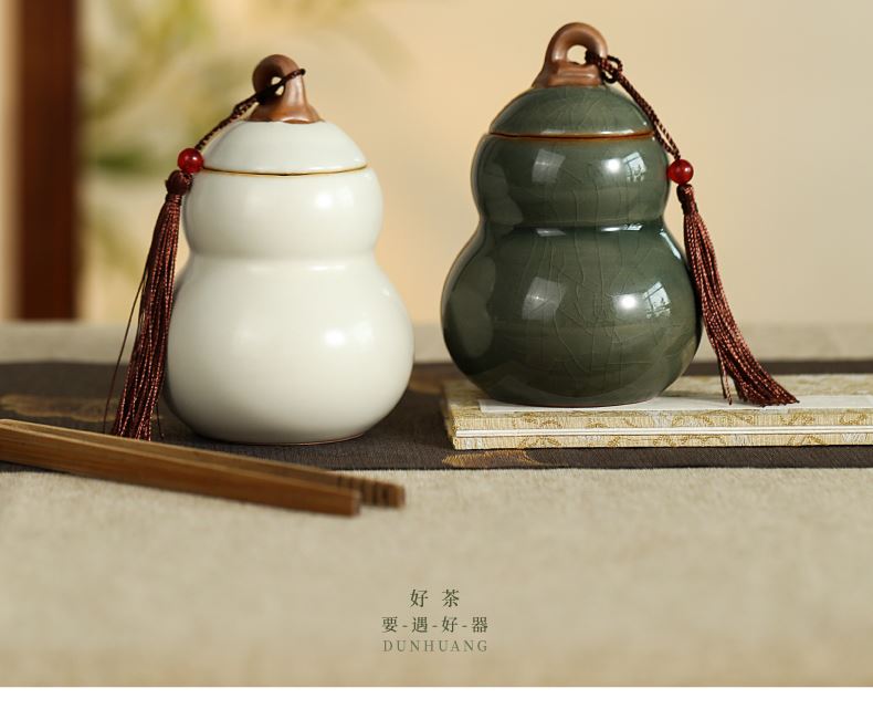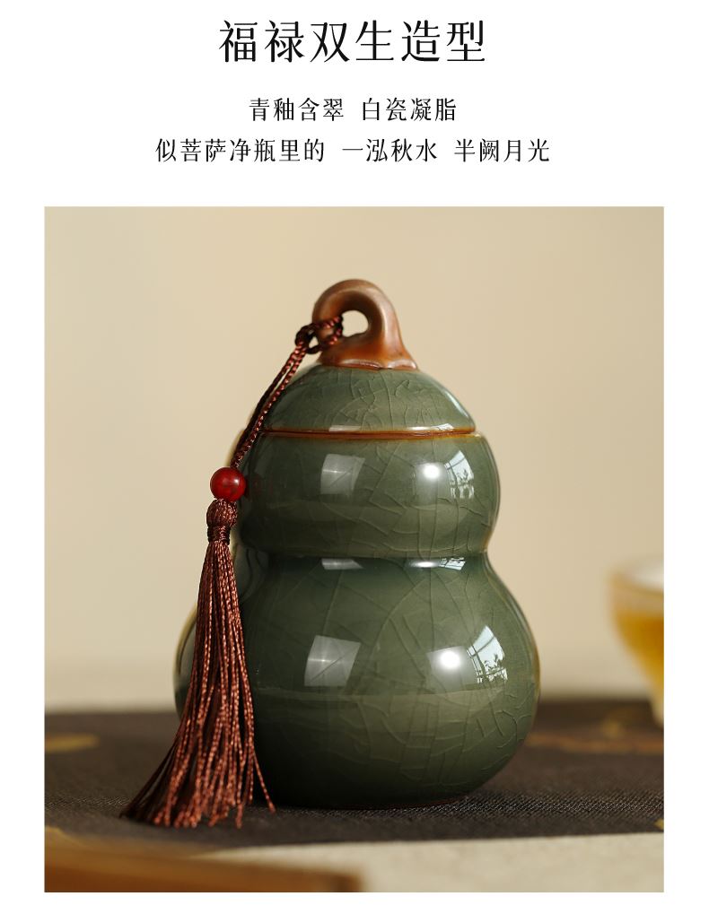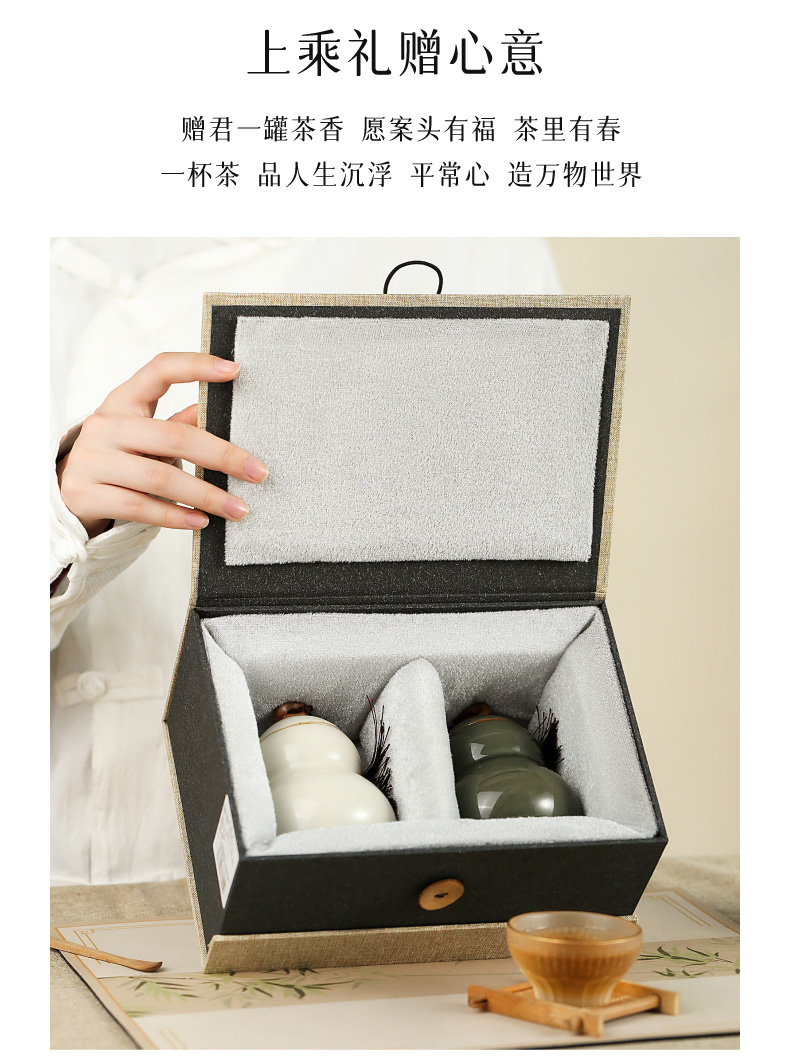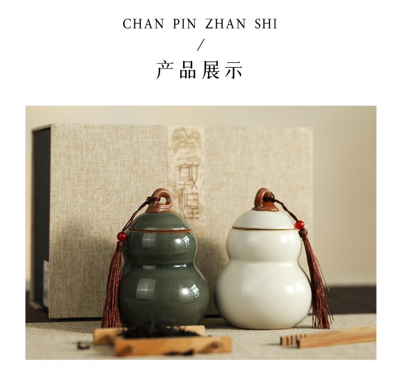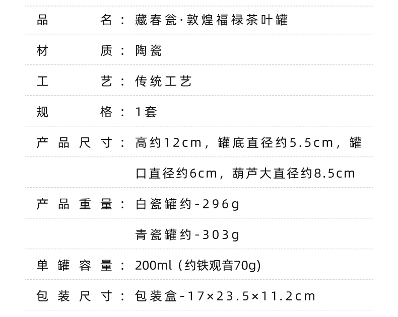 材质:陶瓷 工艺:传统工艺 规格:1套 产品重量:白瓷罐约-296g,青瓷罐约-303g 单罐容量:200ml(约铁观音70g) 包装尺寸:包装盒-17x23.5x11.2cm