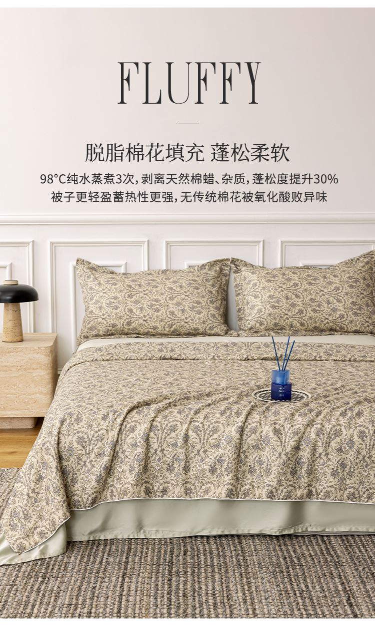 商品参数: 面料:100棉 填充:100棉(脱脂棉花) 填充克重: 320g 规格:150*200cm(200*230可订制)